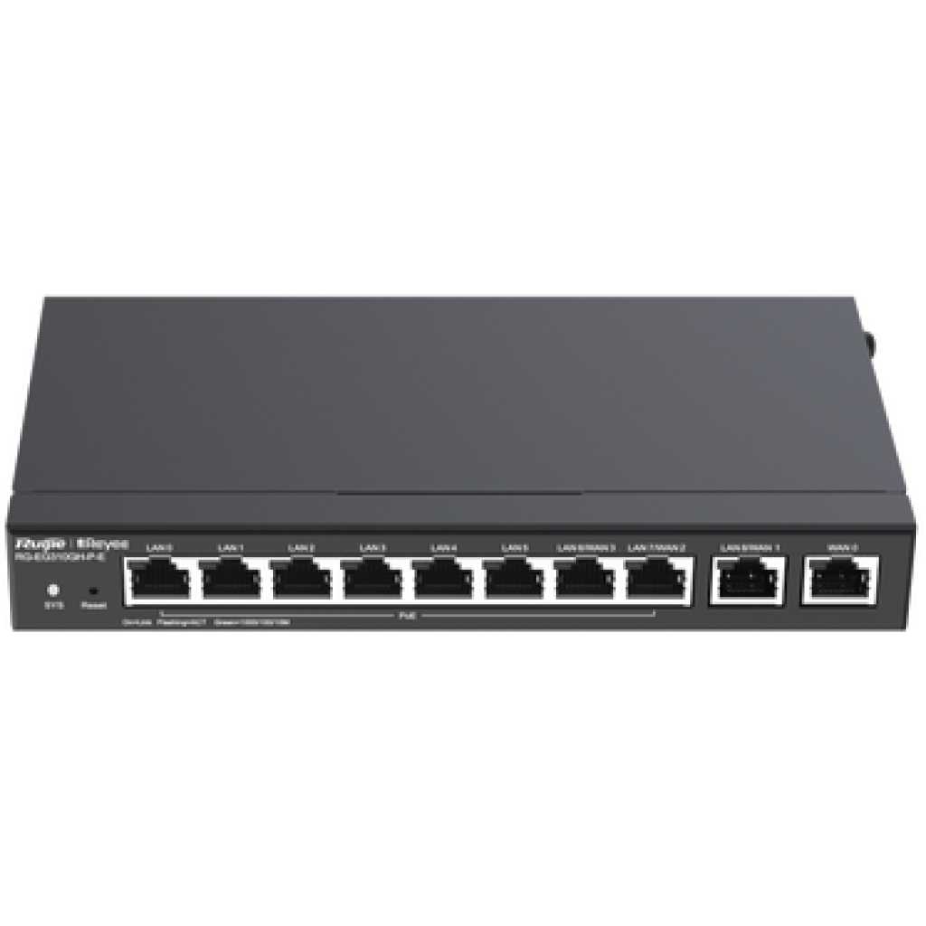 RG-EG310GH-P-E Desktop 10-port Full Gigabit Router,1.5 Gbps Throughput, High-Performance VPN Router, Powerful VPN For Branches And Remote Employees, Traffic Visualization And Monitoring, Efficient Bandwidth Management, Multi-WAN, Intelligent Load Balancing The RG-EG310GH-P-E is a high-performance, cloud-managed, 10-port Gigabit PoE router from Reyee, according to Reyee’s website. It’s designed for small to medium-sized businesses and high-demand networking environments, offering features like advanced security, multi-Gigabit connectivity, and Power over Ethernet (PoE) support . High-Performance Connectivity: Stay connected with Reyee Routers, a selection of high-performance and reliable routers designed for home and business. The RG-EG310GH-P-E model provides an array of features to meet any need. Offering robust connectivity, the router features intelligent load balancing, link redundancy between multiple WAN ports and advanced security protocols. Advanced Features for Maximum Performance: Reyee Routers are used to ensure reliable, safe and high-performance networks. The RG-EG310GH-P-E model features powerful dual-core processor, that eliminates lags and provides a smoother experience, delivering maximum performance and reliability. Network Application: Allows device remote monitoring and maintenance from an intuitive interface. Multi-WAN, Intelligent Load Balancing. Easy Setup and Reliability: Installing and using Reyee Routers is a breeze. With the help of intuitive mobile apps and browser-based management, setup is quick and easy. You can customize the portal page, block unwanted applications and securely access your internal device anytime from anywhere. Cloud Management: The RG-EG310GH-P-E is managed through a cloud platform, allowing for centralized control and configuration of multiple devices. PoE Support: It has eight PoE/PoE+ ports, allowing you to power and connect devices like access points, IP cameras, and VoIP phones. Multi-WAN and Load Balancing: It supports multiple WAN connections and intelligent load balancing for increased reliability and performance.