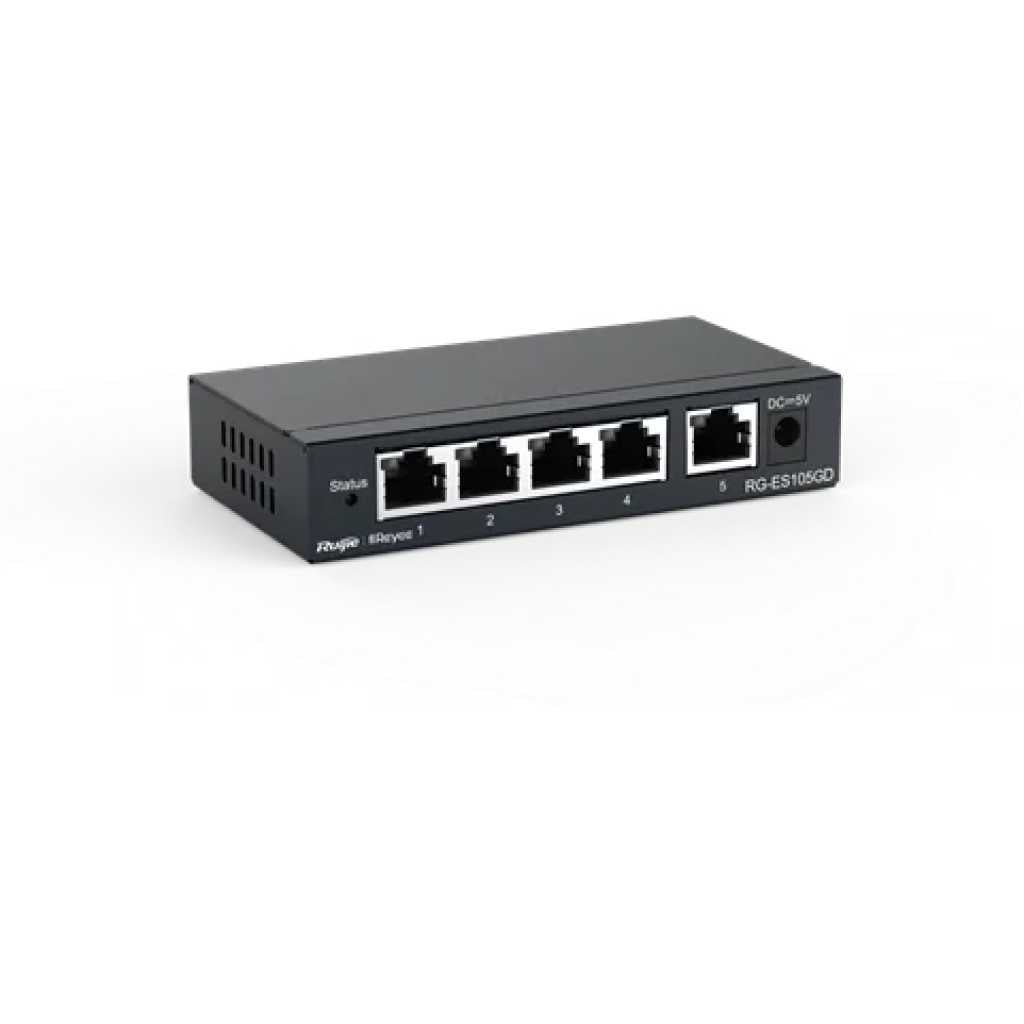 Key Features: Ruijie RG-ES105D 5-port 10/100 Mbps Unmanaged Desktop non-PoE switch 5-port 10/100 Mbps desktop unmanaged non-PoE switch Unmanaged switch, which is visible on Ruijie Cloud App Large buffer for smooth data transmission Intelligent PoE management High network reliability High-quality design