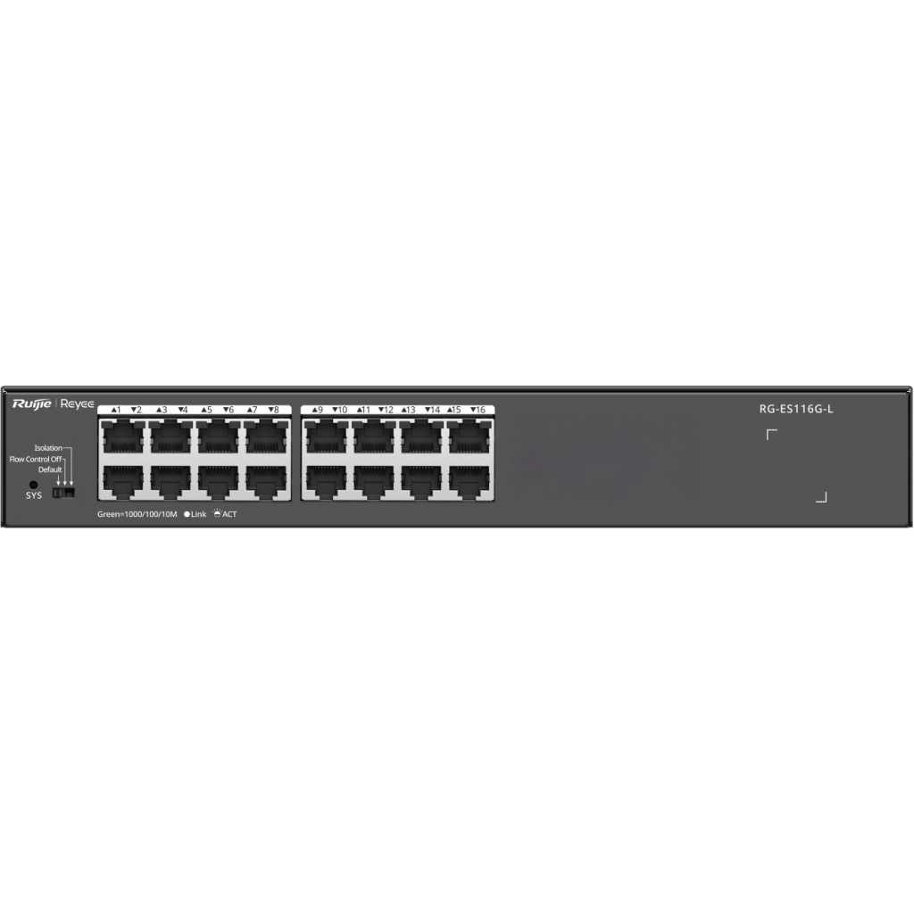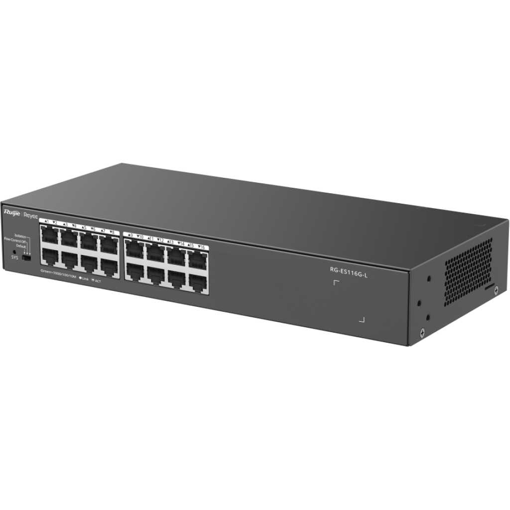 Key Features: Ruijie RG-ES116G-L, 16-Port 10/100/1000 Mbps Unmanaged Non-PoE Switch 16-port 10/100/1000 Mbps unmanaged non-PoE switch Unmanaged switch, which is visible on Ruijie Cloud Secure and stable CCTV network High-quality design Applicable to various scenarios