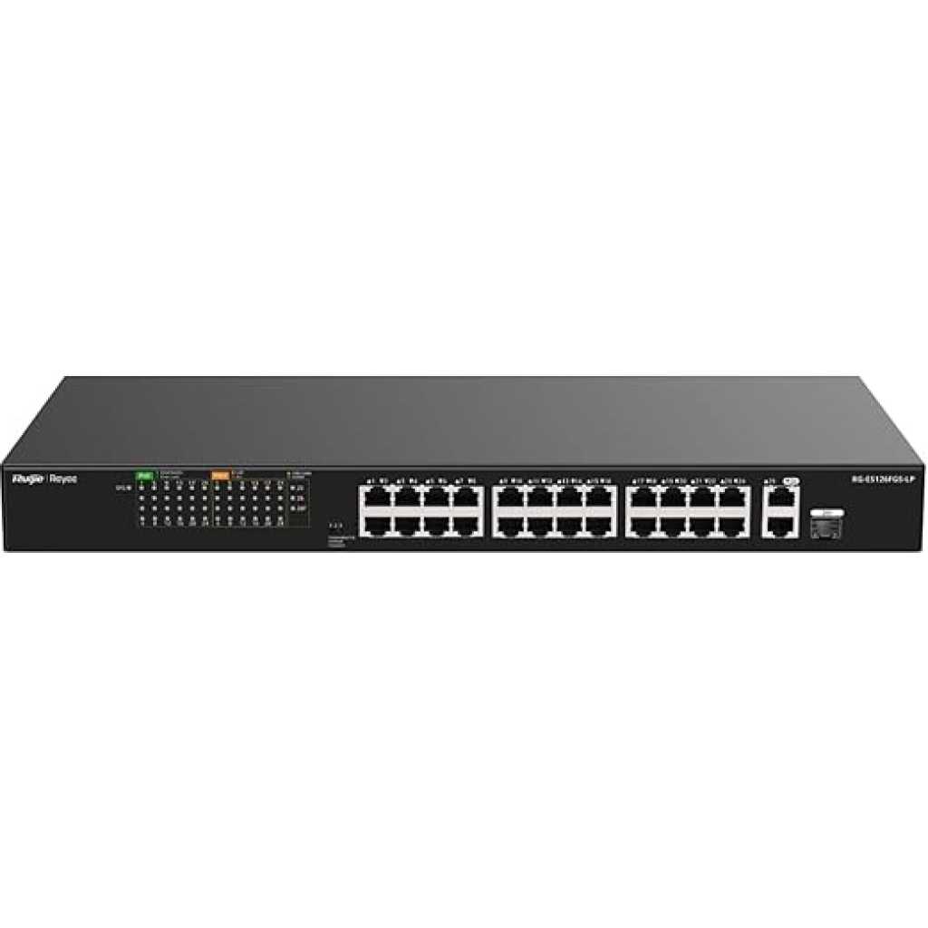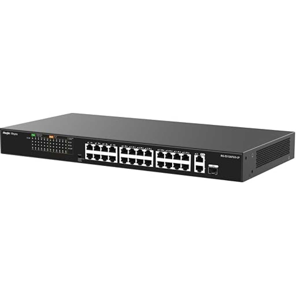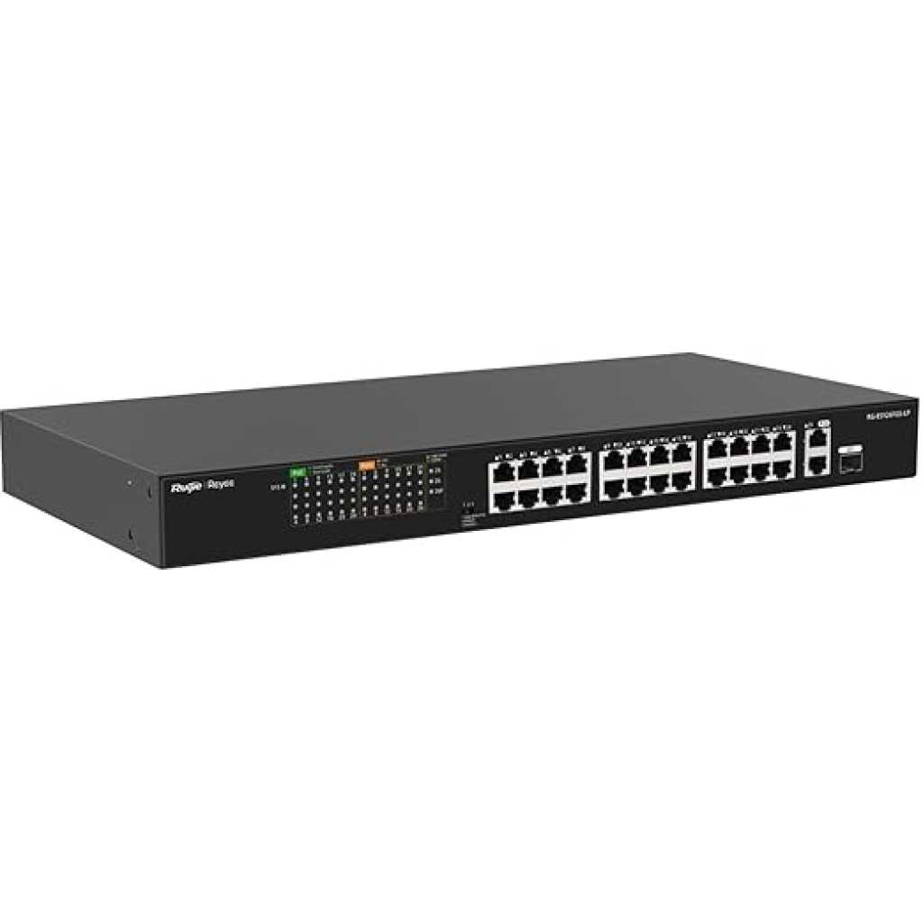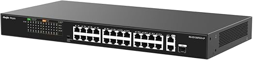 Ruijie RG-ES126FGS-P, 24-Port 10/100 Mbps with 2-Port Gigabit Unmanaged PoE Switch Intelligent PoE Management: The switch can automatically identify and power compliant devices through Ethernet cables. Ruijie Cloud Integration: The switch is visible on the Ruijie Cloud, allowing for centralized management if a compatible managed switch is also present. Multiple Working Modes: The switch can be configured for extend, default, or isolation modes, allowing for flexibility in network deployment. IP Camera Recognition: The switch can detect and identify IP cameras, and features remote reboot functionality for troubleshooting. Unmanaged: This switch is unmanaged, meaning it doesn’t require configuration through a web interface or command-line interface. PoE+: It supports 24 x 802.3af/at PoE+ ports with a maximum of 30W per port and a total power budget of 370W. Better Quality Design: Adhering to strict standards in PCB design and component selection Gigabit Uplink: Includes two 10/100/1000 Mbps ports and one SFP/RJ45 combo port for uplink connectivity. CCTV Mode: Supports a CCTV mode for optimized network performance, Extended PoE: Offers an extended PoE mode for longer distances. Switching Capacity: 8.8 Gbps. Forwarding Rate 6.55 Mpps, MAC Address Table 8000. Dimensions 440 mm x 214.9 mm x 44 mm (17.32 in. x 8.46 in. x 1.73 in.) and Weight: 3.78 kg. Key Features: Ruijie RG-ES126FGS-P, 24-Port 10/100 Mbps with 2-Port Gigabit Unmanaged PoE Switch 24-port 10/100 Mbps with 2-port Gigabit unmanaged PoE switch Unmanaged switch, which is visible on Ruijie Cloud Intelligent and secure CCTV network Intelligent PoE Management High-quality design Applicable to various scenarios