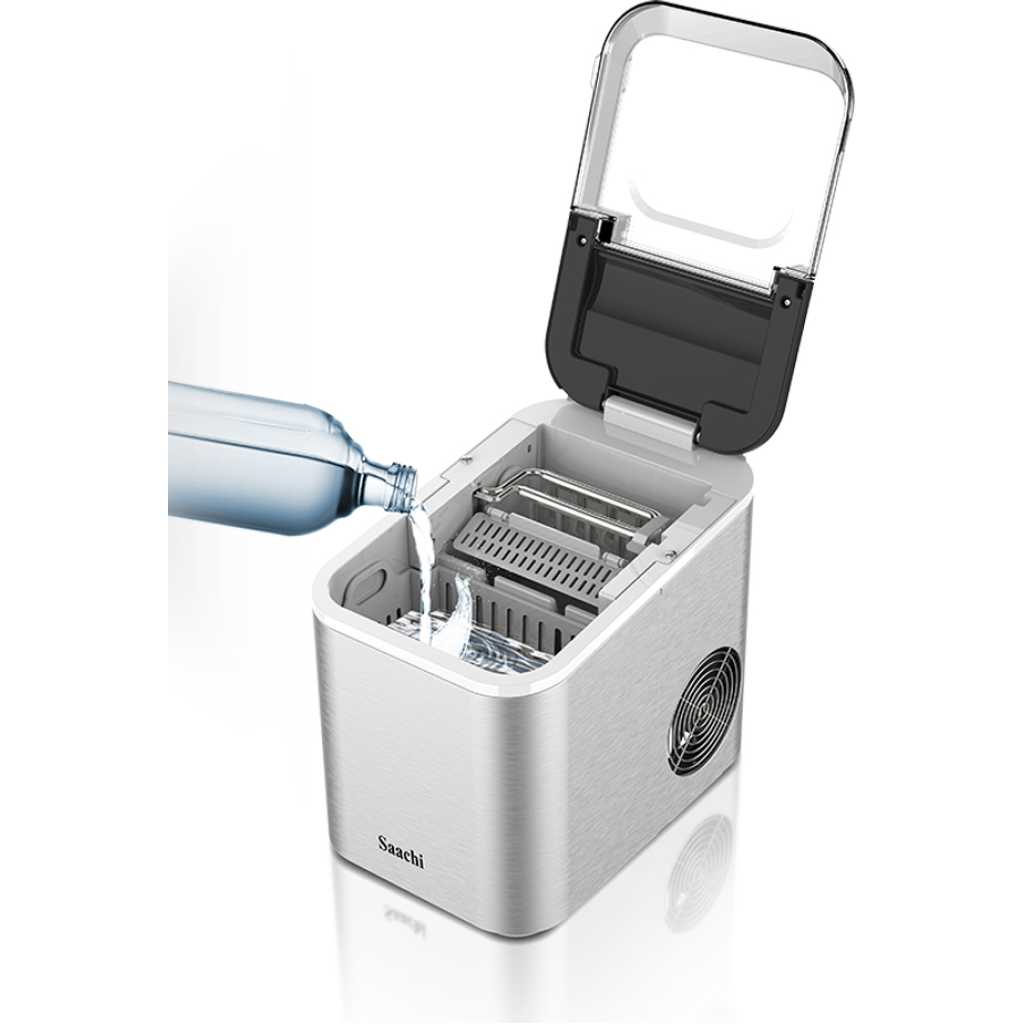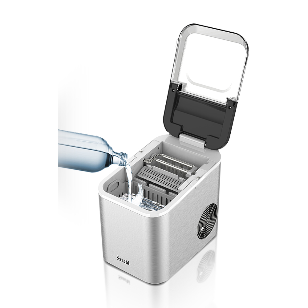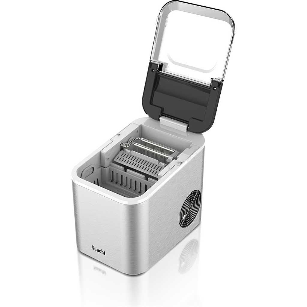 The Saachi Electric Ice Maker NL-IM-451 simplifies the ice-making process with efficient and convenient features. It boasts a 1.6L water tank capacity, producing 12-15kgs of ice per day, with the option to choose between small and large ice cubes. The machine dispenses 9 bullet-shaped ice cubes every 6-8 minutes and features a durable stainless steel housing, a large transparent visual window, and a removable ice basket. It automatically shuts off when the ice tank is full and includes an auto-clean function and intelligent detection system for water shortage. Powered by a high-efficiency compressor with low energy consumption and using R600a refrigerant, it’s ideal for ambient temperatures from 10 to 43 degrees Celsius. 1.6L water tank Ice capacity: 12-15kgs/24h 9 pieces of bullet shaped ice dispensed every 6-8 minutes Option to choose between small and large ice cubes Stainless steel housing Large transparent visual window Removable Ice Basket Cover can be partially or fully opened for easy cleaning Automatic shut-off when ice tank is full Auto clean function Intelligent detection system for shortage of water High efficiency compressor with low energy consumption Refrigerant: R600a Ambient temperature: 10-43C Key Features: 1.6L water tank Ice capacity: 12-15kgs/24h 9 pieces of bullet shaped ice dispensed every 6-8 minutes Option to choose between small and large ice cubes Stainless steel housing Large transparent visual window Removable Ice Basket Cover can be partially or fully opened for easy cleaning Automatic shut-off when ice tank is full Auto clean function Intelligent detection system for shortage of water High efficiency compressor with low energy consumption Refrigerant: R600a Ambient temperature: 10-43C
