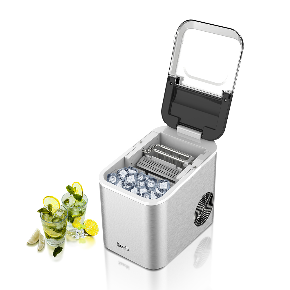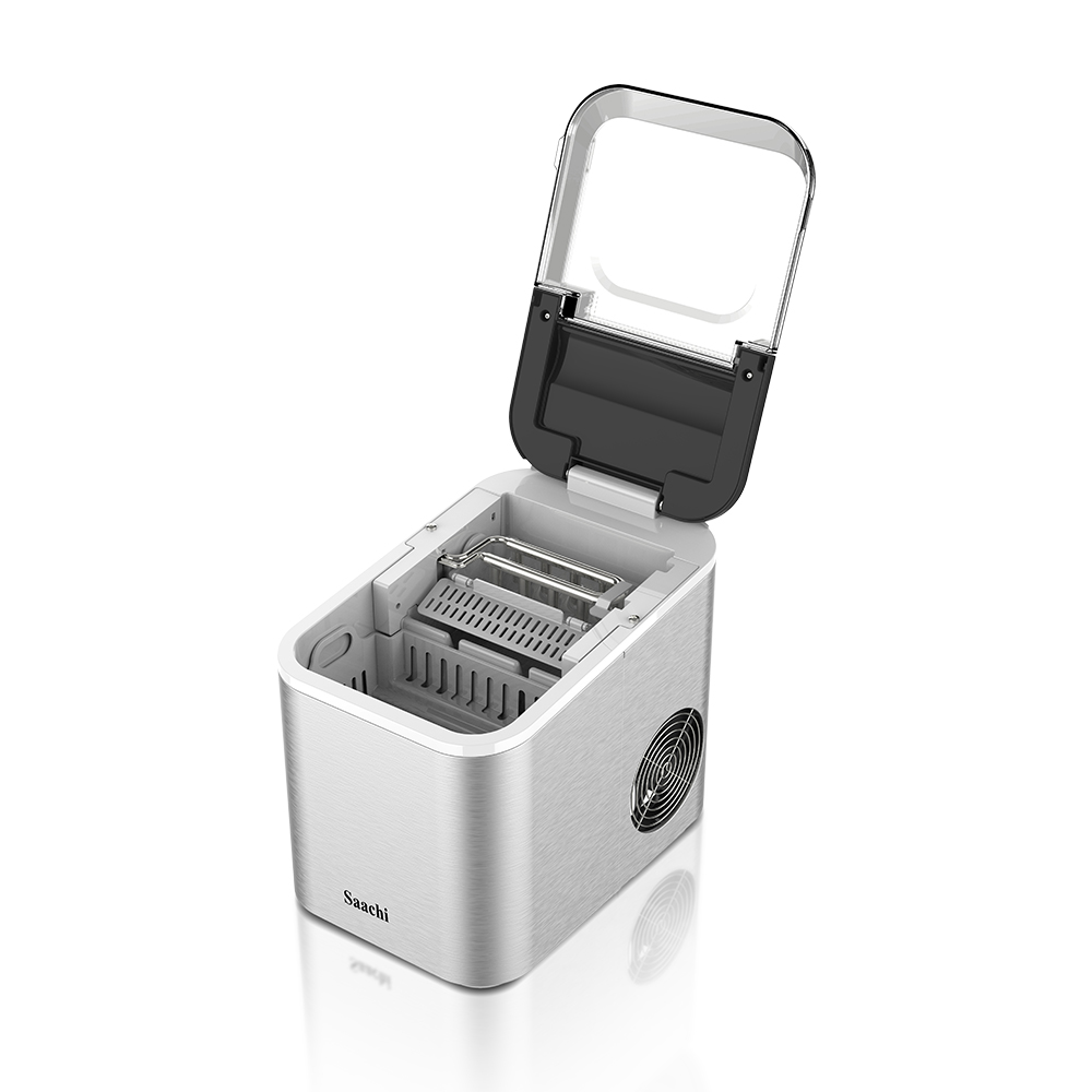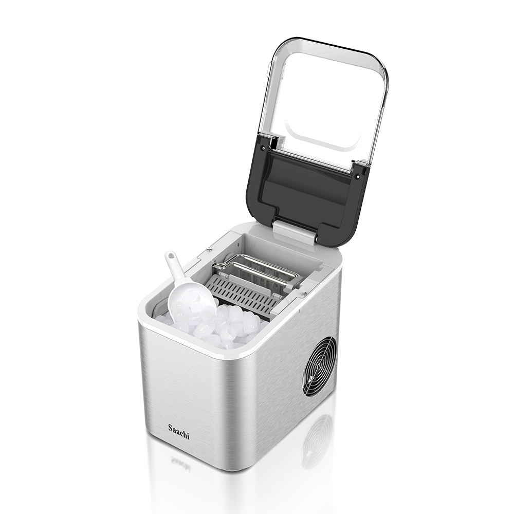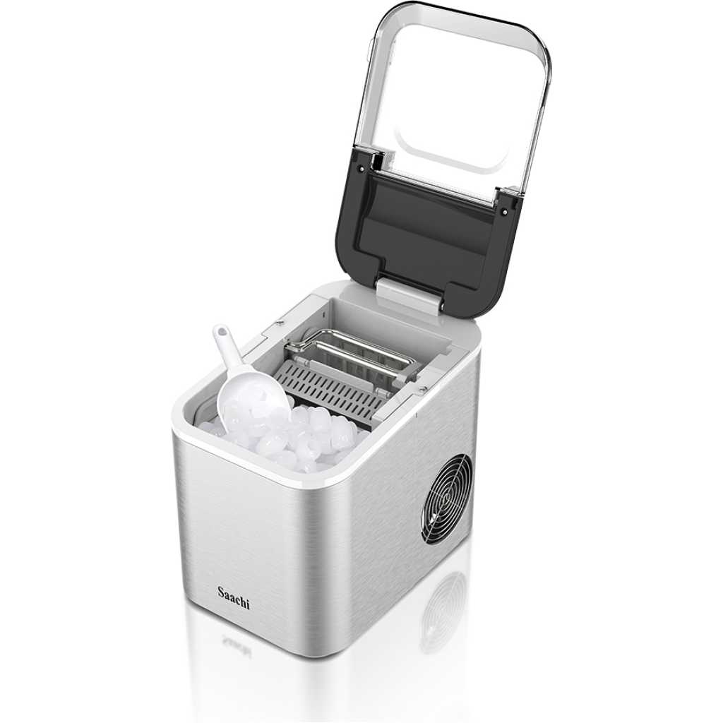 The Saachi Electric Ice Maker NL-IM-451 simplifies the ice-making process with efficient and convenient features. It boasts a 1.6L water tank capacity, producing 12-15kgs of ice per day, with the option to choose between small and large ice cubes. The machine dispenses 9 bullet-shaped ice cubes every 6-8 minutes and features a durable stainless steel housing, a large transparent visual window, and a removable ice basket. It automatically shuts off when the ice tank is full and includes an auto-clean function and intelligent detection system for water shortage. Powered by a high-efficiency compressor with low energy consumption and using R600a refrigerant, it’s ideal for ambient temperatures from 10 to 43 degrees Celsius. 1.6L water tank Ice capacity: 12-15kgs/24h 9 pieces of bullet shaped ice dispensed every 6-8 minutes Option to choose between small and large ice cubes Stainless steel housing Large transparent visual window Removable Ice Basket Cover can be partially or fully opened for easy cleaning Automatic shut-off when ice tank is full Auto clean function Intelligent detection system for shortage of water High efficiency compressor with low energy consumption Refrigerant: R600a Ambient temperature: 10-43C Key Features: 1.6L water tank Ice capacity: 12-15kgs/24h 9 pieces of bullet shaped ice dispensed every 6-8 minutes Option to choose between small and large ice cubes Stainless steel housing Large transparent visual window Removable Ice Basket Cover can be partially or fully opened for easy cleaning Automatic shut-off when ice tank is full Auto clean function Intelligent detection system for shortage of water High efficiency compressor with low energy consumption Refrigerant: R600a Ambient temperature: 10-43C