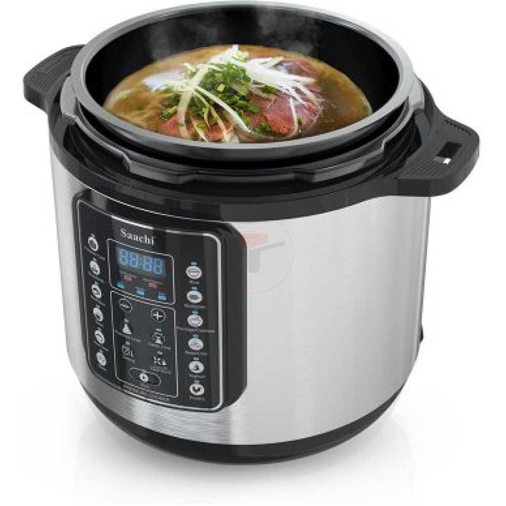 Saachi 14 In 1 Multi Function 6L Electric Pressure Cooker – Silver, Black. With the Saachi Multi-function Pressure cooker, you can slow cook, pressure cook and multi cook all in the one machine. Made with 14 direct menu programs, it’s smart enough to take care of the cooking for you or let you take more control so as to suit your own personal taste and needs. It has a capacity of 6 Liters which is more than sufficient to cook your daily meals. Keep-warm function for 24 hours ensures your food is warm once it has been cooked until its time for your meal. The locking mechanism in this appliance prevents any overflow and makes it a safe appliance to use. Features – 14 cooking programs – 10 Automatic preset cooking programs: Rice, Multigrain, Porridge, Egg, Steam, Slow cook , Sauté, Meat/Stew, Soup/Broth. – Automatic keep-warm function up to 24 hours – Adjustable temperature control from 140 to 160°C – Accessories: Plastic spoon, Measuring cup – Manual Pressure cooker settings: Low, Middle and High – Overheat protection – Touch sensitive control panel