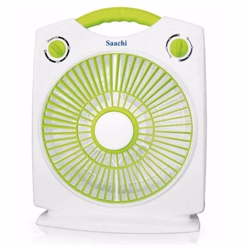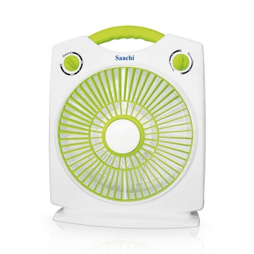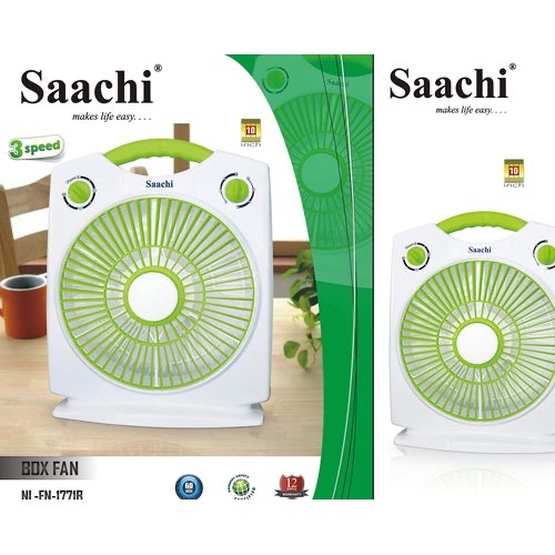 10-Inch Box Fan NL-FN-1771B-BL – Green, White We are selling a Saachi 3 speed box fan equipped with a 60 minutes timer! This fan offers three speed modes (i.e Low, Medium, High) which deliver efficient cooling. It has a very powerful motor which creates very low noise while in operation. The timer renders one hour operational function for your convenience. The fan has a small and compact design to ensure portability during transportation and the subsequent installation. The fan comes with the most recent energy saving technology! It therefore has low electricity consumption. It is a great choice to cool any room of your house, without a lot of noise disturbance. Set it up by an open window to bring the fresh outdoor air to the inside on a warm afternoonIts power output is only 50 watts maximum out. Enjoy the fresh air with the Saachi box fan series, because Saachi makes life easy. Key Features: 10 inch Box Fan 3 Speed Control knob-Low, Medium, High One Hour Timer Rotating Front Louver 6 Plastic Blades Quiet operation Efficient cooling Durable Copper motor Low electricity consumption Safe and reliable