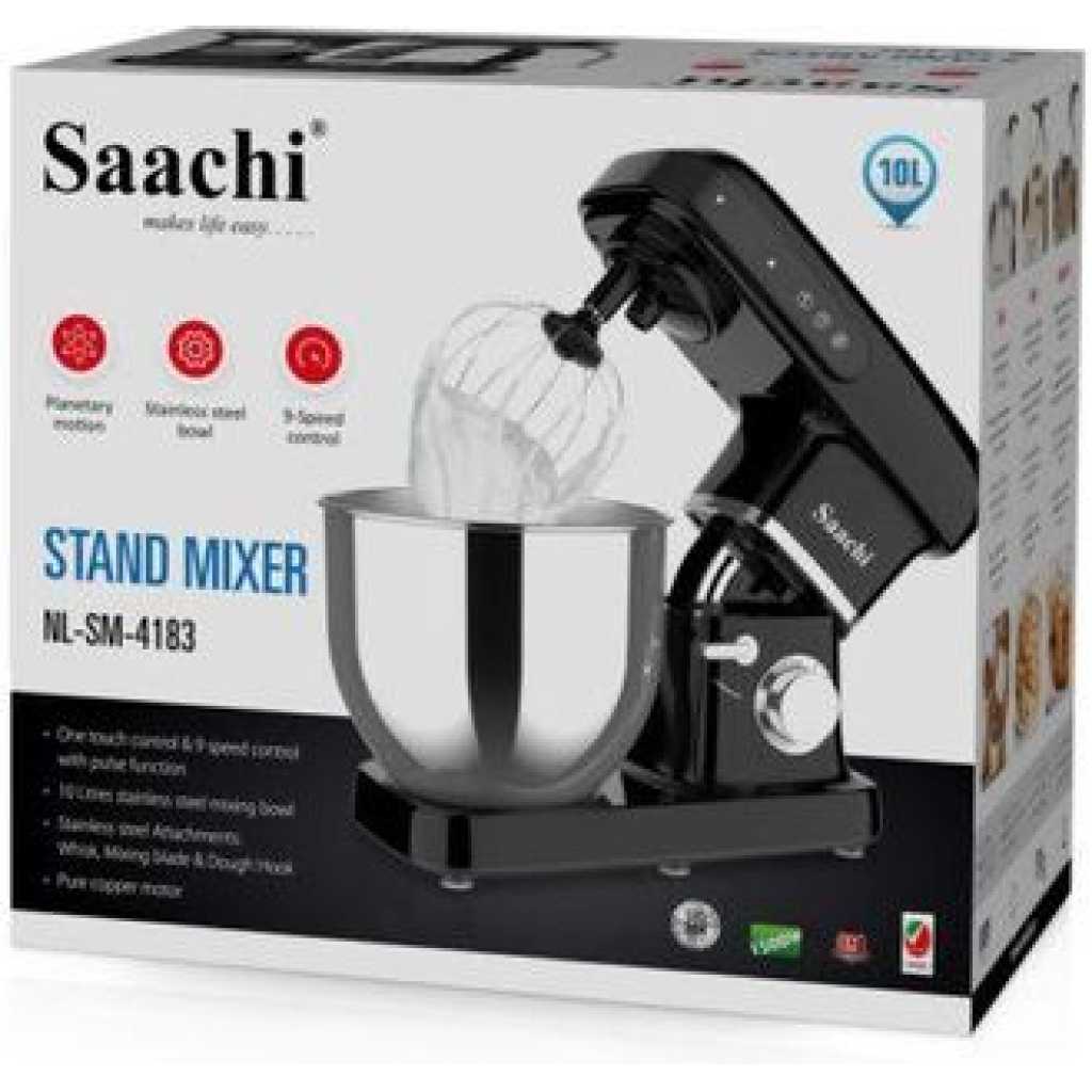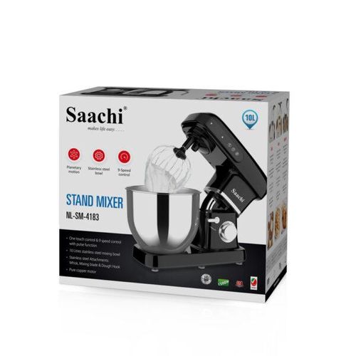 The Saachi 9-Speed Stand Mixer with pulse function, is a great addition to your kitchen to simplify your everyday tasks. Create fluffy meringue or whip cream for delicious desserts with ease when you use the whisk beater in your Saachi stand mixer. Take the effort out of kneading dough! Simply use the dough hook and let your mixer take care of preparing dough for a home baked loaf. Key Features: 9 speed control with pulse function – One touch control – 10 Liters stainless steel mixing bowl – Stainless steel Attachments: Whisk, Mixing blade & Dough Hook – Pure copper motor – Planetary mixing action – Tilt-head design electric mixer – Stainless steel whisk for light mixtures – Cream, Egg – Stainless steel beater for medium mixtures – Salad, Cookies – Stainless steel dough hook for heavy mixtures – Bread, Pizza