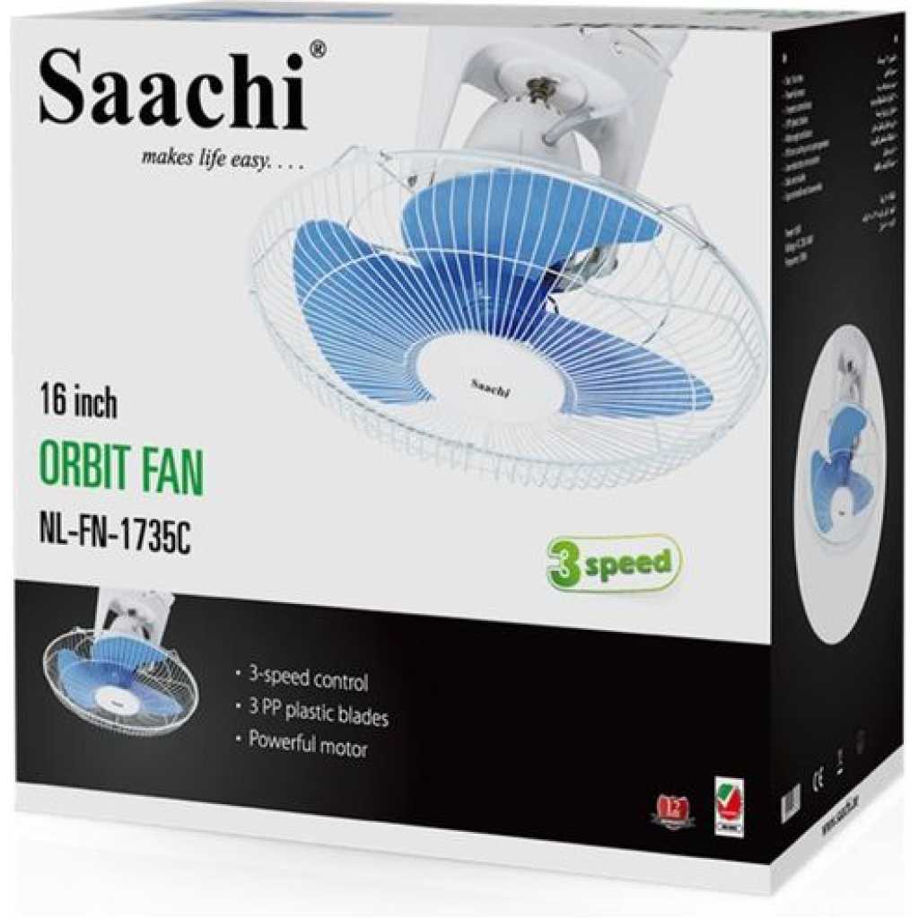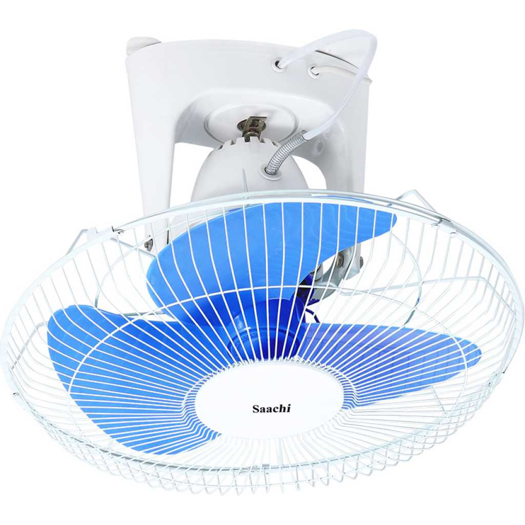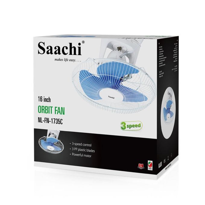 Key Features: Saachi 16-Inch Orbit Ceiling Fan With 3 Speed Controls & Low Noise NL-FN-1735C – Blue/White. 16″ (40cm) Orbit/ ceiling fan. 3- Speed Control 3 PP Plastic blades 7.5 hours timer Powerful motor Quality Guaranteed. Recognized Excellence. Model: NL-FN-1735C