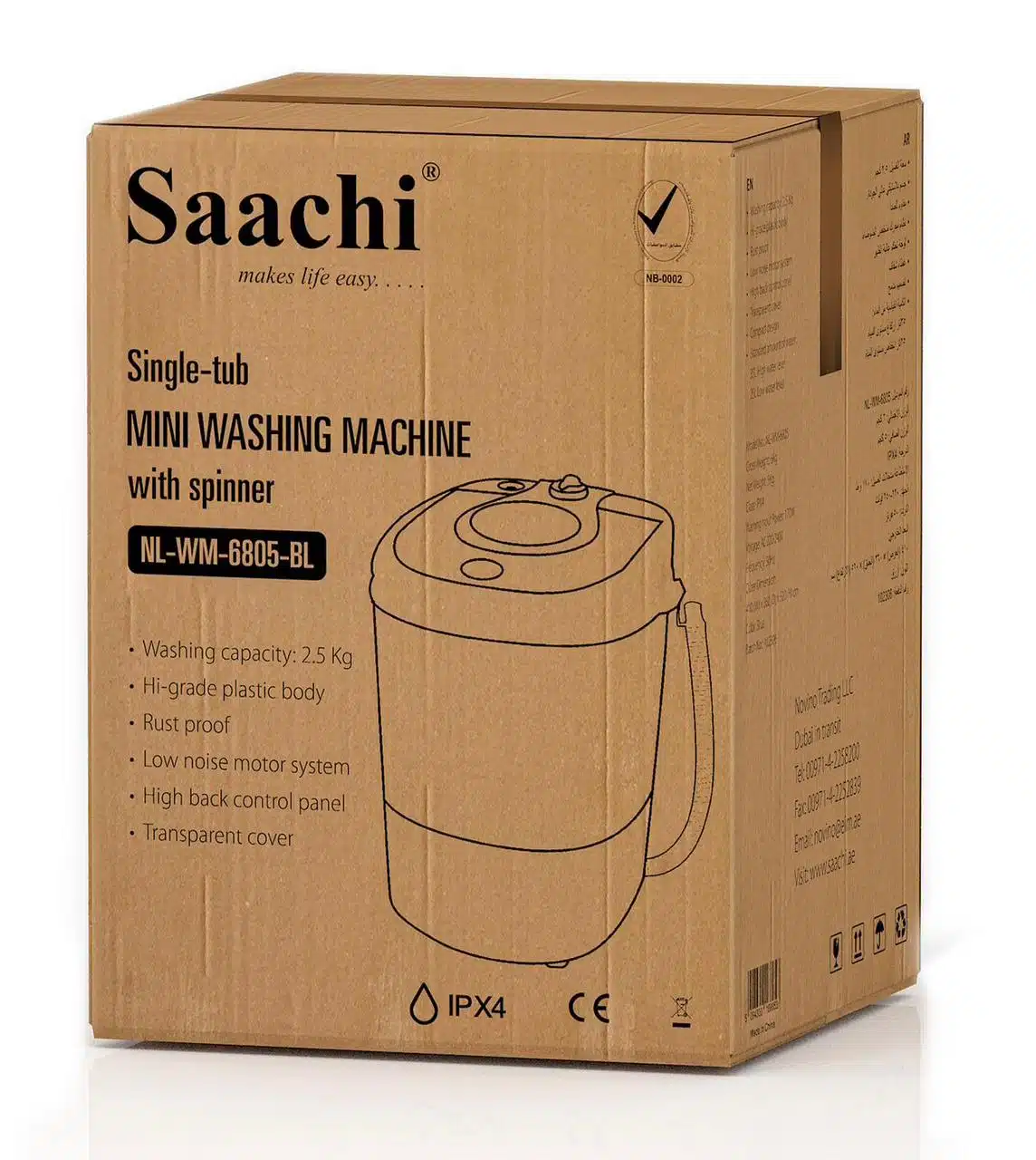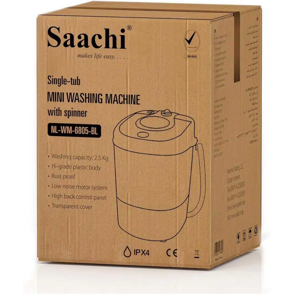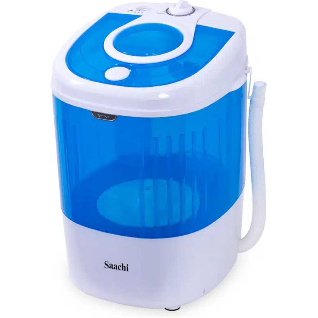 Saachi 2.5Kg Twin-Tub Washing Machine with Spinner | NL-WM-6805. Single tub washing machine with spinner Washing capacity: 2.5 Kg Hi-grade plastic body Rust proof Low-noise motor system High back control panel Transparent cover Compact design Standard amount of water: 35L High water level 25L Low water level Key Features: Saachi 2.5Kg Twin-Tub Washing Machine with Spinner | NL-WM-6805. Single tub washing machine with spinner Washing capacity: 2.5 Kg Hi-grade plastic body Rust proof Low-noise motor system High back control panel Transparent cover Compact design Standard amount of water: 35L High water level 25L Low water level