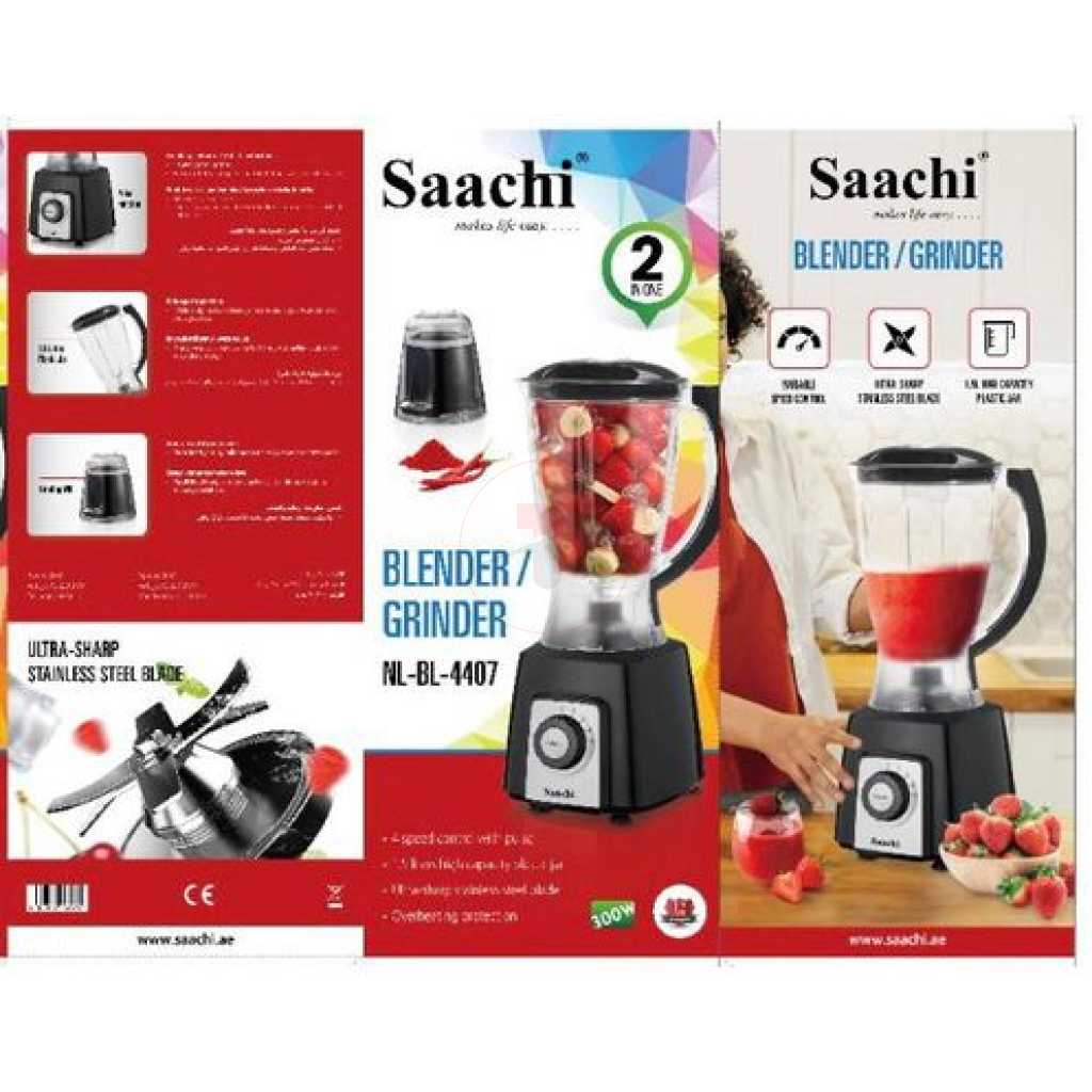 Saachi 2-In-1 Double Jar Blendforce Blender, 1.5 Litres – Black. Saachi produces blending results with power and ease. Thanks to the POWELIX Technology and it’s 3 combined actions associated, you will have the perfect result up to 30% faster. This 800 W blender features an innovative Air Cooling System that optimizes air flow around the motor to increase durability and prevent overheating for up to 3 minutes of continuous blending. Thanks to the 3 actions of the Smart Lock Technology, you have an effortless daily blending. Action 1 : Easy Lock : New extrernal locking for more comfortable closing (40% easier to lock). Action 2 : Easy Safety : New safe auto lock system on the base to have the blades perfectly secure when you lock the jar. Action 3 : Easy Clean : New clic clean to split the blade holder in two parts for an easy cleaning. Operating the blender is easy and comfortable, with a textured grip around the rotary button for smooth turning, an ergonomic handle with a natural, intuitive feel, and suction cups on the arched base providing added stability. The generous 1.5 L capacity is perfect for any occasion, with a measuring cup included for extra precision. Thanks to the thermal resistant glass jar, realise easely a large range of cold or hot preparations. Unlock a wide variety of choices, including smoothies, soups, sauces, chili paste for delicious and perfectly-blended results every day. Key Features: Saachi 2-In-1 Double Jar Blendforce Blender, 1.5 Litres – Black. Model: NL-BL-4407. Saachi 2in1 blender. Plastic Jar & grinder Colour: Black. Capacity: 1.5 litres. Weight:1.2kg. 4 Speed Power: 350watts.