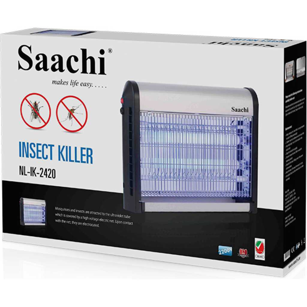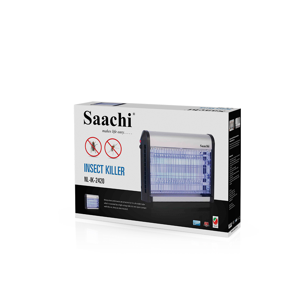 Damn those pesky insects, we hate them too! The Saachi Insect Killer is a must have appliance if you, like us, do not appreciate flies buzzing around you while you try to have a meal or simply take a nap. The insects are attracted to the UV light emitted by the appliance after which they are caught in the net, electrocuted and collected in the tray at the bottom of the appliance to be disposed off. This convenient product can either be placed on a table top or hung on the ceiling via the hooks on the top of the appliance. Watt: 20W Input: AC 220-240V; 50/60Hz Output: AC 2200VDC ± 10% 2 x 10 Watt ultra-violet tubes Fluorescent lamp type: G13 T8 BL F10W Lamp Number: 2 Weight: 1.80 kgs Dimensions: 41 x 9.5 x 32 cm Key Features: – Ultra-violet tubes – High voltage eletric net – Removable bottom tray – Hangable hooks with chain