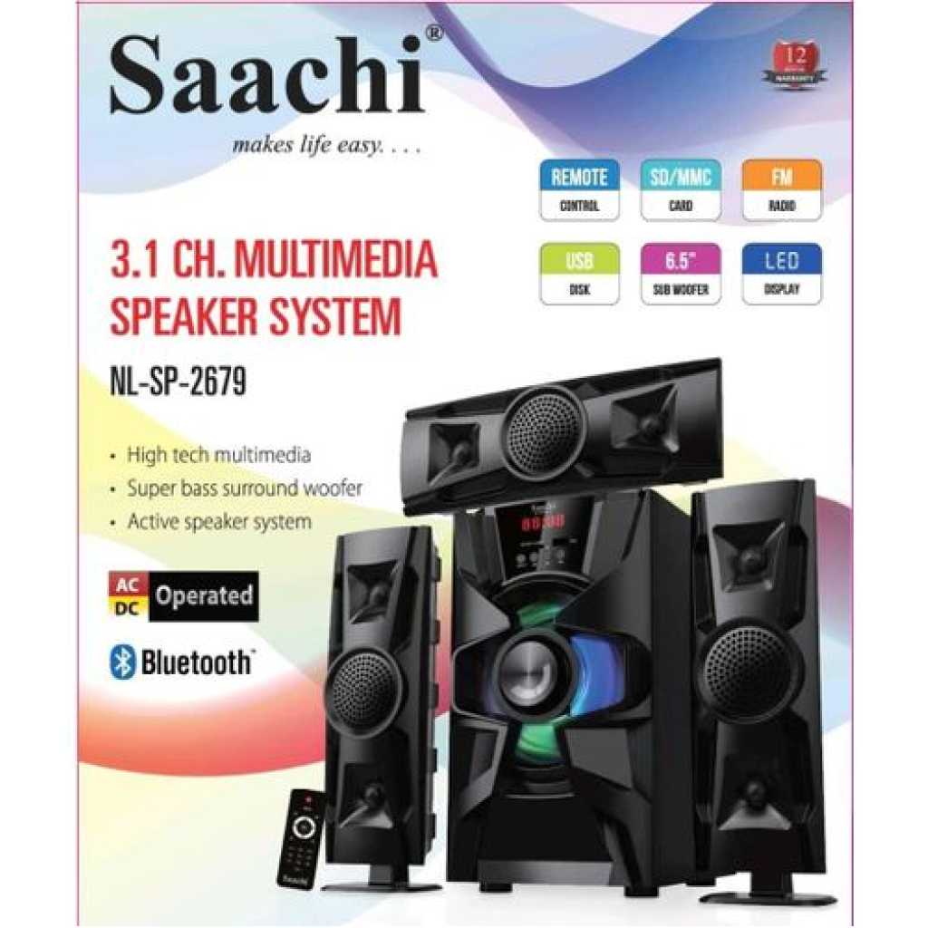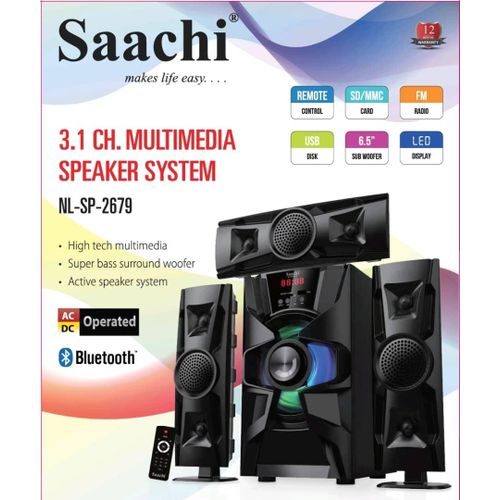Key Features: Saachi 3.1CH 10000watts AC/DC/FM/BT/USB Sub Woofer System, Multi-Speaker Home Theatre System – Black. Remote 10000watts Bluetooth Aux/Digital FM ready USB Support Sd card