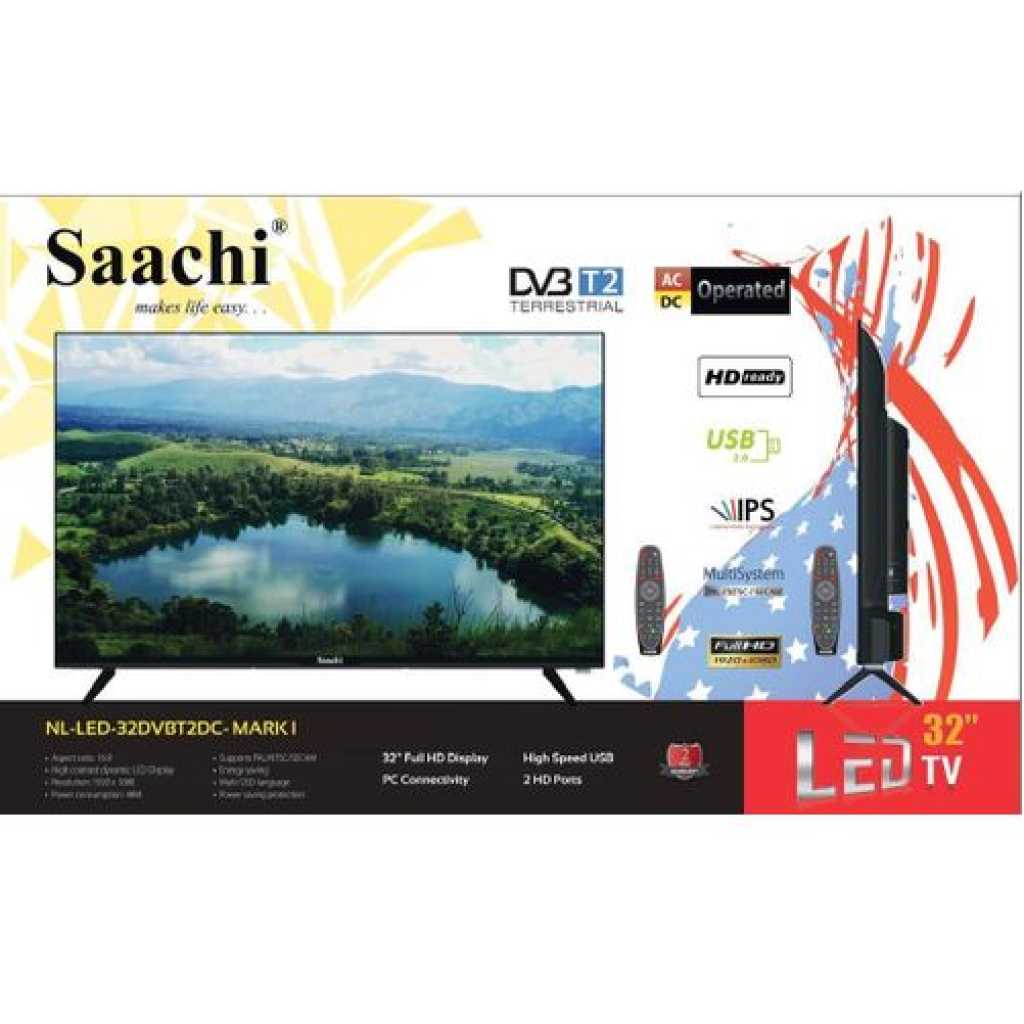 Saachi 32″ Frameless Digital TV- Black The 32″ backlit LED panel of the television produces eye catching HD resolution images that are simply stunning to look at. This TV also has a number of ports to keep you well connected at all times, and these include the USB and HDMI ports. 32″ LED Displays the Saachi 32 inch HD LED TV’s makes a perfect addition to contemporary rooms. When switched on, the backlit LED screen churns out images and videos with amazing contrast and details. High Definition TV. The Hisense 32″ HD LED display generates amazingly clear, razor sharp images with a resolution of full HD. More over, it comes with the latest DVB-T2 technology for the best & clearest digital TV signals so you can enjoy in-built free local TV channels off the box. Digital LED Technology witness the entire RCG spectrum brought to life on your screen. The Saachi LED TV brings you exceptionally vibrant and true-to-life images delivered just as the director imagined. USB Digital Media Player provides you the flexibility to enjoy not only photos or music, but also HD multimedia files directly in your TV via USB. explorer more connectivity options the tv features 1 USB 2.0 ports, and 2 HDMI ports to which you can connect your DVD players, cameras, external hard drives, and more. Now you can enjoy all your multimedia content of these gadgets on the big screen, right from the comfort of your couch. It also features audio input. Technical Specifications Display•Technology: LED•Screen Size: 32 Inches •Resolution: Full HD•Display Ratio: 16:9; FHD Ready Audio•MAX Audio Output (RMS): 6W + 6W•Dolby Digital•Sound Equalizer•Audio File Format: MP3, AAc, M4A, WAV Video:AV Colour Format: PAL, NTSC, SECAMComponent Mode: 480i/60Hz, 480p/60Hz, 576i/50Hz, 576p/50Hz, 720p/50Hz, 720p/60Hz, 1080i/50Hz, 1080i/60Hz, 1080p/50Hz, 1080p/60HzVGA Mode: 640 x 480, 800 x 600, 1024 x 768, 1280 x 1024 – 60HzHDMIMode: 480i/60Hz, 480p/60Hz, 576i/50Hz, 576p/50Hz, 720p/50Hz, 720p/60Hz,1080i/50Hz, 1080i/60Hz, 1080p/50Hz, 1080p/60Hz. 640 x 480, 800 x 600, 1024 x 768 – 60HzUSB Video Format: AVI, MKV, FLV, TS, MP4Photo Format: JPEG Connectivity:•HDMI: 2 •USB: 1•Optical Output: 1 •Audio Jack: 1•AV Input: 1 Features : •Narrow Frame •Digital Media player •Digital High Definition Tuner Television System •PVR, DV3 Digital Receiver Power •Energy Efficiency class A + •Power Supply: AC 220-240V 50/60Hz •Power Consumption On-Mode: 30W •Annual Energy Consumption: 44 kWh per year on 4 hours operation for 365 days. Note: Due to the difference between different monitors, the picture may not reflect the actual color of the item. We guarantee the style is the same as shown in the pictures. Thank you! Make your order here today and have TilyExpress deliver it right at your most convenient picking point or doorstep Please enjoy more shopping of wide range of items at affordable prices on our store at www.tilyexpress.ug