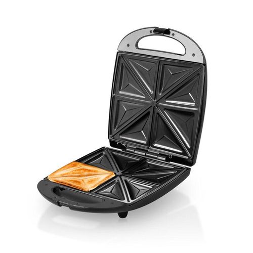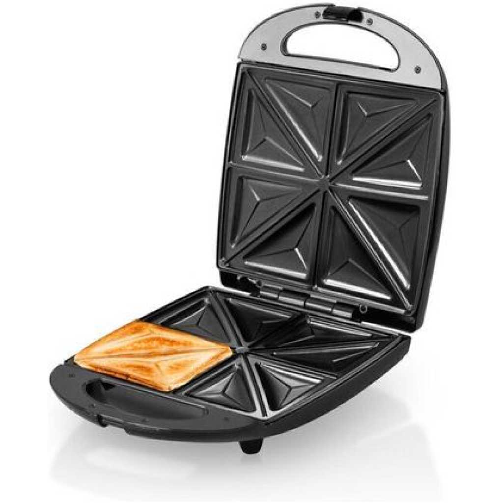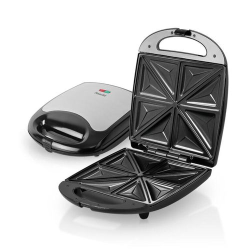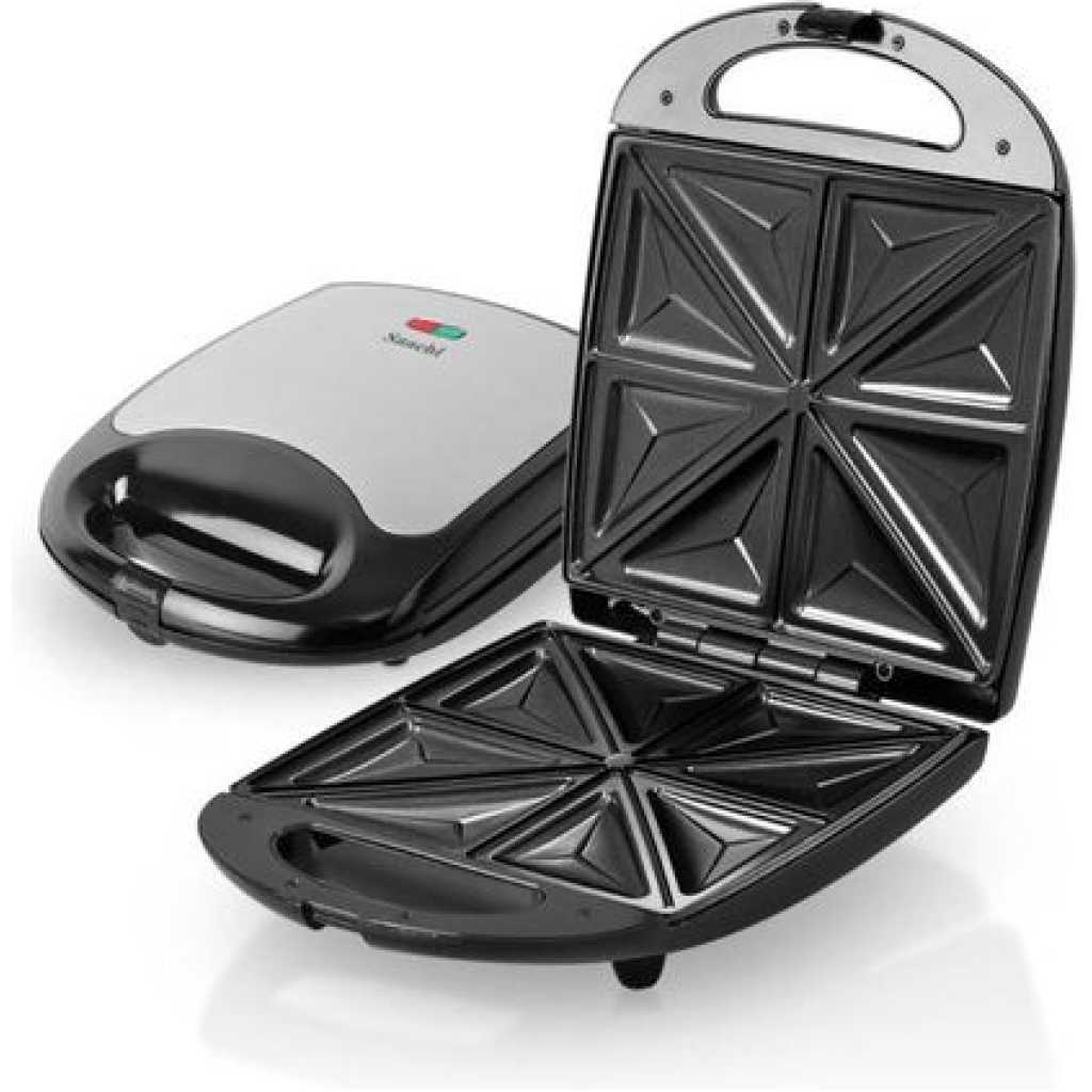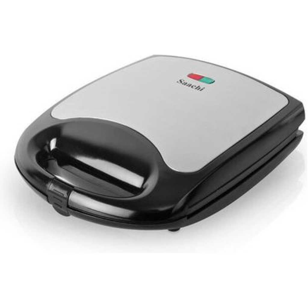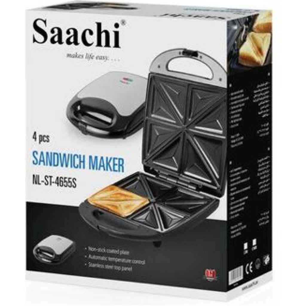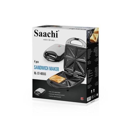 Saachi 4-Slice Sandwich / Grill NL-ST-4655S-BK. The Saachi Sandwich Maker, NL-ST-4655S, can make up to 4 sandwiches that are cut into 8 neatly shaped triangles. The automatic thermostat with indicator lights allows you to go about the rest of your tasks until the green light notifies you that your sandwich is ready. The non-stick plates prevent a mess from being formed in the sandwich maker enabling you to enjoy a delicious meal stress-free. Finally, the locking mechanism ensures safety while the sandwich maker is on, making it a safe product to use around children Key Features: Saachi 4-Slice Sandwich / Grill NL-ST-4655S-BK. 4 pcs sandwich Non-stick coated plate Automatic temperature control Stainless steel top panel Power cord storage Vertical storage Pilot light indicator Easy to clean