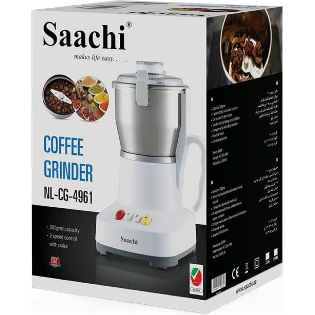 Nothing like a brewed coffee from freshly grounded coffee beans. Saachi Coffee Grinder is apt for coffee lovers. It can also be used to grind spices. The elegance steel design provides long durability. Package weight in KGs : 2Kgs. Model Number : NL-CG-4961. Type : coffee grinder. Capacity: 300gms. 2-speed control with pulse function. Can be used to grind spices. Stainless steel grinding cup and blades. Transparent lid with safety interlock. Powerful motor. Overheat protection. Power: 800w. Voltage: AC 220-240v. Frequency:50/60hz. Key Features: Coffee Grinder Nothing like a brewed coffee from freshly grounded coffee beans. Saachi Coffee Grinder is apt for coffee lovers. It can also be used to grind spices. The elegance steel design provides long durability. Features – 300gms capacity – 2 speed control with pulse function – Can be used to grind spices – Stainless steel grinding cup and blades – Transparent lid with safety interlock – Powerful motor