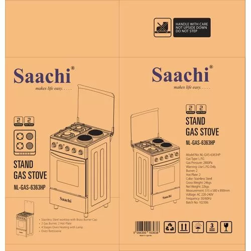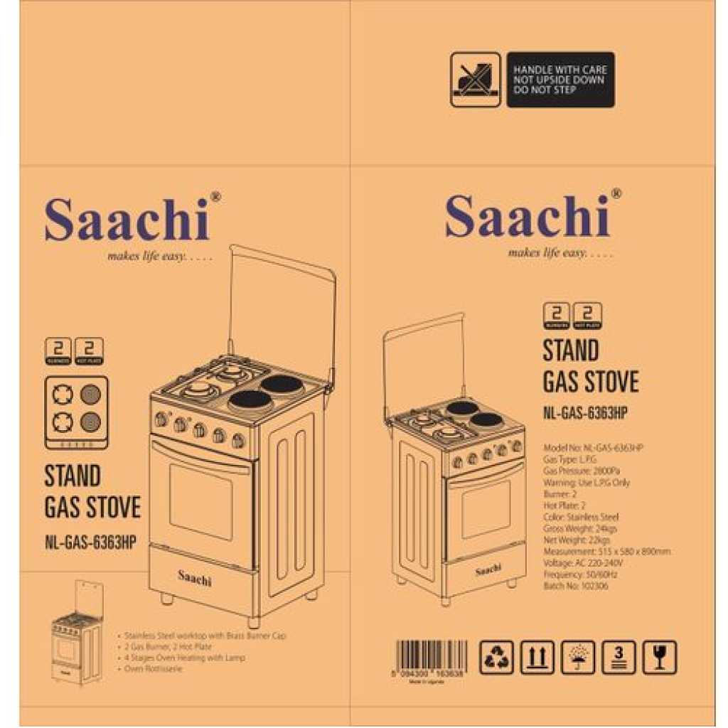 2 Gas + 2 Electric Stainless Steel Stove/Cooker with Gas Oven (50X50cm) – Silver Black Experience versatile and efficient cooking with the Saachi 2 Gas & 2 Electric Cooker with Gas Oven NL-6363HP (50X50cm) – Silver & Black. This modern and stylish cooker is designed to meet all your culinary needs. Whether you’re boiling, frying, baking, or grilling, the Saachi NL-63HP62 ensures you achieve delicious results with ease. The Saachi NL-6363HP Cooker features 2 Gas & 2 Electric Cooker with Gas Oven allowing you to cook multiple dishes simultaneously. The gas burners provide instant heat and precise temperature control, perfect for various cooking techniques. This cooker also includes a spacious gas oven, ideal for baking, roasting, and grilling. The gas oven ensures even heat distribution for perfectly cooked meals every time. Please buy it from TilyExpress Uganda today. The oven door features a transparent window, allowing you to monitor your dishes without opening the door and losing heat. Designed for convenience and durability, the Saachi NL-6363HP boasts a robust construction with a sleek black & Silver finish, adding a touch of elegance to any kitchen. The easy-to-clean surfaces and removable burner caps make maintenance a breeze, while the integrated safety features, such as flame failure protection, ensure safe operation. Enhance your cooking experience with the Saachi NL-6363HP 2 Gas & 2 Electric Cooker Combining versatility, efficiency, and stylish design, this cooker is the perfect addition to any kitchen, making meal preparation easier and more enjoyable. Features Stainless Steel Worktop With Brass Burner Cap Glass Top 2 Gas Burners21 Electric ( Hot plate ) 4 Stages Oven Heating Oven Lamp Oven Rottisserie Model No: NL-Gas-6363HP Gas Type: LPG Gas pressure: 2800pa Color: Stainless Steel Gross weight: 24kgs Net Weight: 22kgs Measurements 515x580x890 Voltage: AC 220-240 Frequency:50/60Hz Key Features: Stainless Steel Worktop With Brass Burner Cap Glass Top 2 Gas Burners21 Electric ( Hot plate ) 4 Stages Oven Heating Oven Lamp Oven Rotisserie Gas Oven & Grill Model No: NL-Gas-6363HP Gas Type: LPG Gas pressure: 2800pa Color: Stainless Steel Gross weight: 24kgs Net Weight: 22kgs Measurements 515x580x890 Voltage: AC 220-240 Frequency:50/60Hz