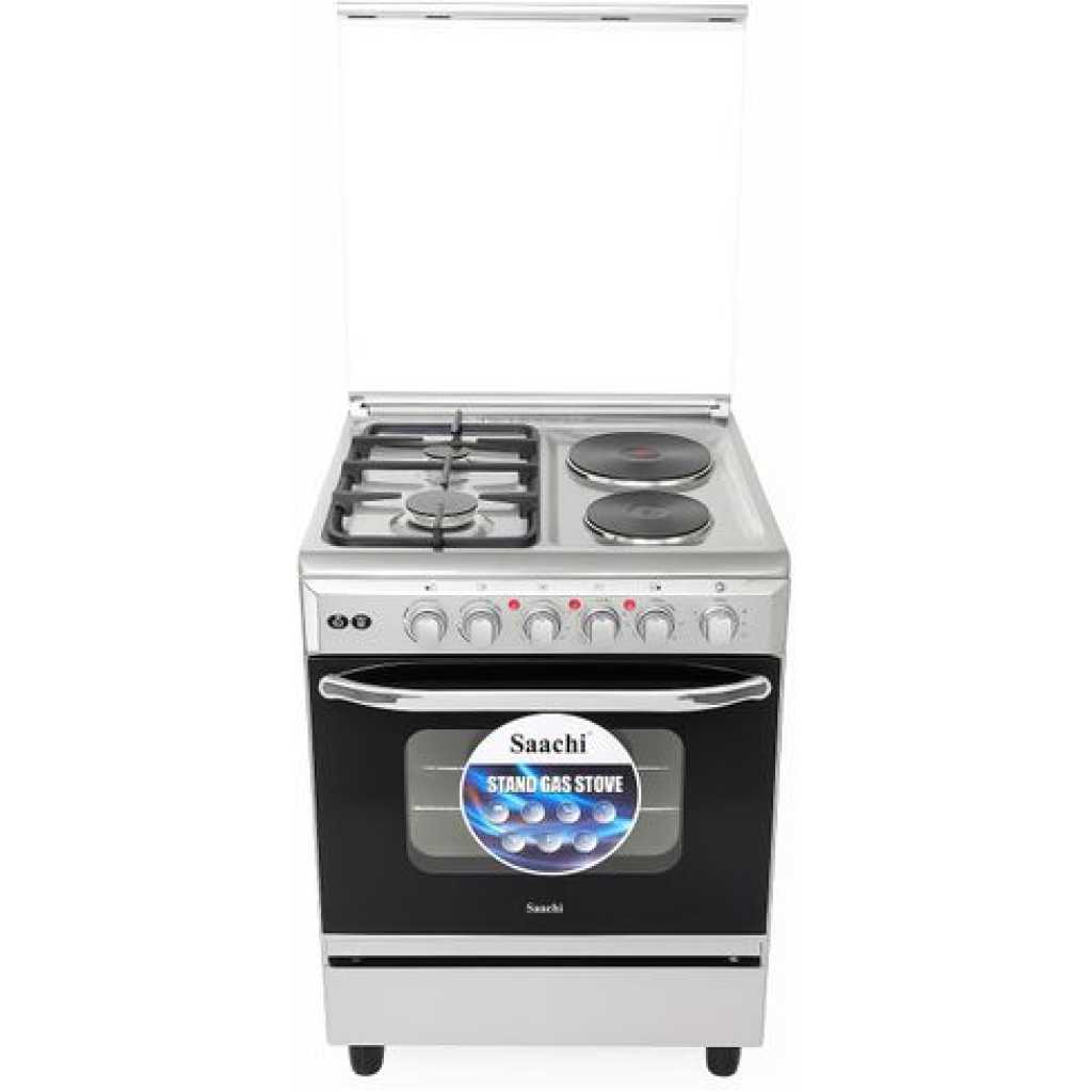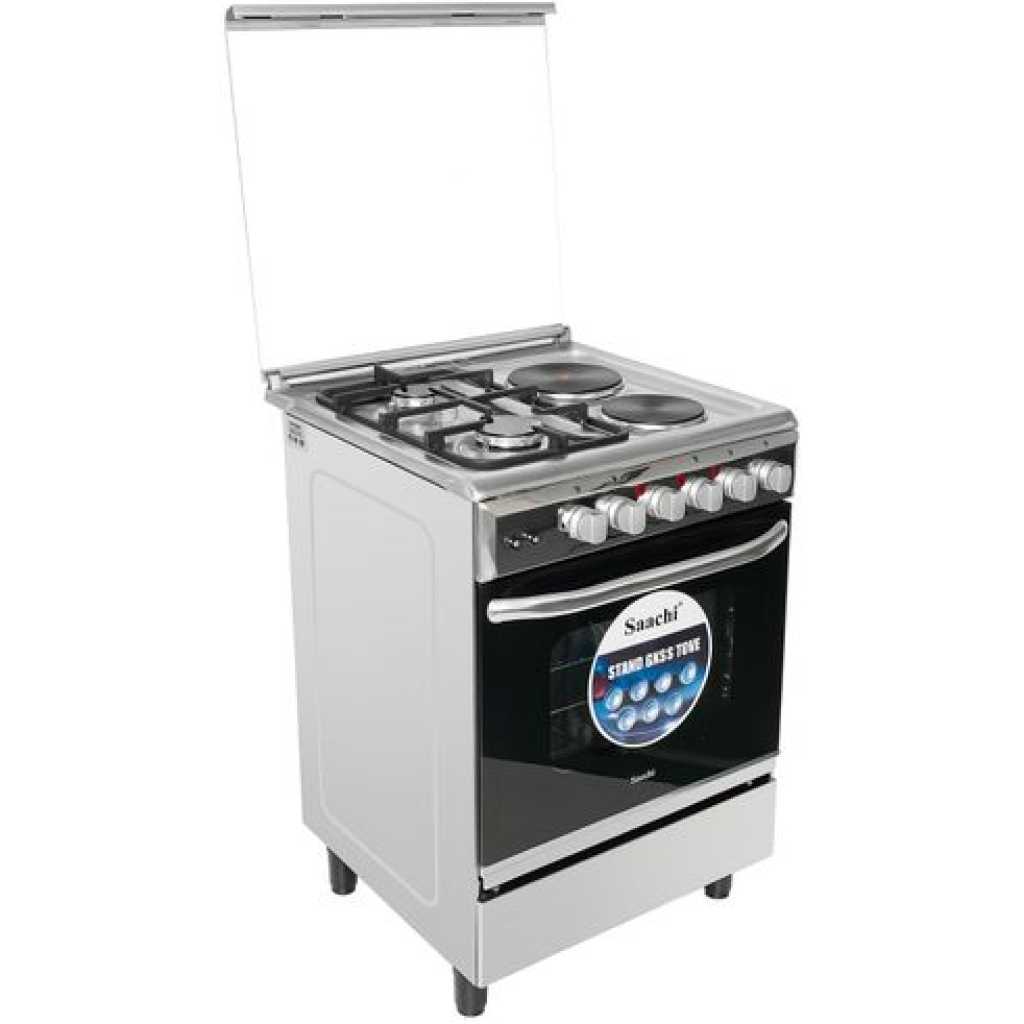 Saachi Cooker 2 Gas Burners + 2 Electric Plates 60x60cm NL-6366HPE, Electric Oven & Grill, Rotisserie, Cast Iron Pan Supports – Silver. Experience versatile and efficient cooking with the Saachi 2 Gas & 2 Electric Cooker with Gas Oven NL-6366HPE (60X60cm) – Silver & Black. This modern and stylish cooker is designed to meet all your culinary needs. Whether you’re boiling, frying, baking, or grilling, the Saachi NL-6366HPE ensures you achieve delicious results with ease. The Saachi NL-6366HPE Cooker features 2 gas and 2 Electric cooker with a Gas Oven, allowing you to cook multiple dishes simultaneously. The gas burners provide instant heat and precise temperature control, making them ideal for a wide range of cooking techniques. This cooker also includes a spacious gas oven, ideal for baking, roasting, and grilling. The gas oven ensures even heat distribution for perfectly cooked meals every time. Please buy it from TilyExpress Uganda today. The oven door features a transparent window, allowing you to monitor your dishes without opening the door and losing heat. Designed for convenience and durability, the Saachi NL-6366HPE boasts a robust construction with a sleek black & Silver finish, adding a touch of elegance to any kitchen. The easy-to-clean surfaces and removable burner caps make maintenance a breeze, while the integrated safety features, such as flame failure protection, ensure safe operation. Enhance your cooking experience with the Saachi NL-6366HPE 2 Gas & 2 Electric Cooker. Combining versatility, efficiency, and stylish design, this cooker is the perfect addition to any kitchen, making meal preparation easier and more enjoyable. Features Stainless Steel Worktop With Brass Burner Cap Glass Top 2 Gas Burners 2 Electric ( Hot plates ) 4 Stages Oven Heating Oven Lamp Baking Tray Oven Grill Oven Rottisserie Model No: NL-6366HPE Gas Type: LPG Gas pressure: 2800pa Color: Stainless Steel Gross weight: 24kgs Net Weight: 22kgs Measurements Voltage: AC 220-240 Frequency:50/60Hz