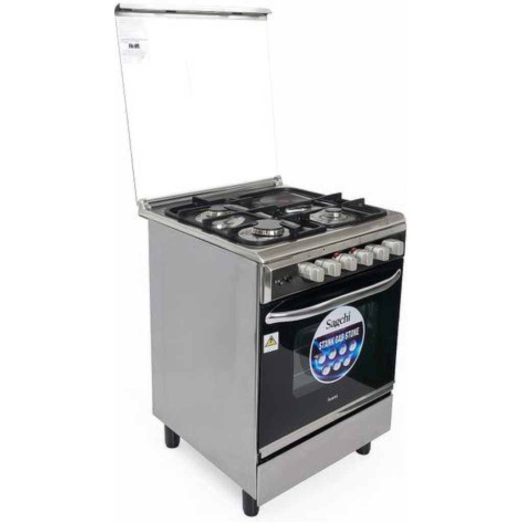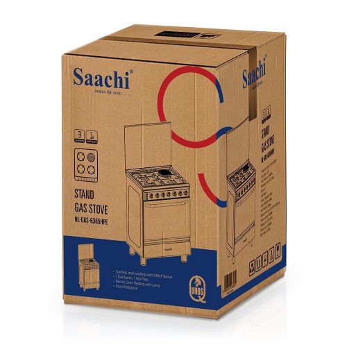 Key Features: Saachi Cooker 3 Gas Burners + 1 Electric Plate 60x60cm NL-6365HPE, Electric Oven & Grill, Rotisserie, Cast Iron Pan Supports – Silver. Stainless Steel Worktop With Brass Burner Cap Glass Top Cast Iron Pan Supports 3 Gas Burners 1 Electric ( Hot plate ) 4 Stages Oven Heating Oven Lamp Baking Tray Oven Grill Oven Rottisserie Model No: NL-6365HPE Gas Type: LPG Gas pressure: 2800pa Color: Stainless Steel Gross weight: 24kgs Net Weight: 22kgs Measurements Voltage: AC 220-240 Frequency:50/60Hz