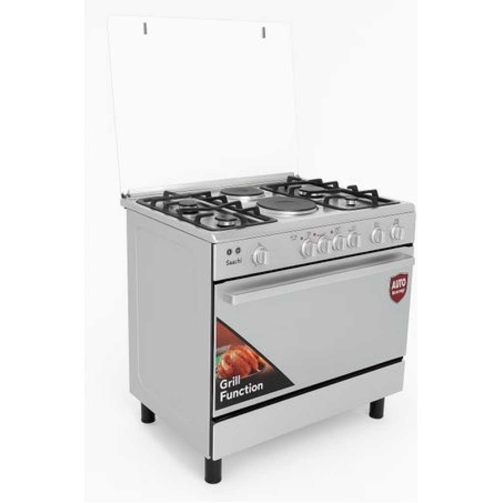Saachi Cooker 90x60cm, 4 Gas Burners + 2 Electric Plates, Electric Oven & Grill, Oven Fan, Rotisserie, Automatic Ignition NL-GAS- 6364SS – Silver. Model: NL-GAS-6364SS Brand: Saachi Size: 90 x 60 cm Burners: 4 Gas + 2 Electric Plates Ignition: Auto Ignition (for gas burners) Oven Type: Electric with Grill Color: Silver Material: Stainless Steel Rotisserie 2 Trays Oven Lamp Timer & Temperature Control Knobs Top Glass 4 Stages Oven heating Storage compartment Double-layer glass oven door Oven Fan Matt finishing Key Features: Saachi Cooker 90x60cm, 4 Gas Burners + 2 Electric Plates, Electric Oven & Grill, Oven Fan, Rotisserie, Automatic Ignition NL-GAS- 6364SS – Silver. Model: NL-GAS-6364SS Brand: Saachi Size: 90 x 60 cm Burners: 4 Gas + 2 Electric Plates Ignition: Auto Ignition (for gas burners) Oven Type: Electric with Grill Color: Silver Material: Stainless Steel Rotisserie 2 Trays Oven Lamp Timer & Temperature Control Knobs Top Glass 4 Stages Oven heating Storage compartment Double-layer glass oven door Oven Fan Matt finishing