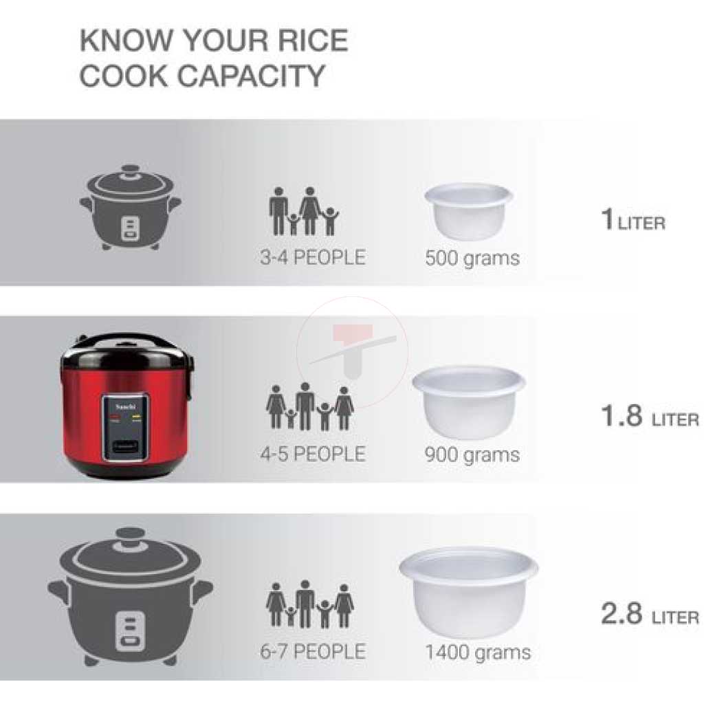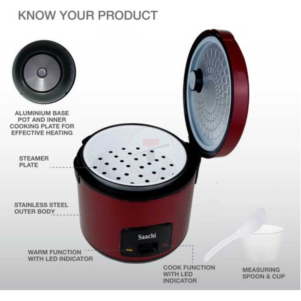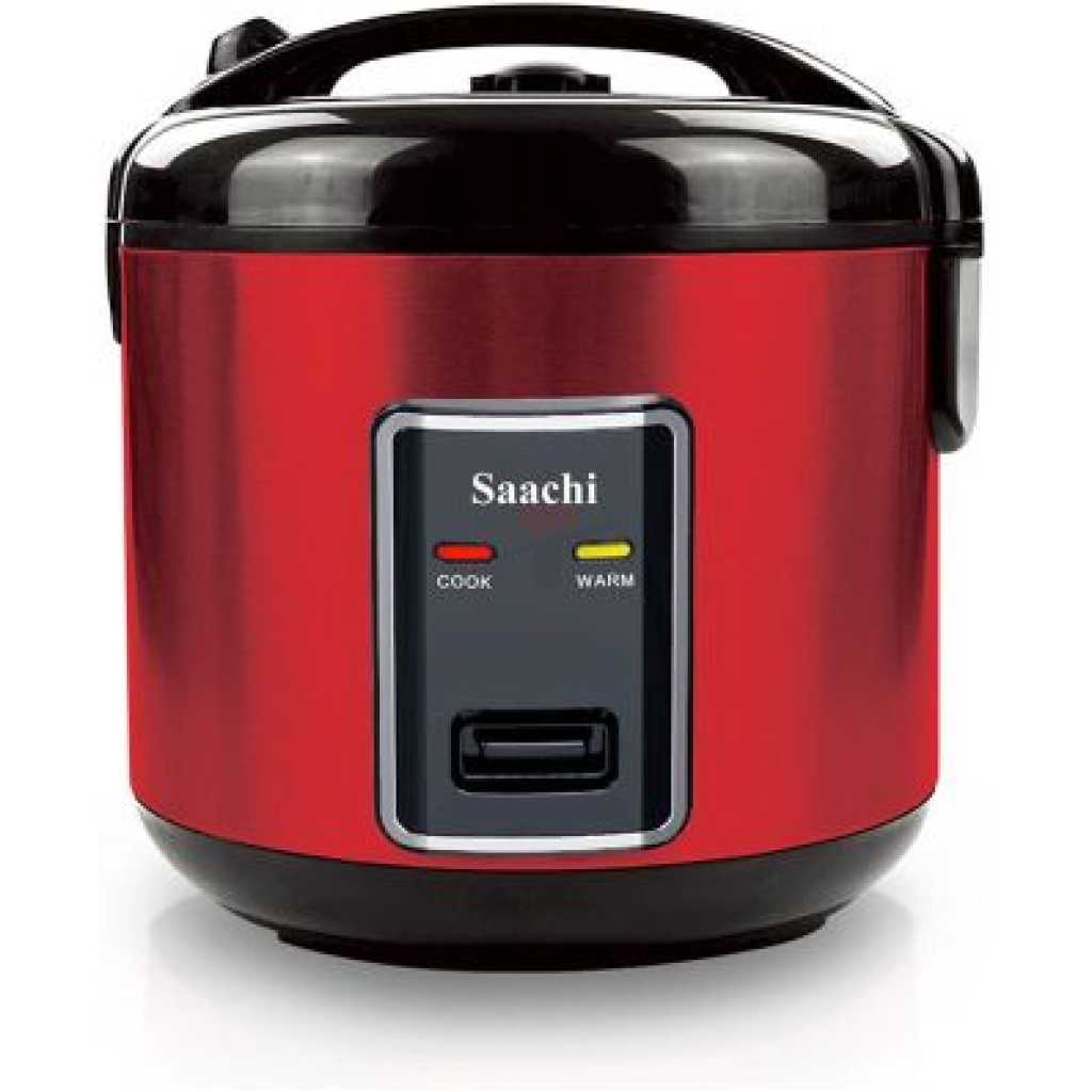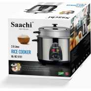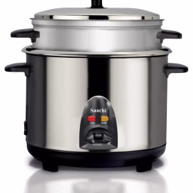 Saachi 1.8 litres Electric Rice Cooker With Steamer Saucepan This Rice Cooker comes with a capacity of 1.8L which is more than sufficient to cook your daily meals. The steam basket allows you to steam a variety of meats and vegetables, cooking them in a healthy and efficient manner. The keep-warm function ensures your food is kept nice and warm once it has been cooked until it’s time for your meal. The locking mechanism in this appliance prevents any overflow and makes it a safe appliance to use. Extra large capacity of 1.8 litres can cook up to 8 cups of rice Aluminium alloy pot is strong, thermal efficient and easy to clean Steam basket helps cook vegetables, meat and poultry Versatile uses include cooking for all kinds of rice, Steam vegetables, soup etc. Thermostatic control maintains an even temperature for perfectly cooked rice overflow proof. Scald-proof one-touch operation lets you simply depress the cook button to begin the full cook/keep warm cycle automatic Keep warm function begins as soon as cooking ends Power:- 900W Voltage: AC 220-240V Frequency:- 50/60Hz Key Features: Saachi 1.8 litres Electric Rice Cooker With Steamer Saucepan 1.8-litre capacity Steam function Automatic keep-warm function Aluminum alloy coated non-stick inner pot Thermostatic control