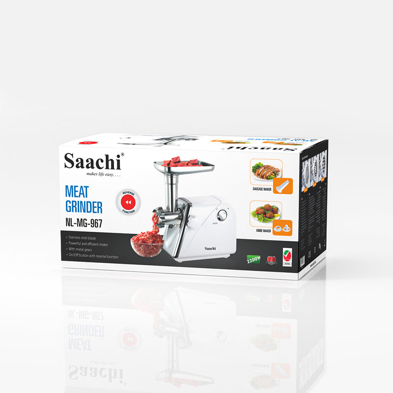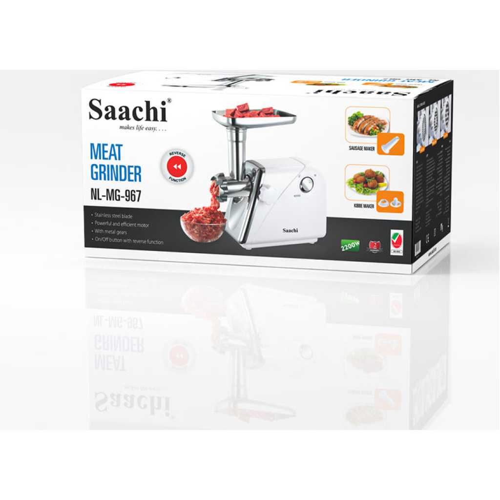 The new Saachi Meat Grinder NL-MG-967 is here to take your meat preparation to a whole new level. Whether you’re looking to make sausages, kibbeh or a simple food pusher, this product has you covered. It comes with varying 3mm,… Features – ON/OFF and reverse function – Powerful and efficient motor – Motor circuit breaker – Stainless steel cutting blade – Easy remove grinder head – Detachable aluminum tube – Front panel with chrome – With fasten button to lock head. – Attachments: With 3pcs metal cutting plates, sausage accessory, kibbeh attachment and food pusher – Non slip rubber feet – Low noise Key Features: – ON/OFF and reverse function – Powerful and efficient motor – Motor circuit breaker – Stainless steel cutting blade – Easy remove grinder head – Detachable aluminum tube – Front panel with chrome – With fasten button to lock head. – Attachments: With 3pcs metal cutting plates, sausage accessory, kibbeh attachment and food pusher – Low noise