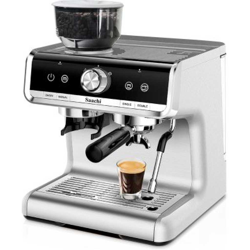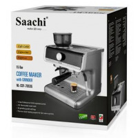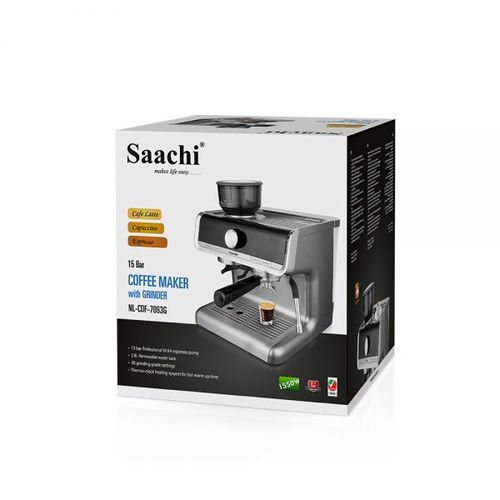 Cuppucino, Coffee Maker With Grinder And 15 Bar Espresso Pump, Silver. Bored of plain old coffee? Looking for a little more variety? You got it! The new Saachi coffee maker NL-COF-7063 can make many different styles of coffee including espresso, cappuccino, and many others with 30 grinding grade settings. The steam nozzle allows you complete control over the amount of froth you desire in your coffee. The keep-warm tray on top of the appliance allows you to keep a cup of coffee warm while you prepare to make another one, handy when entertaining guests. Key Features: Easy make espresso and cappuccino Can be used to make all kinds of coffee from espresso, latte macchiato, cappuccino, Americano and café crème 30 grinding grade settings and coffee powder quantity can be set individually Professional espresso pump (15 bar) 2.8 liters removable water tank Aluminum dies casting 58mm brewing funnel with 2 optional filters Single and double cup brewing Electrostatic system prevents powder splashing Thermo-clock heating system for fast warm up time With PID intelligent temp control for more accurate and stable temperature, the temperature inside the funnel can be controlled within the range of ±2°C Integrated hot water function for café Americano, café crème or tea Accessories included: Professional espresso tamper, single-walted filter insert for 1 and 2 cups, 460mlmilk frothing can, cleaning tool