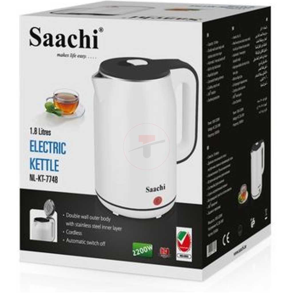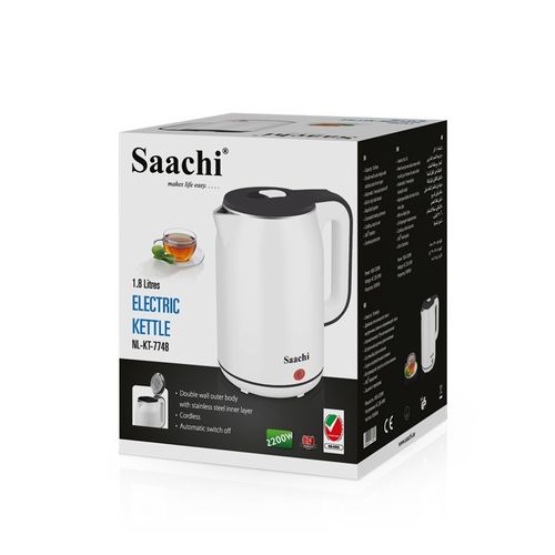 Saachi NL-KT-7748 1.8L Electric Kettle – White & Black. Saachi Electric Kettle NL-KT-7748 is a smart and efficient appliance for everyday use. The inner water level indicators allow you to easily analyze how much water has been entered into the kettle. The automatic shut-off function turns off the appliance once the water has been boiled. The kettle is cordless, detachable from the base, making it easy to use when pouring into a cup or glass. Finally, the elegant white and steel design makes it a great appliance to have in your kitchen. Features– 1.8 litres capacity– Double wall outer body with stainless steel inner layer– Automatic/manual switch off– Built in dry-boil sensor– Rapid boil system– Concealed heating element– Cordless, easy to use– 360 degree rotation– Overheat protection Key Features: Saachi NL-KT-7748 1.8L Electric Kettle – White & Black. 1.8 litres capacity Double wall outer body with stainless steel inner layer Automatic/manual switch off Built in dry-boil sensor Rapid boil system Concealed heating element Cordless, easy to use 360 degree rotation Overheat protection