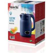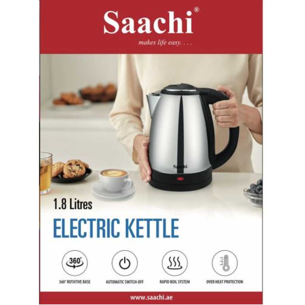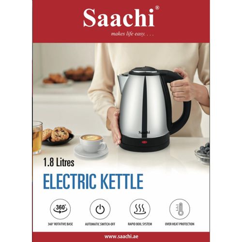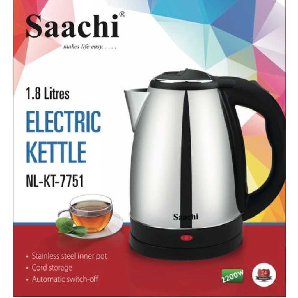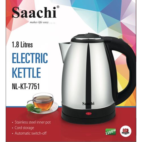 Key Features: Saachi Original 1.8L Stainless Electric Kettle NL-KT-7751 – Silver, Black. 1.8 liters Detachable jag Power base Water level indicator Auto switch when ready Hinged lid 220-240V
