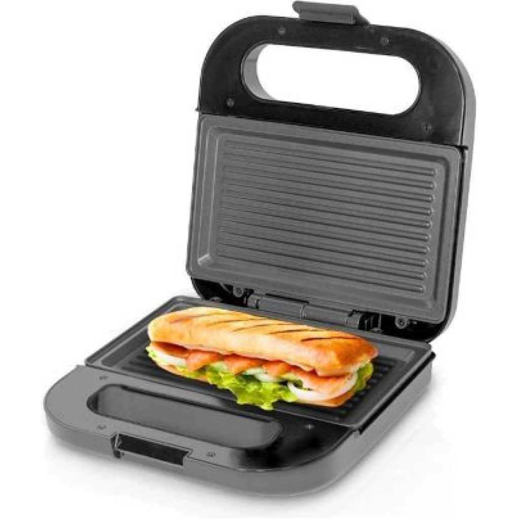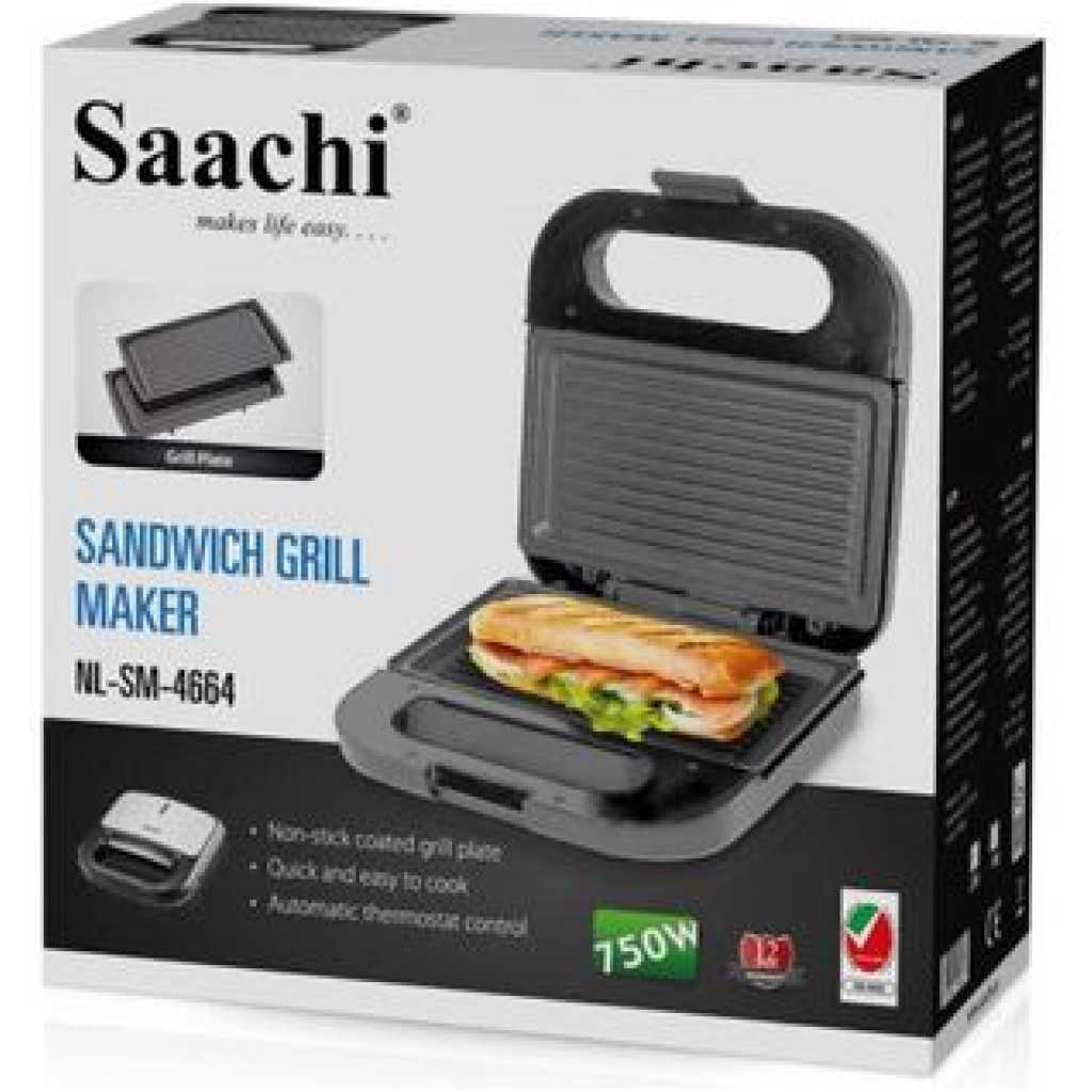 Saachi Sandwich Maker / Grill NL-SM-4664-BK. The Saachi Sandwich Maker/Grill, NL-SM-4664, can make up to sandwiches and grill meat/vegetables to your preference. The automatic thermostat with indicator lights allows you to go about the rest of your tasks until the green light notifies you that your sandwich is ready. The non-stick plates prevent a mess from being formed in the sandwich maker enabling you to enjoy a delicious meal stress-free. Finally, the locking mechanism ensures safety while the sandwich maker is on, making it a safe product to use around children. Key Features: Saachi Sandwich Maker / Grill NL-SM-4664-BK. – Non – stick coated grill plate – Automatic thermostat control – Plate size 22.4 x 12.5cm – Quick and easy to cook – Cool touch handle with lock – Pilot light indicator – Non-slip rubber feet – Vertical storage – Stainless steel cover – Injection of black body.