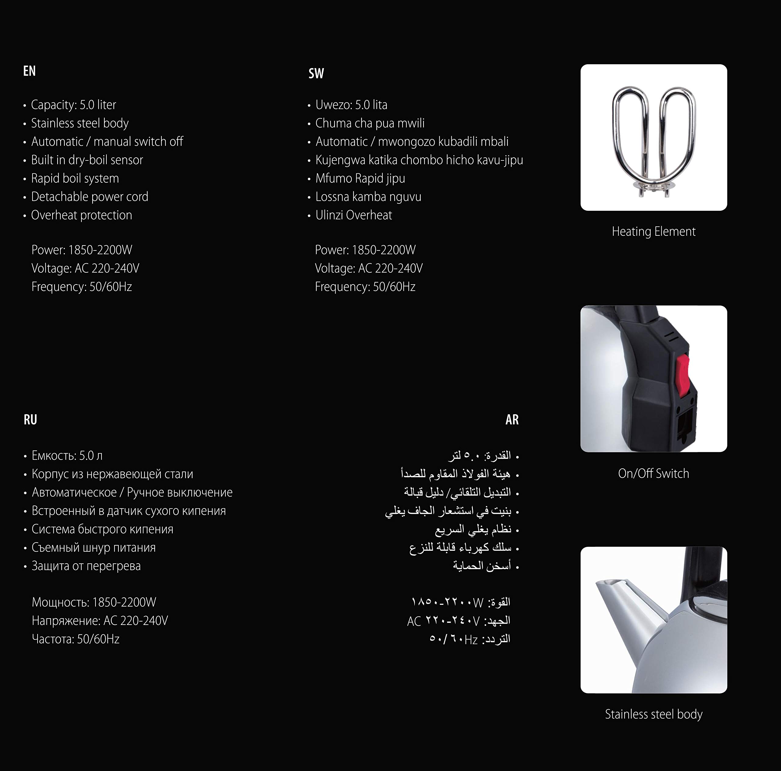 Capacity : 5.0 liter. Stainless steel body. Automatic / manual switch off. Built in dry-boil sensor. Rapid boil system. Concealed heating element. Detachable power cord. Overheat protection. Power:- 1850-2200W. Voltage:-AC 220-240V. Frequency:-50/60Hz. Gallery Product Image Gallery Key Features: Capacity : 5.0 Litre Stainless steel body Automatic / manual switch off Built in dry-boil sensor Rapid boil system Concealed heating element Detachable power cord Overheat protection Power:- 1850-2200W Voltage:-AC 220-240V