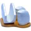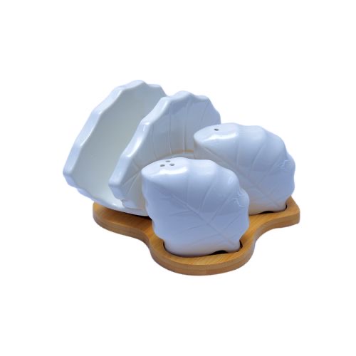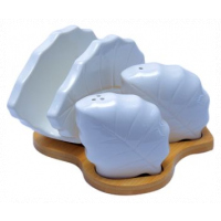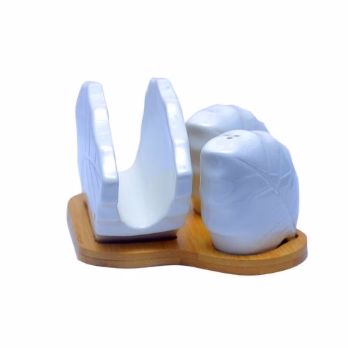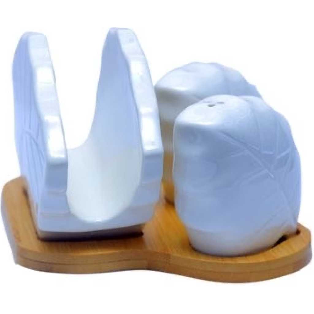 Salt and Pepper Shaker, Napkin Holder Set-White This salt and pepper shaker and napkin holder is a must have for every kitchen. Its ceramic and has a bamboo base.Napkins are a household essential. Keep them well within reach in this attractive holder. The simplicity of this design blends in with any decor. Key Features: Holds both paper and cloth napkins. 2 shakers for salt or pepper Cleaning and care: Dishwasher safe Material: Ceramic Affordable High quality