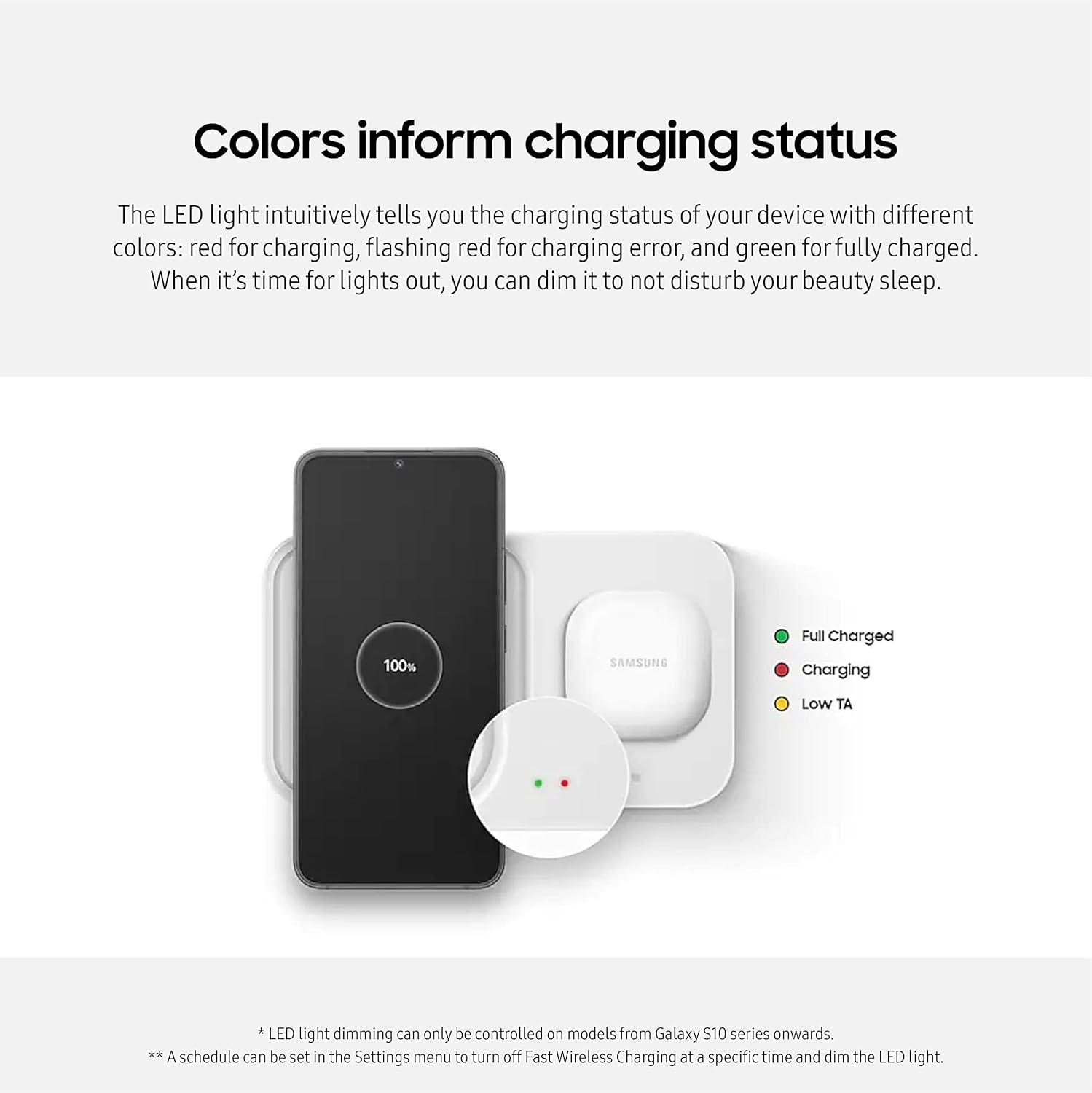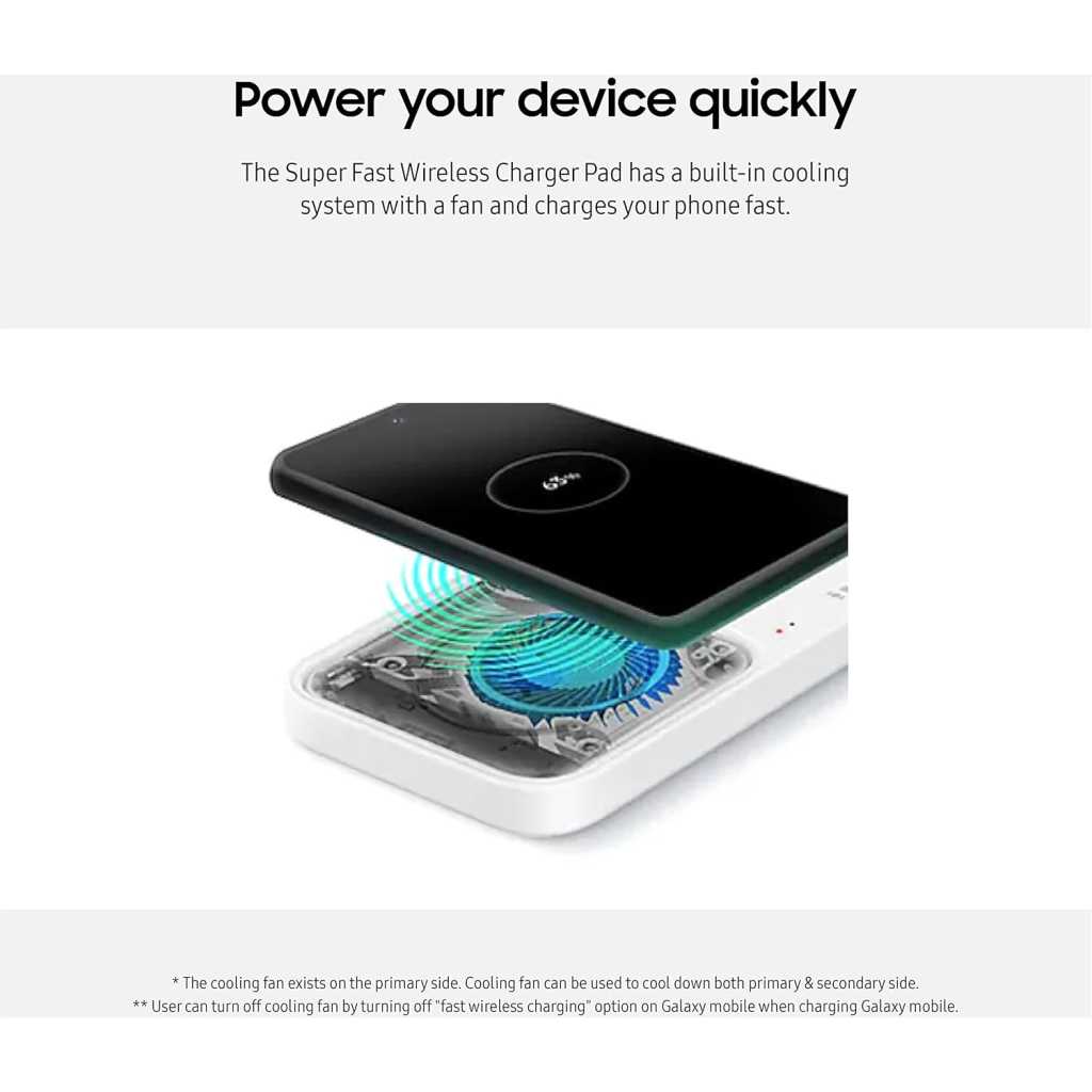 Key Features: SUPER FAST WIRELESS CHARGING: Get the charge you need quickly, thanks to up to 15W of Fast Charging support; This boost of battery is compatible with USB PD and Adaptive Fast Charging travel adapters for an easy pick-me-up* EASE OF USE & MULTI DEVICE CHARGING: Simultaneously power up your favorite pair of devices to enjoy together — whether that’s your phone and Galaxy Watch or your Galaxy Watch and earbuds DIRECT COOLING FAN: The Super Fast Wireless Charger Pad has a built-in cooling system with a fan and charges your phone fast** DEVICE DESIGN: Simply place the Wireless Charger where you want it; With a slim, smooth and compact design, it fits even in your smaller spaces, so it’s easy to access when your phone or earbuds need a little extra juice**** LED INDICATOR: LED light tells you the charging status of your device with different colors: red for charging, flashing red for charging error, and green for fully charged; When it’s time for lights out, you can dim it to not disturb your sleep*****