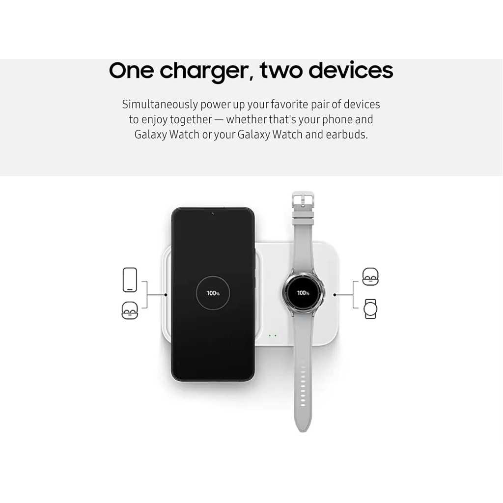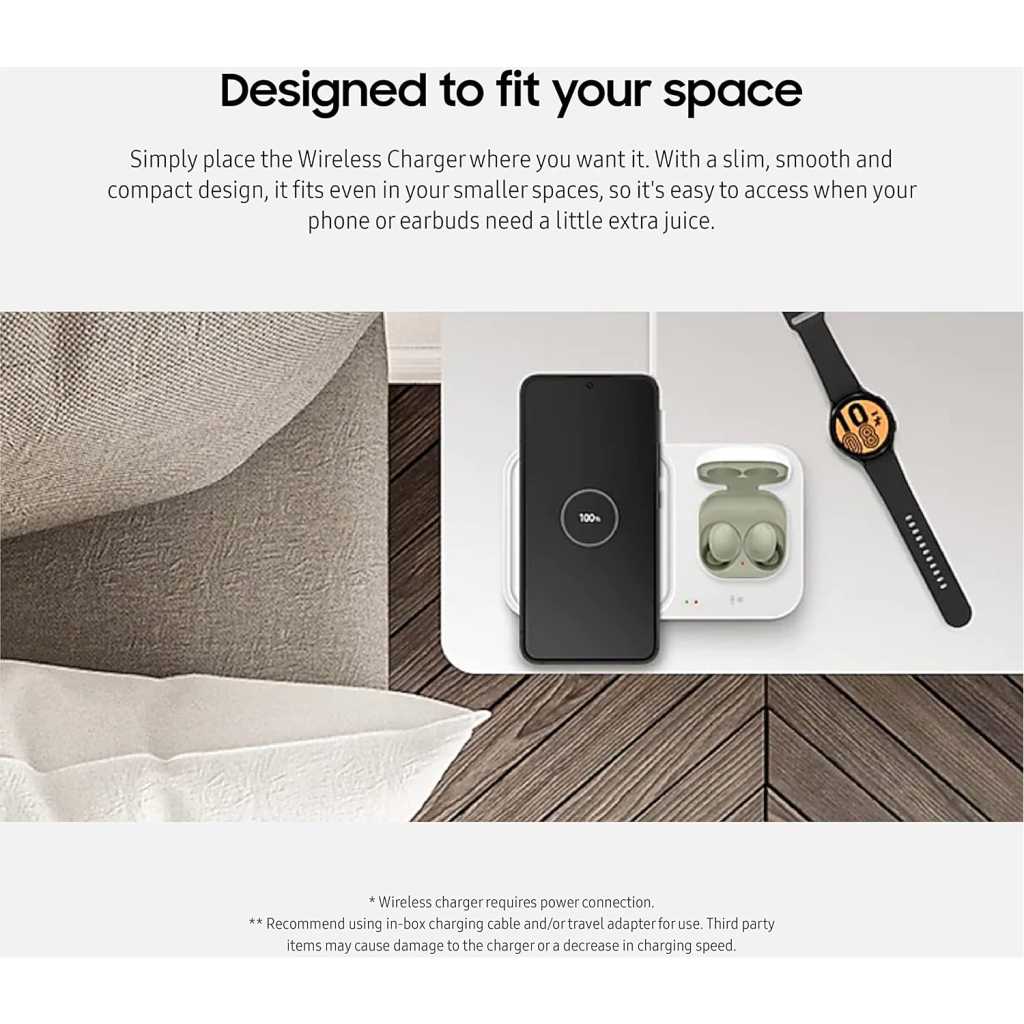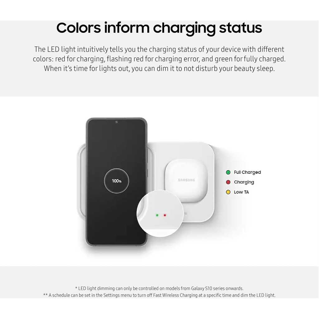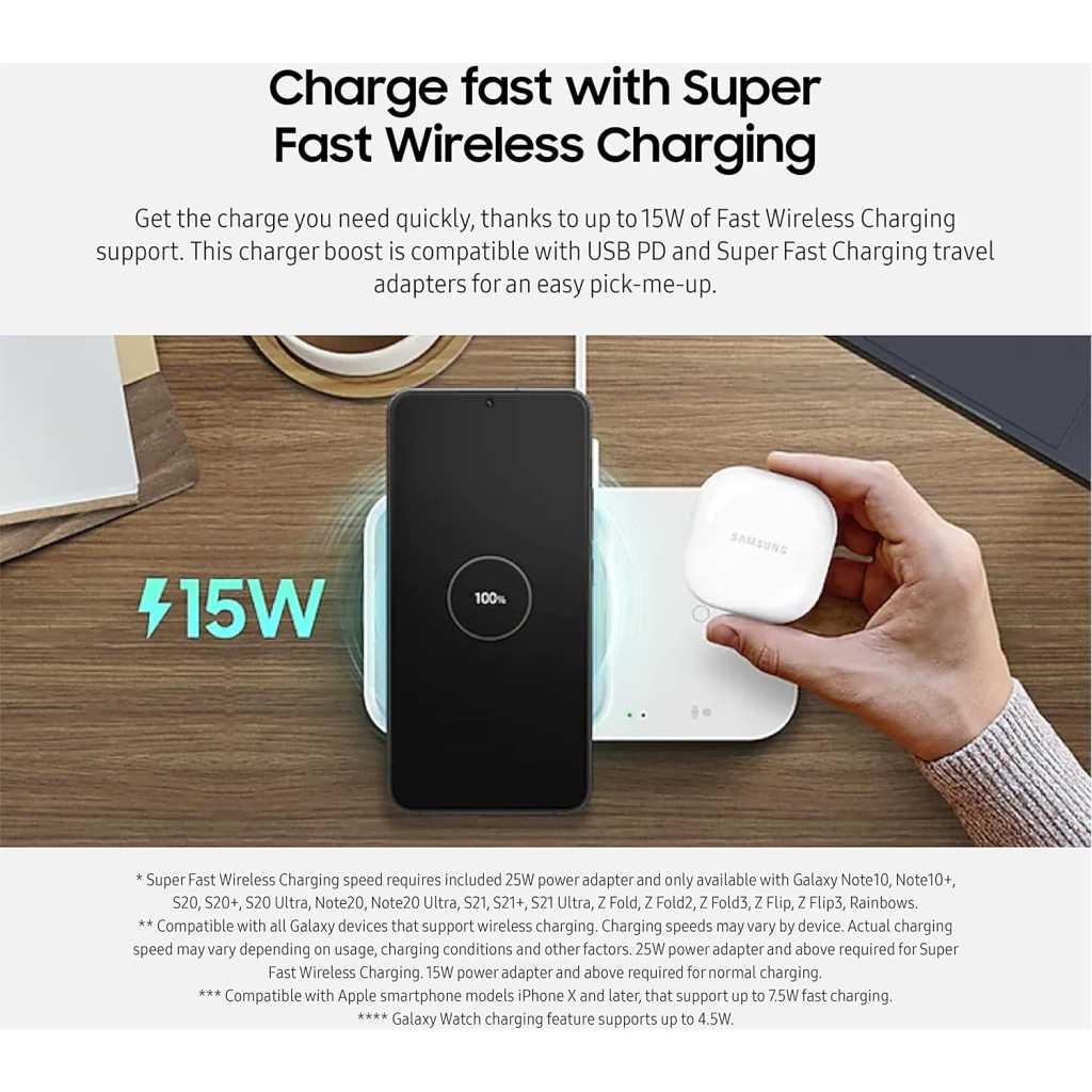 Get the charge you need quickly, thanks to up to 15W of Fast Wireless Charging support. This charger boost is compatible with USB PD and Super Fast Charging travel adapters for an easy pick-me-up.* Simultaneously power up your favorite pair of devices to enjoy together — whether that’s your phone and Galaxy Watch or your Galaxy Watch and earbuds.** The Super Fast Wireless Charger Pad has a built-in cooling system with a fan and charges your phone fast.*** Simply place the Wireless Charger where you want it. With a slim, smooth and compact design, it fits even in your smaller spaces, so it’s easy to access when your phone or earbuds need a little extra juice.**** The LED light intuitively tells you the charging status of your device with different colors: red for charging, flashing red for charging error, and green for fully charged. When it’s time for lights out, you can dim it to not disturb your beauty sleep.***** *Super Fast Wireless Charging speed requires included 25W power adapter and only available with Galaxy Note10, Note10+, S20, S20+, S20 Ultra, Note20, Note20 Ultra, S21, S21+, S21 Ultra, Z Fold, Z Fold2, Z Fold3, Z-Flip, Z-Flip3, S22, S22+, S22 Ultra. S23 Series, S24 Series. S25 Series. Compatible with all Galaxy devices that support wireless charging. Charging speeds may vary by device. Actual charging speed may vary depending on usage, charging conditions and other factors. 25W power adapter and above required for Super Fast Wireless Charging. 15W power adapter and above required for normal charging. Compatible with Apple smartphone models iPhone X and later, that support up to 7.5W fast charging. Galaxy Watch charging feature supports up to 4.5W. **The secondary part of this charger cannot charge a mobile phone and is only compatible with all Galaxy Buds and Galaxy Watch Active 1 and later watch models. ***The cooling fan exists on the primary side. Cooling fan can be used to cool down both primary & secondary side. User can turn off cooling fan by turning off “fast wireless charging” option on Galaxy mobile when charging Galaxy mobile. ****Wireless charger requires power connection. Recommend using in-box charging cable and/or travel adapter for use. Third party items may cause damage to the charger or a decrease in charging speed. *****LED light dimming can only be controlled on models from Galaxy S10 series onwards. A schedule can be set in the Settings menu to turn off Fast Wireless Charging at a specific time and dim the LED light.