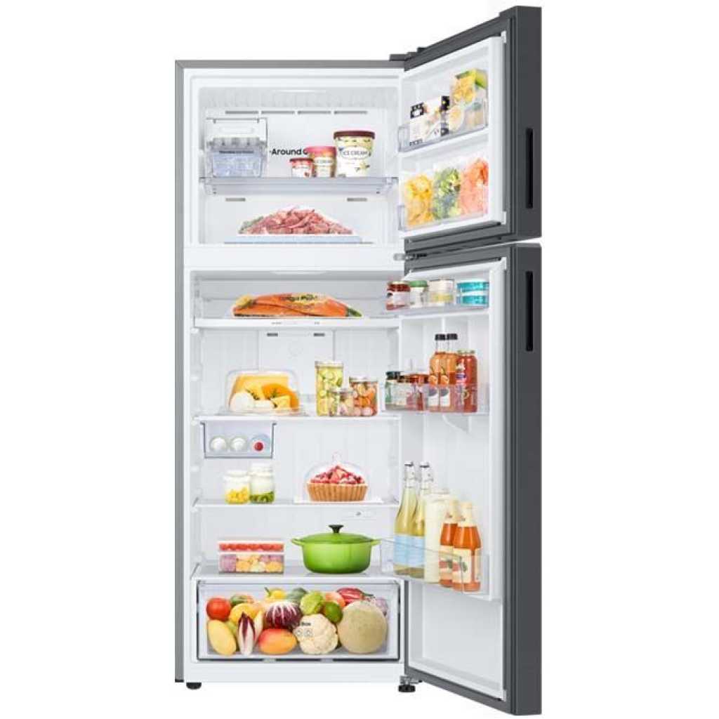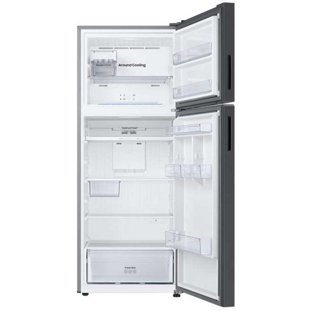 Samsung Refrigerator TMF, Space Max,Cool Pack, 348 Ltrs, RT35CG5421S9/UT The Samsung RT35CG5421S9/UT refrigerator is a sleek and functional appliance designed to meet the diverse cooling needs of modern households. With a total capacity of approximately 350 liters, it offers ample space for storing groceries, beverages, and frozen items. The refrigerator compartment features customizable shelves and door bins, providing flexibility to organize items of different shapes and sizes. Equipped with Twin Cooling Plus technology, this fridge maintains optimal humidity levels in both the fridge and freezer sections, keeping food fresh for longer periods and preventing odor transfer between compartments. Its digital inverter compressor ensures quiet operation and energy efficiency, while the LED lighting illuminates the interior for easy visibility of contents. Additionally, the fridge comes with convenient features such as a door alarm to alert users of open doors and a power freeze function for rapid freezing of items. With its combination of storage versatility, advanced cooling technology, and user-friendly features, the RT35CG5421S9/UT refrigerator offers reliable performance and enhances the convenience of food storage and preservation in any home.