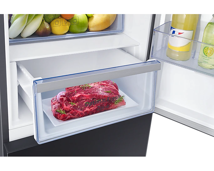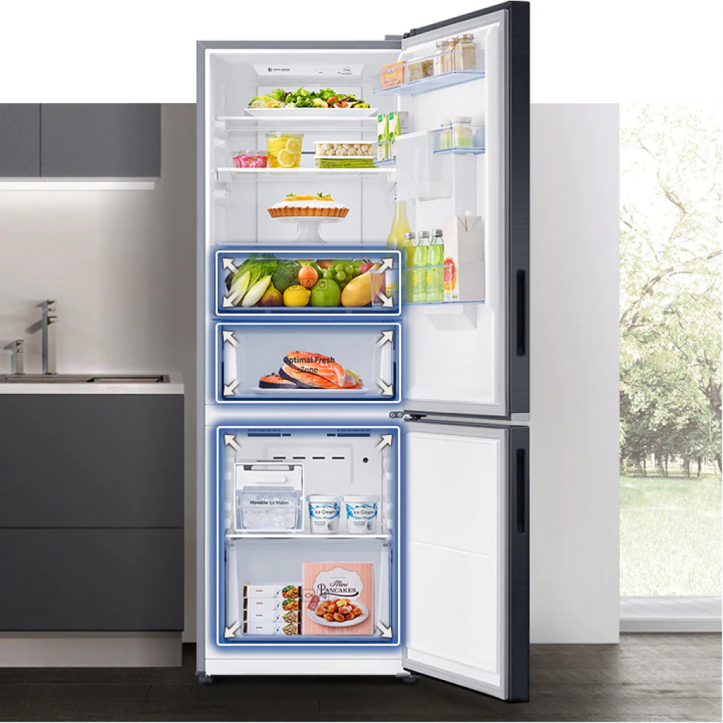 Samsung 370-liter Refrigerator with Dispenser RB37N4160B1 – Double Door Fridge, Bottom Mount Freezer, Frost Free Gross capacity: 370 litres Net Capacity: 290 litres Frost-free Digital inverter compressor Interior LED lighting in fridge compartment Separate freezer temperature control Power cool function Deodorizing filter Tempered glass shelves LED lighting