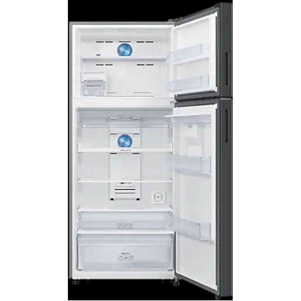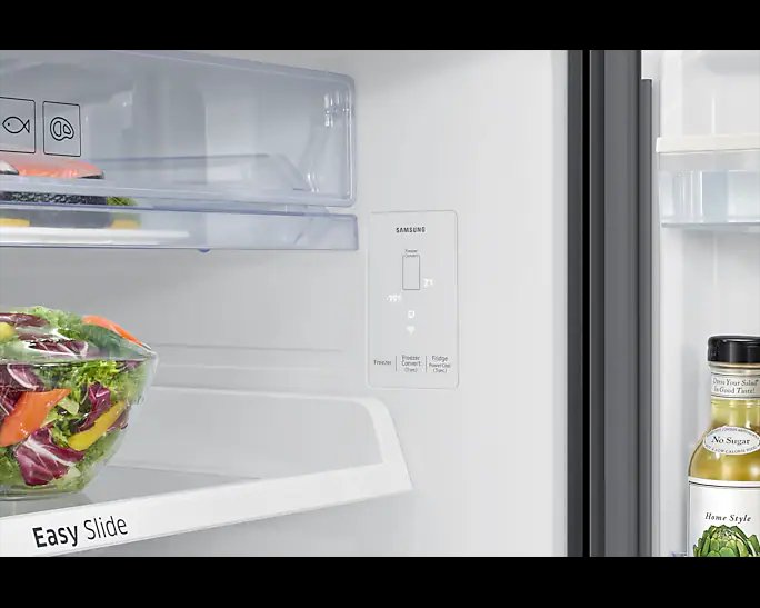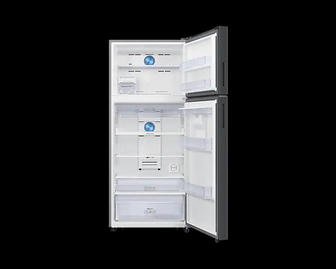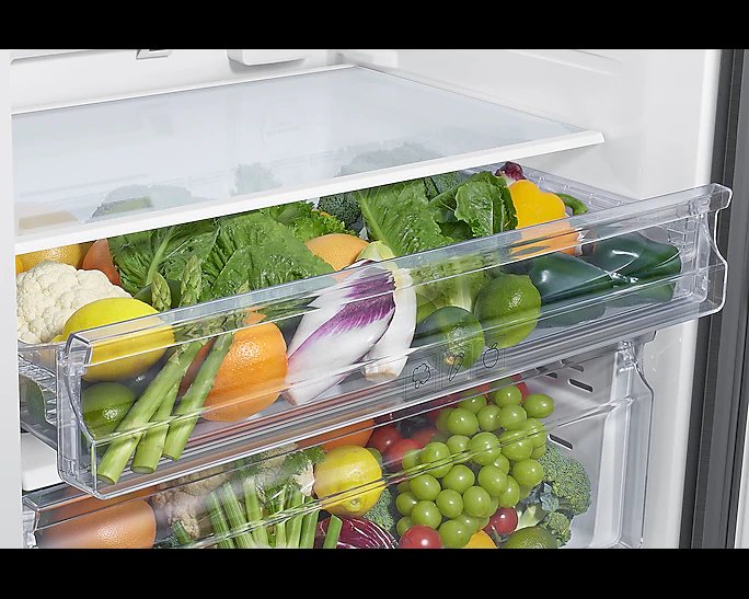 Samsung 528L 3 Star Frost, Top Mount Fridge, RT53DG7B60B1UT SmartThings & AI Energy Saving Mode Manage your energy usage to reduce your carbon footprint and save money. SmartThings Energy* provides energy efficiency tips. It also monitors the energy consumption of appliances** in real-time and compares it to the previous month. * Available on Android and iOS devices. A Wi-Fi connection and a Samsung account are required. ** SmartThings Energy currently works with around 40 Samsung home appliances that are SmartThings enabled. These include refrigerators, washing machines, clothes dryers, dish washers, air conditioners, air purifiers, vacuum cleaners, ovens, hoods, cooktops, microwave ovens, TVs (from June 2022) and energy meters. Twin Cooling Plus™ System Twin Cooling Plus™ technology cools the fridge and freezer compartments separately with two independent cooling systems, creating an optimal environment for keeping food fresh longer with 70% humidity, compared to 30% in a conventional top mount freezer*. Food odours can change the taste of frozen foods and affect the flavors of finished dishes. Twin Cooling Plus™ is a truly independent cooling system, with separate airflows in both the fridge and freezer. * Based on internal testing comparing Samsung models RT22SCSW2 and RT5000K. Active Fresh Filter Keep the fridge clean and hygienic, reducing the risk of food being contaminated. An Active Fresh Filter eliminates 99.99% of harmful bacteria**. ** Witnessed by Intertek. 99.9% of Staphylococcus Aureus and Escherichia Coli. Smart Conversion Enjoy the convenience of having 5 different conversion modes to choose from. Easily convert your freezer into a fridge at a push of a button, ideal for when you need more space to store your fresh food. Or simply switch off the fridge compartment when leaving your home for a long vacation to conserve energy. Power Cool / Power Freeze It blows intensely cold air into the fridge to quickly cool your groceries or favorite drinks. Power Freeze delivers a fast blast of cold air into the freezer, ideal for freezing or firming up frozen food and making ice. Features Spec