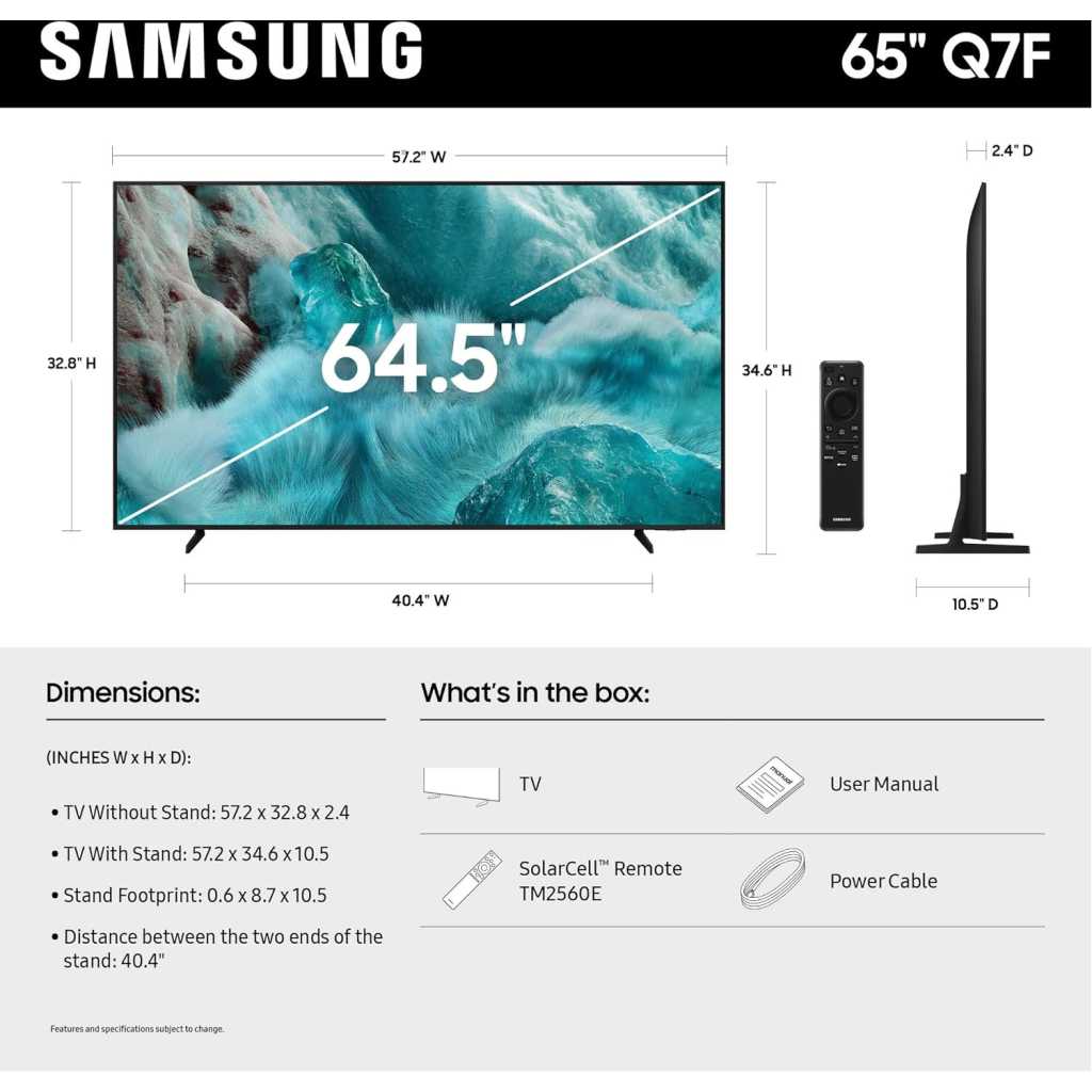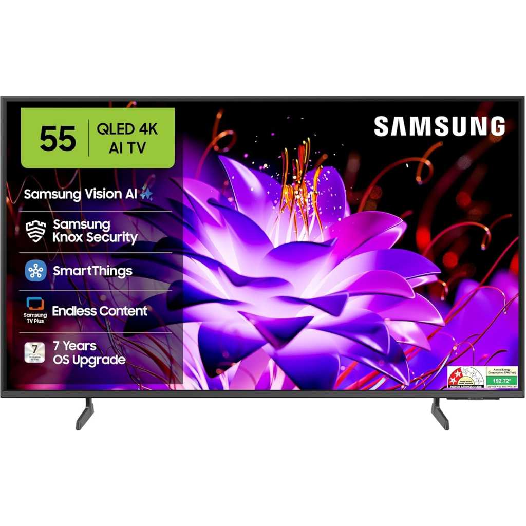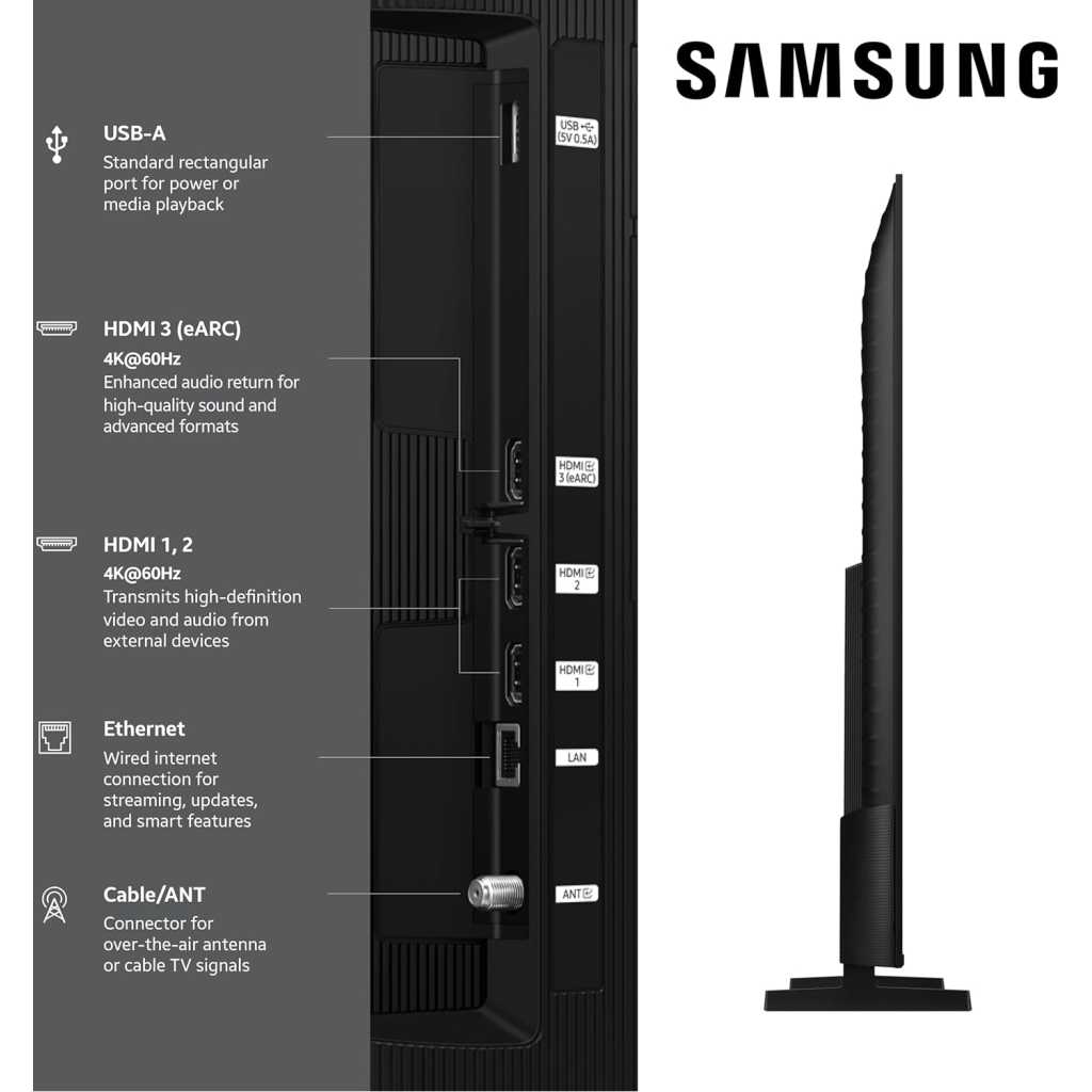 Key Features: POWERS DRAMATICALLY CLEAR COLOR AND SOUND: Enjoy your movies and shows in stunning 4K, regardless of the source resolution. Plus, get the most out of what you’re watching with AI-optimized color boosted picture and audio quality, enhanced accordingly to the type of content* OVER A BILLION COLORS THAT STAY TRUE EVEN IN THE BRIGHTEST SCENES**: Appreciate every beautiful shade of color with incredible precision. The nano-sized Quantum Dots can display the entire color spectrum,* so you can admire billions of shades at any brightness level. SECURES PERSONAL DATA*** WITH TRIPLE-LAYER PROTECTION: Your TV experiences are secured. Samsung Knox Security defends against harmful apps and phishing sites while keeping sensitive data, such as PINs and passwords, secure. It also safeguards your IoT devices connected to your TV. A WORLD OF CONTENT AT YOUR FINGERTIPS, NO SUBSCRIPTION REQUIRED: Watch 2,700+ free channels including 400+ Samsung TV Plus premium channels and on free streaming apps. Enjoy national and local news, sports, movies and more. Explore new content being added regularly. BRINGS OUT DETAILS AND CONTRAST WITH DEEP BLACKS AND BOLD CONTRAST: Reveal hidden details with deep blacks and vibrant brights. The dynamic tone mapping of HDR10+ enhances contrast, delivering vibrant imagery and ensuring all meaningful details stand out.