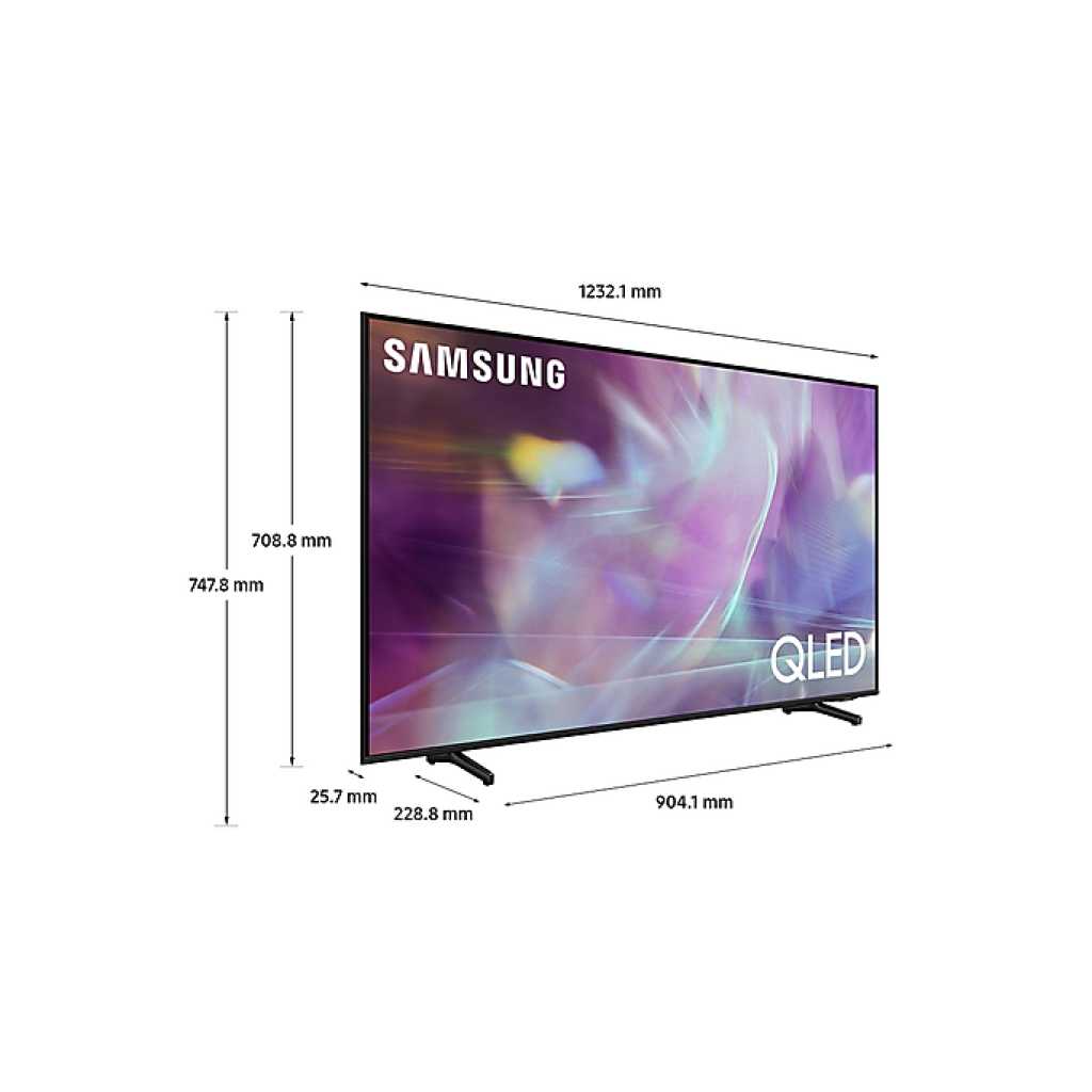 Key Features: Samsung 55” QLED 4K Smart TV QA55Q60A, Dual LED, Quantum HDR, Lite Processor With Inbuilt Digital Receiver – Black. QLED TV. 55-inch TV. Dual LED TV. 100% Color Volume with Quantum Dot Built-in Free to air decoder. Optimized backlight color tone for enhanced contrast. Quantum HDR brings out the detail and contrast. Samsung’s powerful processor optimizes sound quality according to the viewing content. A virtual sound that tracks the action. Adaptive sound has audio scenic intelligence that optimizes sound based on real-time scene analysis by content type. Mind-blowing slim design that you’ve never seen before in this category, making your TV blend into the wall seamlessly. Adjustable TV Stands. Super ultrawide Game View & game bar. Ambient mode. Series 6. Resolution : 3,840 x 2,160. Supreme UHD Dimming. Dolby Digital plus Audio. 2ch speakers. Bluetooth. 3 HDMI ports. 2 USB Ports. Ethernet port. WifI Built-in. 1-year manufacturer warranty.