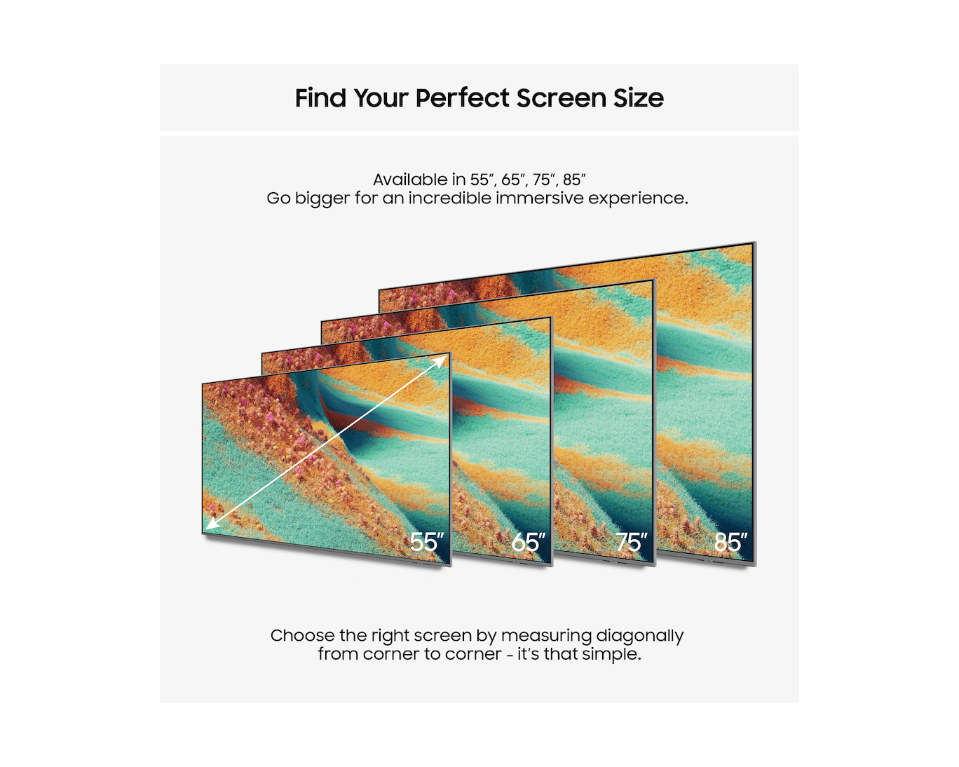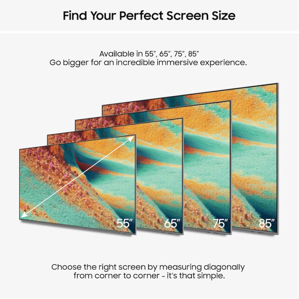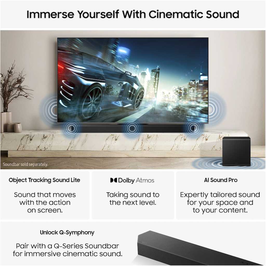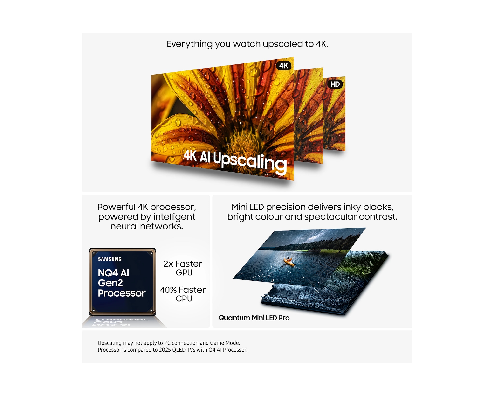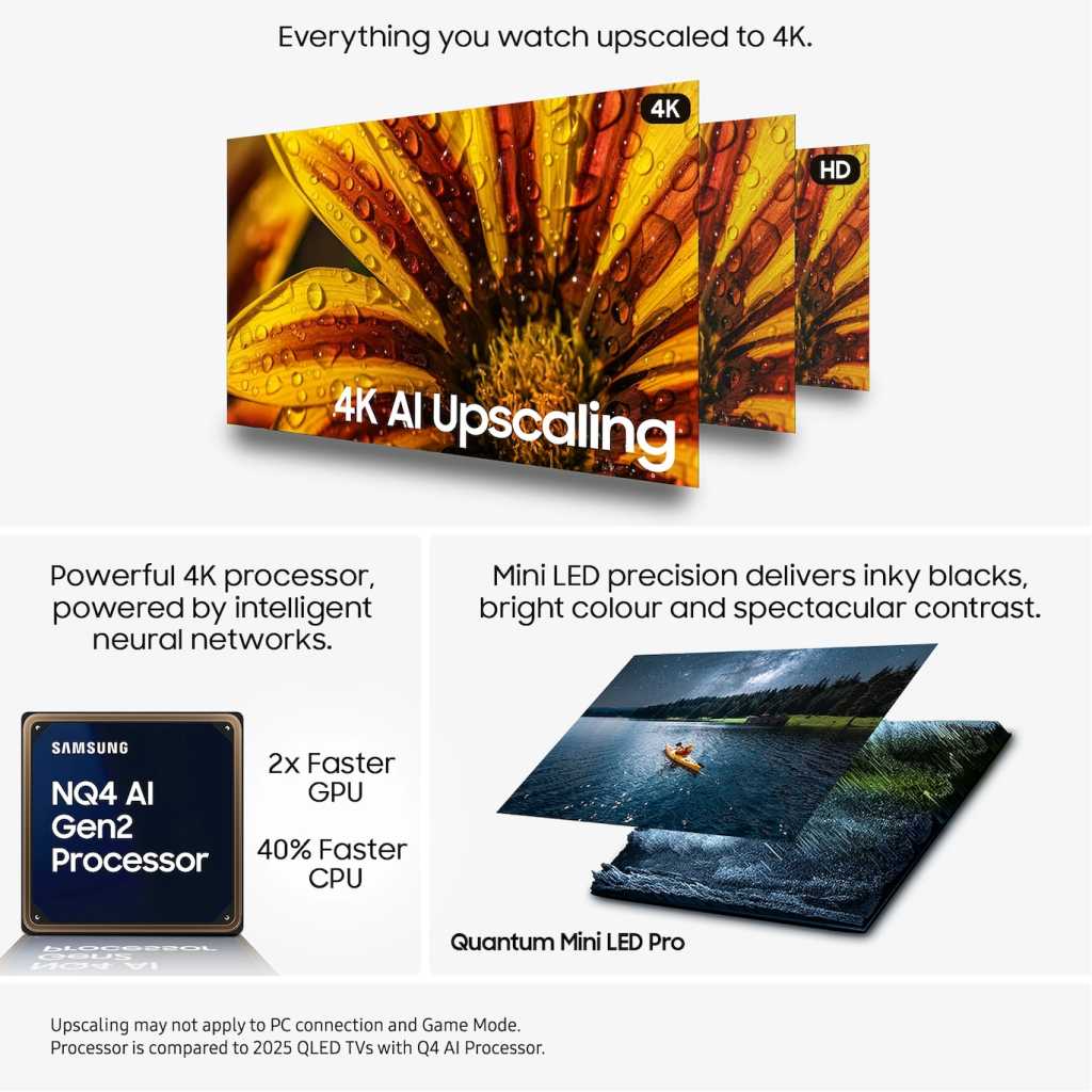 Highlights Key Features: NQ4 AI Gen2 PROCESSOR: Feel the full power of AI in 4K. This processor uses the power of 20 AI neural networks to optimize picture and sound quality. The result is superb performance, whether you’re streaming OTT services, playing your favorite video games or watching live sports. QUANTUM MATRIX TECHNOLOGY PLUS: Catch every detail with accurate, ultra-fine light control. Precise control over Quantum Mini LEDs allows you to enjoy great detail in both the darkest and brightest scenes. DOLBY ATMOS: A next level Dolby Atmos experience. Enjoy a next-level surround sound experience that immerses you deep inside the action. With Dolby Atmos, it delivers multi-dimensional audio for unbelievably realistic sound. NEO QUANTUM HDR+: Elevate 4K viewing with superb brightness and vivid colors. Elevate your viewing pleasure with superb brightness and dynamically adaptive scenes in 4K resolution. Neo Quantum HDR+ is up to 2 times brighter than Neo Quantum HDR, delivering a more vivid color experience in a higher dynamic range like none other. PANTONE VALIDATED: Enjoy a full range of authentic colors. As a trusted symbol of color fidelity by industry experts, ‘PANTONE Validated’ certifies the accurate expression of 2,140 PANTONE colors and 110 newly-added skin tone shades. So you can be sure that you’re getting a rich, true-to-life viewing experience.