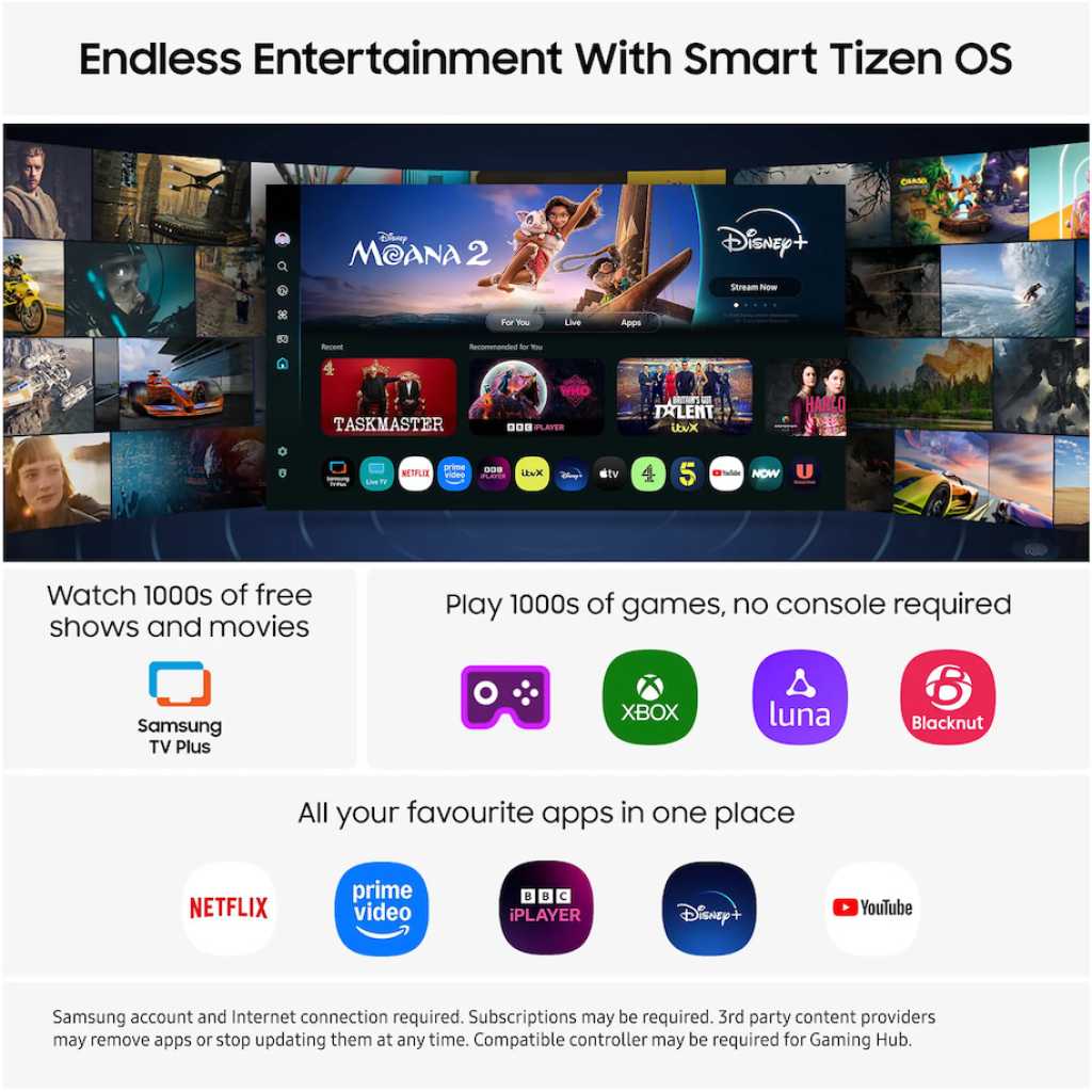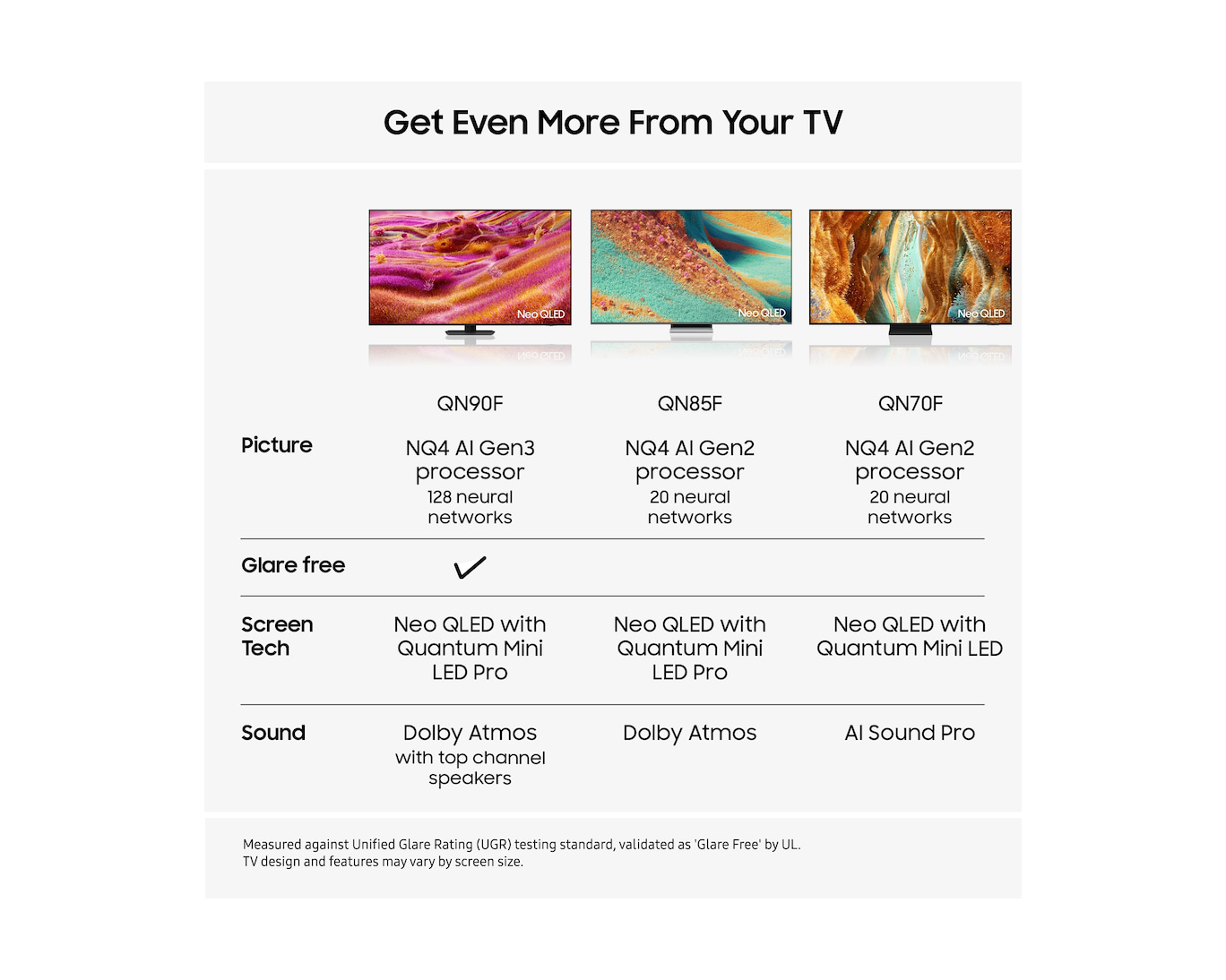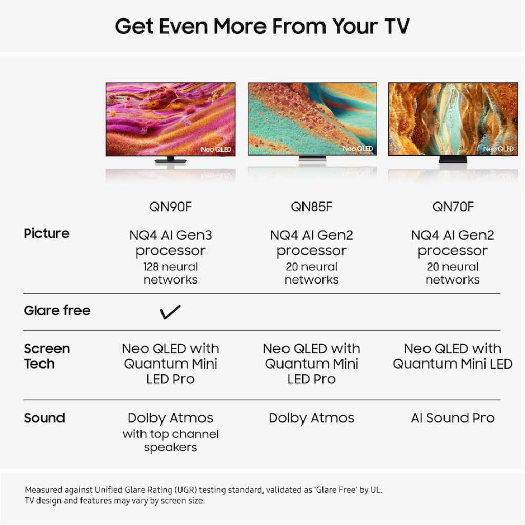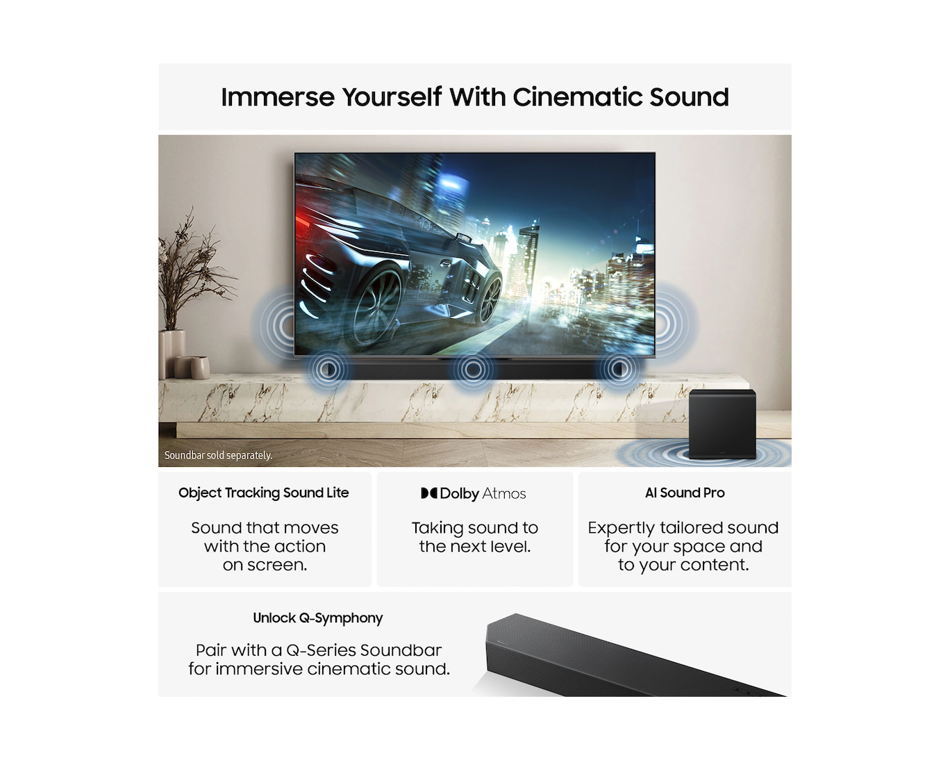 Highlights Key Features: NQ4 AI Gen2 PROCESSOR: Feel the full power of AI in 4K. This processor uses the power of 20 AI neural networks to optimize picture and sound quality. The result is superb performance, whether you’re streaming OTT services, playing your favorite video games or watching live sports. QUANTUM MATRIX TECHNOLOGY PLUS: Catch every detail with accurate, ultra-fine light control. Precise control over Quantum Mini LEDs allows you to enjoy great detail in both the darkest and brightest scenes. DOLBY ATMOS: A next level Dolby Atmos experience. Enjoy a next-level surround sound experience that immerses you deep inside the action. With Dolby Atmos, it delivers multi-dimensional audio for unbelievably realistic sound. NEO QUANTUM HDR+: Elevate 4K viewing with superb brightness and vivid colors. Elevate your viewing pleasure with superb brightness and dynamically adaptive scenes in 4K resolution. Neo Quantum HDR+ is up to 2 times brighter than Neo Quantum HDR, delivering a more vivid color experience in a higher dynamic range like none other. PANTONE VALIDATED: Enjoy a full range of authentic colors. As a trusted symbol of color fidelity by industry experts, ‘PANTONE Validated’ certifies the accurate expression of 2,140 PANTONE colors and 110 newly-added skin tone shades. So you can be sure that you’re getting a rich, true-to-life viewing experience.