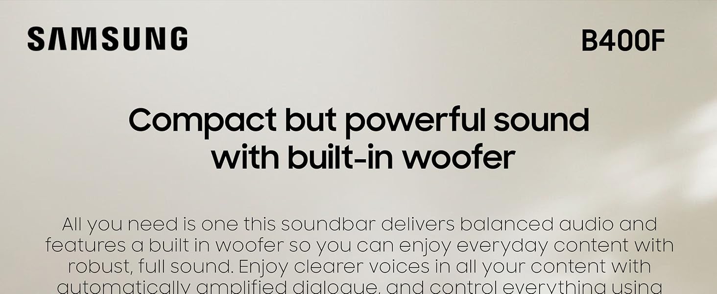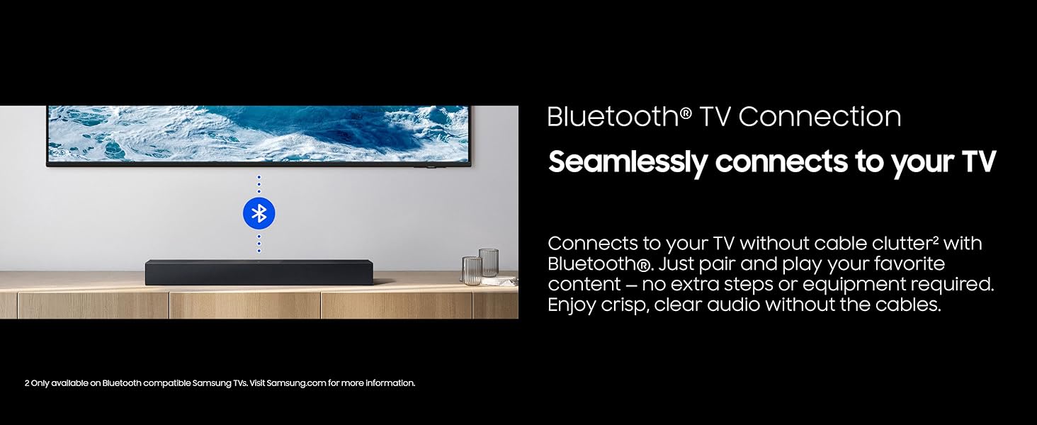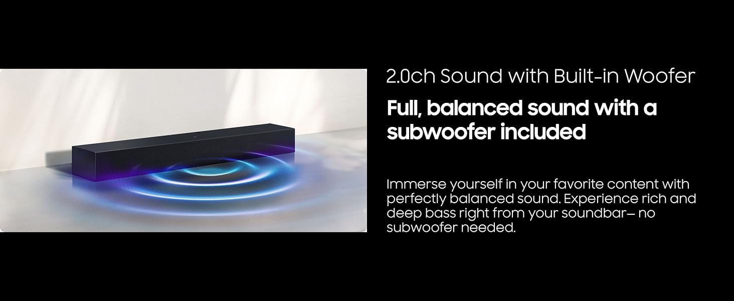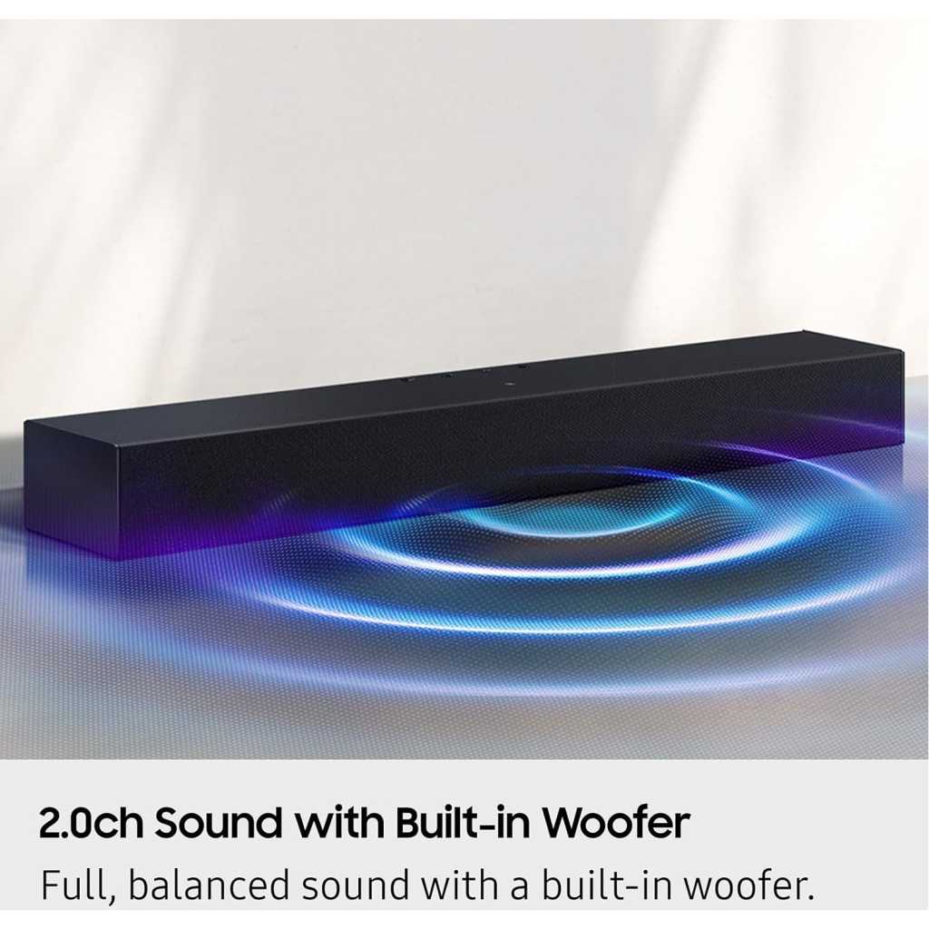 Key Features: FULL, BALANCED SOUND WITH A SUBWOOFER INCLUDED: Immerse yourself in your favorite content with perfectly balanced sound and rich bass from the built-in woofer. ONE REMOTE. TOTAL CONTROL: Use your Samsung TV remote to control key soundbar functions, including power, volume and sound effects. EXPANDS YOUR LISTENING ZONE SO YOU CAN FEEL THE SOUND ALL AROUND YOU: Experience immersive sound that fills the room. Clear audio is projected in all directions so you can feel the action from every angle. SEAMLESSLY CONNECTS TO YOUR TV: Connects to your TV without cable clutter. Just pair and play your favorite content. PICK UP EVERY PIECE OF DIALOGUE: Hear voices more clearly with dialogue automatically amplified so you don’t miss a word. ENJOY YOUR CONTENT – EVEN IF YOUR FAMILY IS ON ‘DO NOT DISTURB’: Lowers the volume and minimizes bass so you can watch TV at any hour without waking up the entire house.