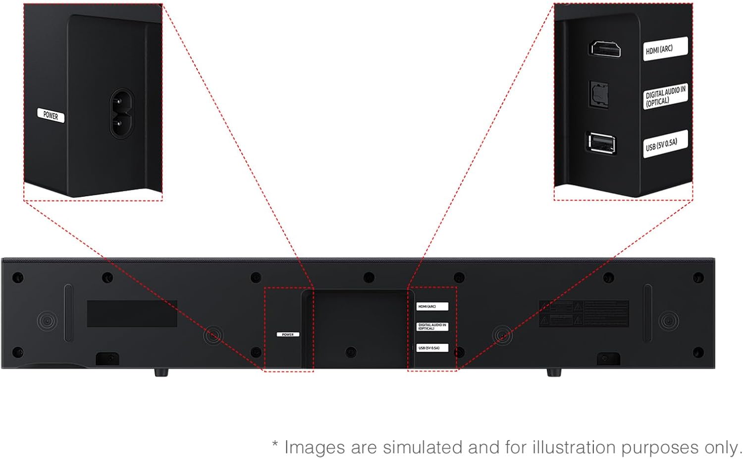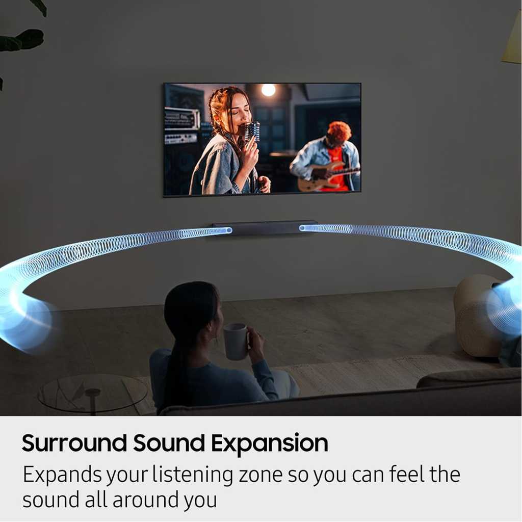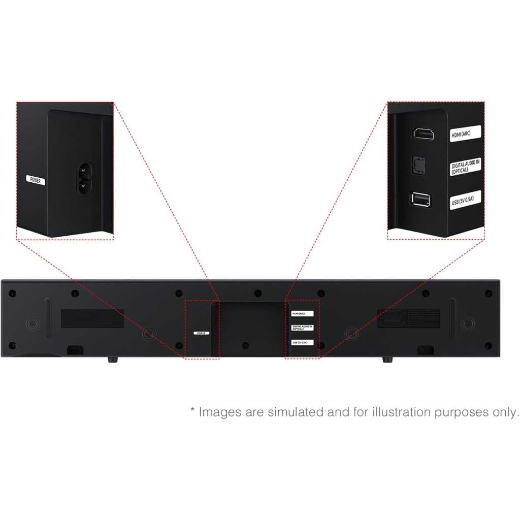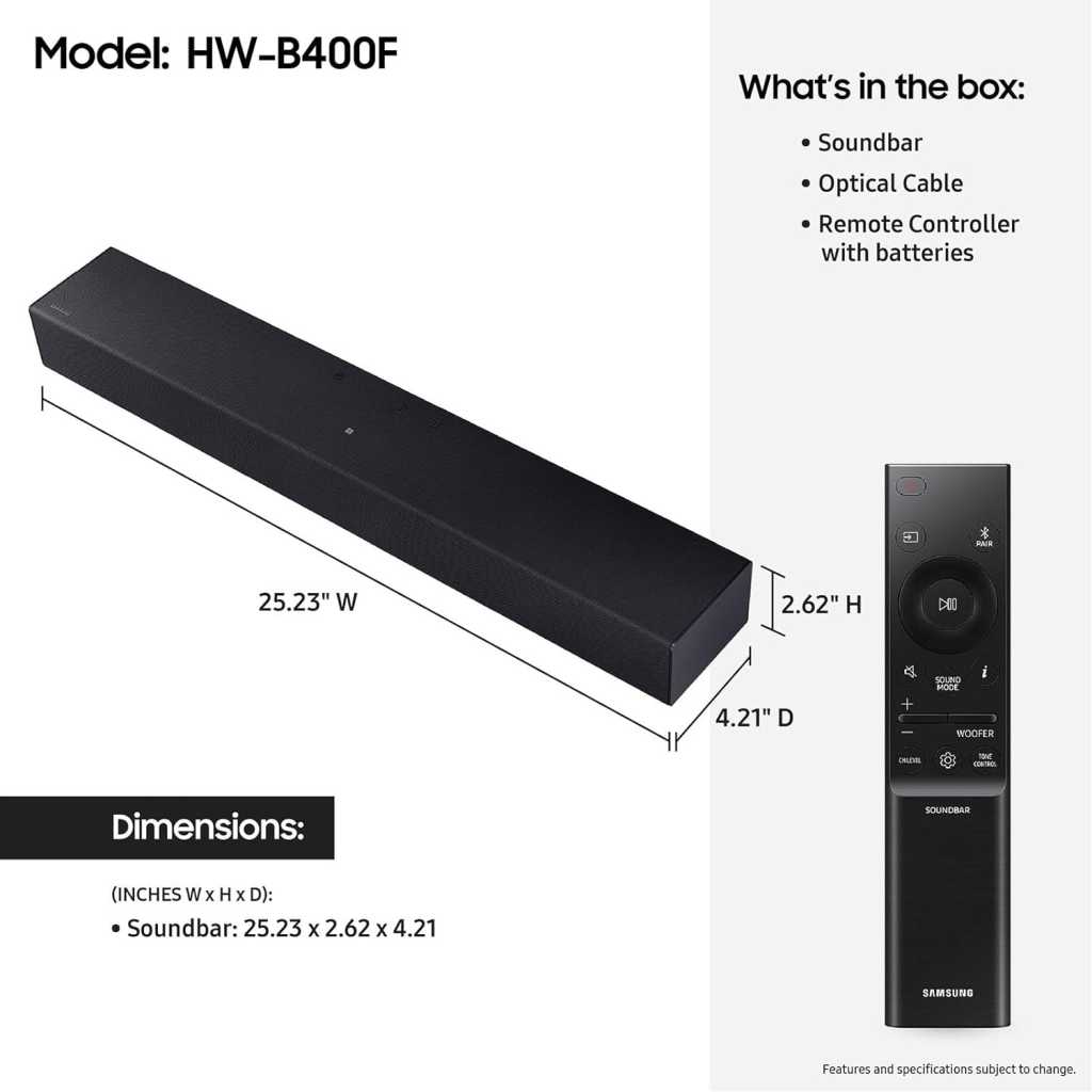 Key Features: FULL, BALANCED SOUND WITH A SUBWOOFER INCLUDED: Immerse yourself in your favorite content with perfectly balanced sound and rich bass from the built-in woofer. ONE REMOTE. TOTAL CONTROL: Use your Samsung TV remote to control key soundbar functions, including power, volume and sound effects. EXPANDS YOUR LISTENING ZONE SO YOU CAN FEEL THE SOUND ALL AROUND YOU: Experience immersive sound that fills the room. Clear audio is projected in all directions so you can feel the action from every angle. SEAMLESSLY CONNECTS TO YOUR TV: Connects to your TV without cable clutter. Just pair and play your favorite content. PICK UP EVERY PIECE OF DIALOGUE: Hear voices more clearly with dialogue automatically amplified so you don’t miss a word. ENJOY YOUR CONTENT – EVEN IF YOUR FAMILY IS ON ‘DO NOT DISTURB’: Lowers the volume and minimizes bass so you can watch TV at any hour without waking up the entire house.