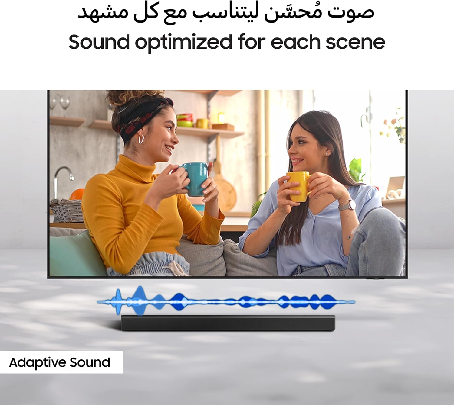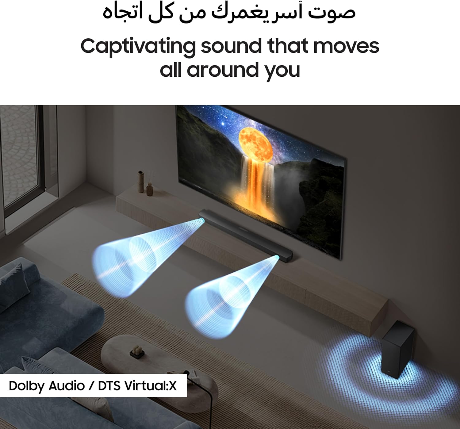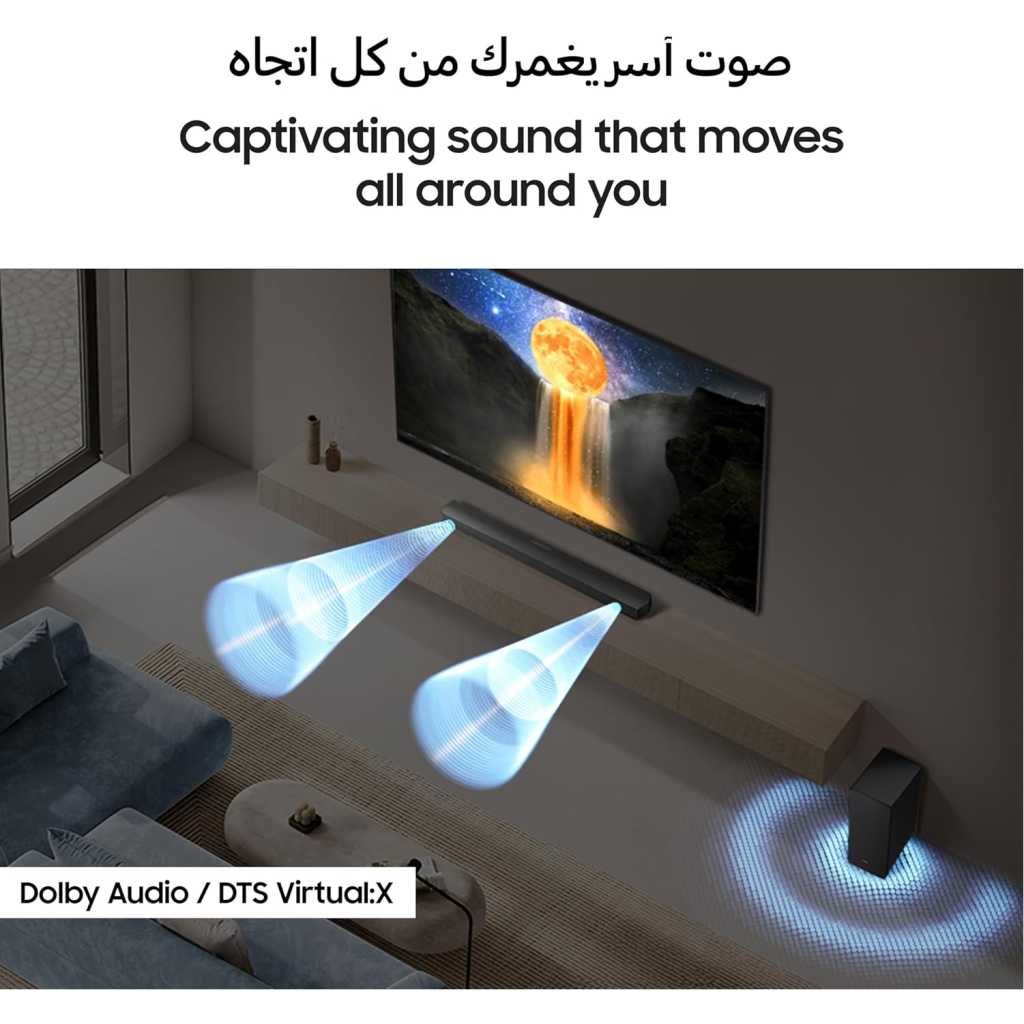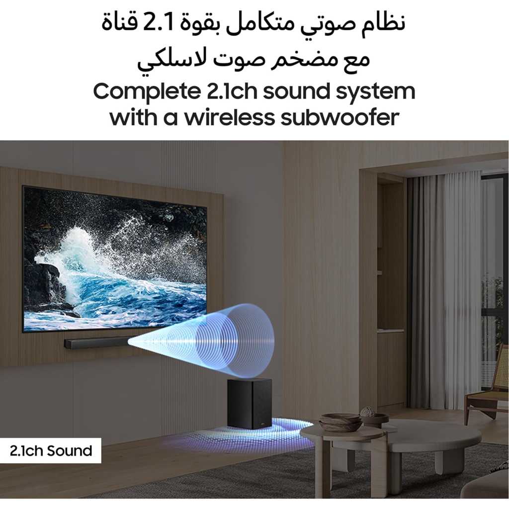 Features Key Features: 2.1ch SOUND: Complete 2.1ch sound system with a wireless subwoofer. Enhance your listening experience with a complete 2.1ch sound system that includes a wireless subwoofer for deep, rich bass. DOLBY AUDIO / DTS VIRTUAL:X: Captivating sound that moves all around you. Dolby Audio and DTS Virtual:X creates spacious 3D surround sound, including the feeling of height, through audio-processing techniques — without the need for up-firing speakers. BASS BOOST: Extra bass, bigger sensations.Enjoy songs and soundtracks with more bass. Bass Boost mode amplifies low frequencies to deliver more thump to your listening experience. ADAPTIVE SOUND: Sound optimized for each scene. Get the optimal listening experience for each scene. Your soundbar recognizes the type of content you’re watching and automatically adapts audio settings to produce clear voices and detailed sounds. BLUETOOTH TV CONNECTION: Connect your Soundbar to TV wirelessly. Are cables and wires getting in the way of your setup? Simply use Bluetooth to connect your soundbar to your TV, and enjoy all your favorite content wirelessly.