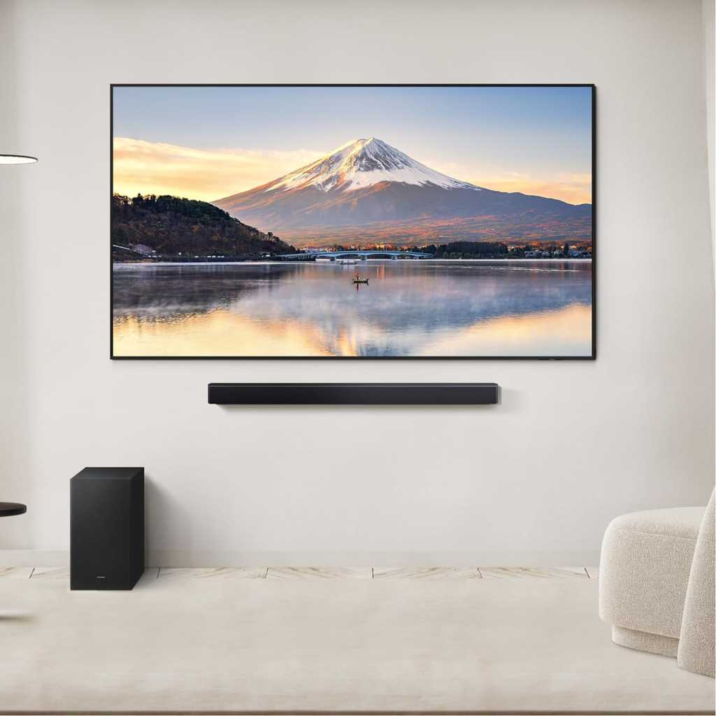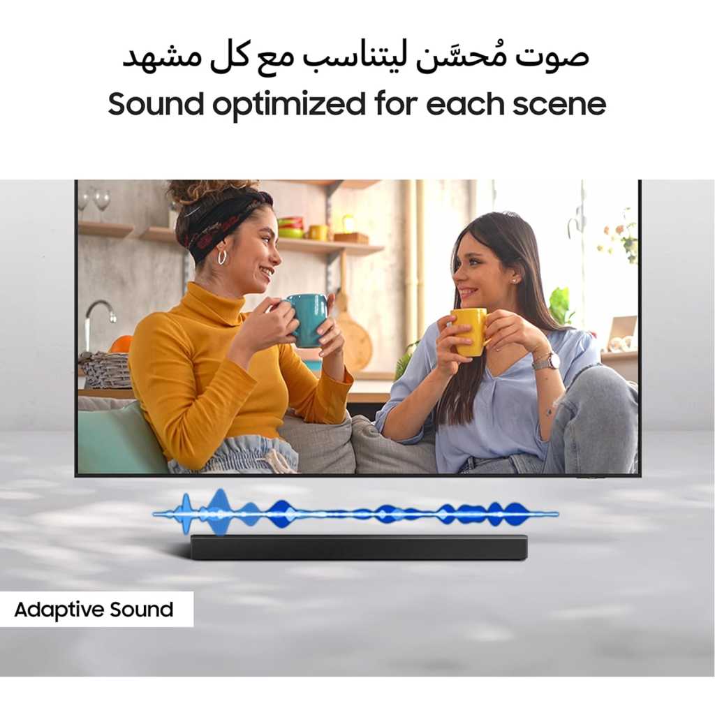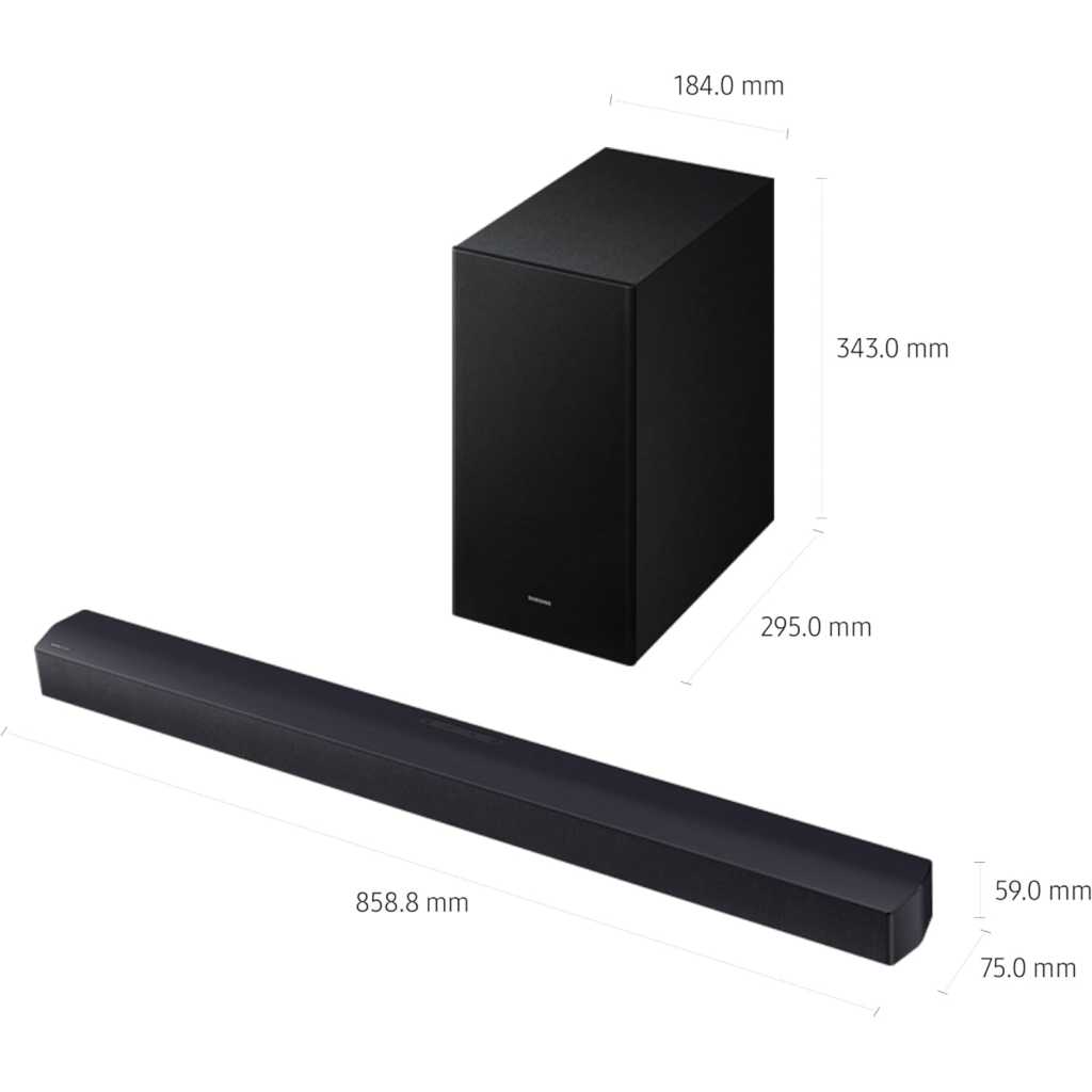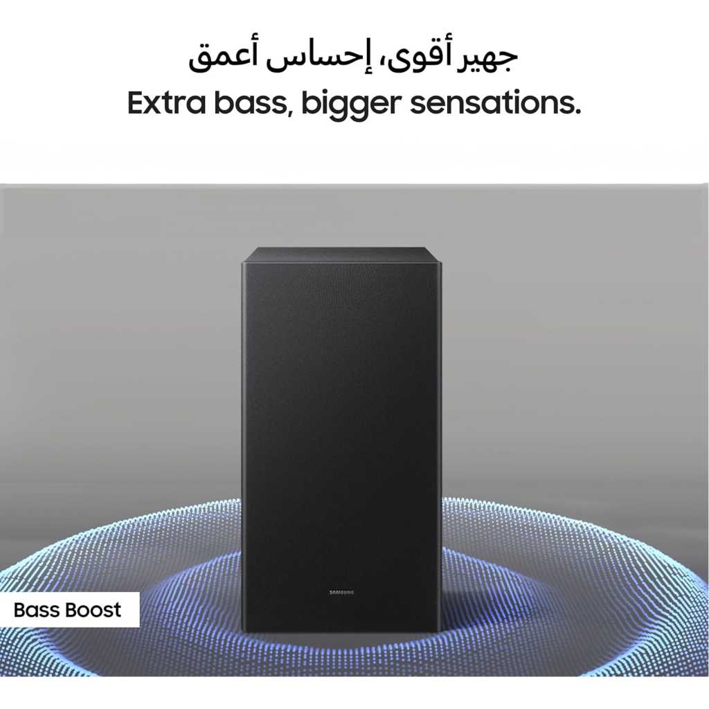 Features Key Features: 2.1ch SOUND: Complete 2.1ch sound system with a wireless subwoofer. Enhance your listening experience with a complete 2.1ch sound system that includes a wireless subwoofer for deep, rich bass. DOLBY AUDIO / DTS VIRTUAL:X: Captivating sound that moves all around you. Dolby Audio and DTS Virtual:X creates spacious 3D surround sound, including the feeling of height, through audio-processing techniques — without the need for up-firing speakers. BASS BOOST: Extra bass, bigger sensations.Enjoy songs and soundtracks with more bass. Bass Boost mode amplifies low frequencies to deliver more thump to your listening experience. ADAPTIVE SOUND: Sound optimized for each scene. Get the optimal listening experience for each scene. Your soundbar recognizes the type of content you’re watching and automatically adapts audio settings to produce clear voices and detailed sounds. BLUETOOTH TV CONNECTION: Connect your Soundbar to TV wirelessly. Are cables and wires getting in the way of your setup? Simply use Bluetooth to connect your soundbar to your TV, and enjoy all your favorite content wirelessly.