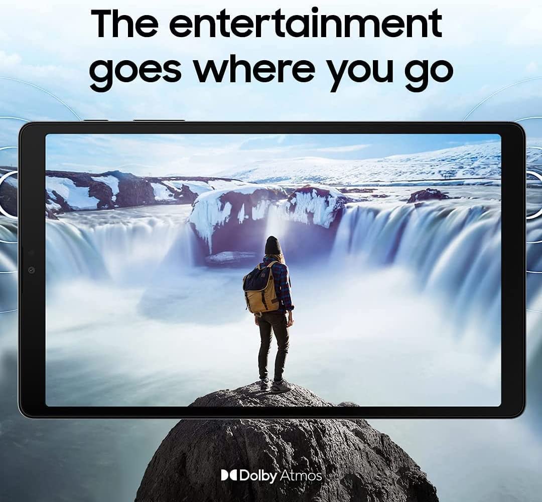 Meet the device your whole family will love. Samsung Galaxy Tab A7 Lite is the tablet that’s made to be shared. With its compact 8.7″ screen, Galaxy Tab A7 Lite is perfectly sized for entertainment on the go. Its sturdy metal frame is built to be brought along from the living room to your beach vacation, or wherever you want to take it. Plus, with a powerful processor for fast streaming and plenty of storage for your favorite files, Galaxy Tab A7 Lite simplifies entertainment needs for everyone under your roof. Protecting your tablet is a breeze with the included Galaxy Tab A7 Lite Book Cover. With its slim design and easy installation, your Book Cover provides worry-free protection for your tablet from the occasional ding or fumble from accident-prone family members. The flexible hinge lets you prop the tablet up for hands-free viewing options, so you won’t miss a moment of your favorite sitcom, even from your couch. Don’t sacrifice style for convenience. Galaxy Tab A7 Lite gives you both in a slim package. Measuring a thin 8.0mm and weighing 371g, this highly portable tablet packs easily into your bag and doesn’t hold you back with heaviness. Choose between a sleek Gray or a Silver finish. Don’t sacrifice style for convenience. Galaxy Tab A7 Lite gives you both in a slim package. Measuring a thin 8.0mm and weighing 371g, this highly portable tablet packs easily into your bag and doesn’t hold you back with heaviness. Choose between a sleek Gray or a Silver finish. The Galaxy Tab A7 Lite camera is ready to capture and share your moment. Whether you’re looking to capture stunning portraits or breathtaking scenery, this device has you covered. With 8MP main camera your memories stay vivid, bright, and clear. Less bezel means more room for a bigger, 22.05cm (8.7″) display on a conveniently compact tablet. Enjoy an impromptu private screening in the park or binge watch in bed with dual speakers in landscape orientation that deliver rich, stereo sound.