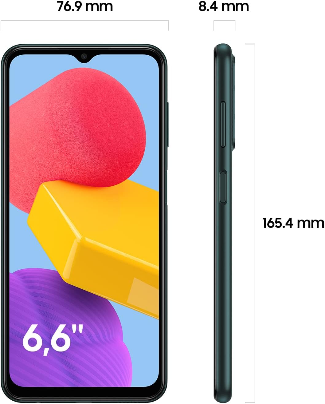 Key Features: Samsung Galaxy M13 – 6.6″ 6GB RAM 128GB ROM 50MP 6000mAh – Deep Green. Network Technology: GSM / HSPA / LTE SIM: Dual SIM (Nano-SIM, dual stand-by) Size: 6.6 inches Platform: OS Android 12, One UI Core 4.1 Internal: 128GB 6GB RAM Main Camera: Triple 50 MP Comms: WLAN Wi-Fi 802.11 a/b/g/n/ac, dual-band, hotspot Bluetooth: 5.0, A2DP, LE USB: USB Type-C 2.0 Battery: Type Li-Po 6000 mAh, non-removable