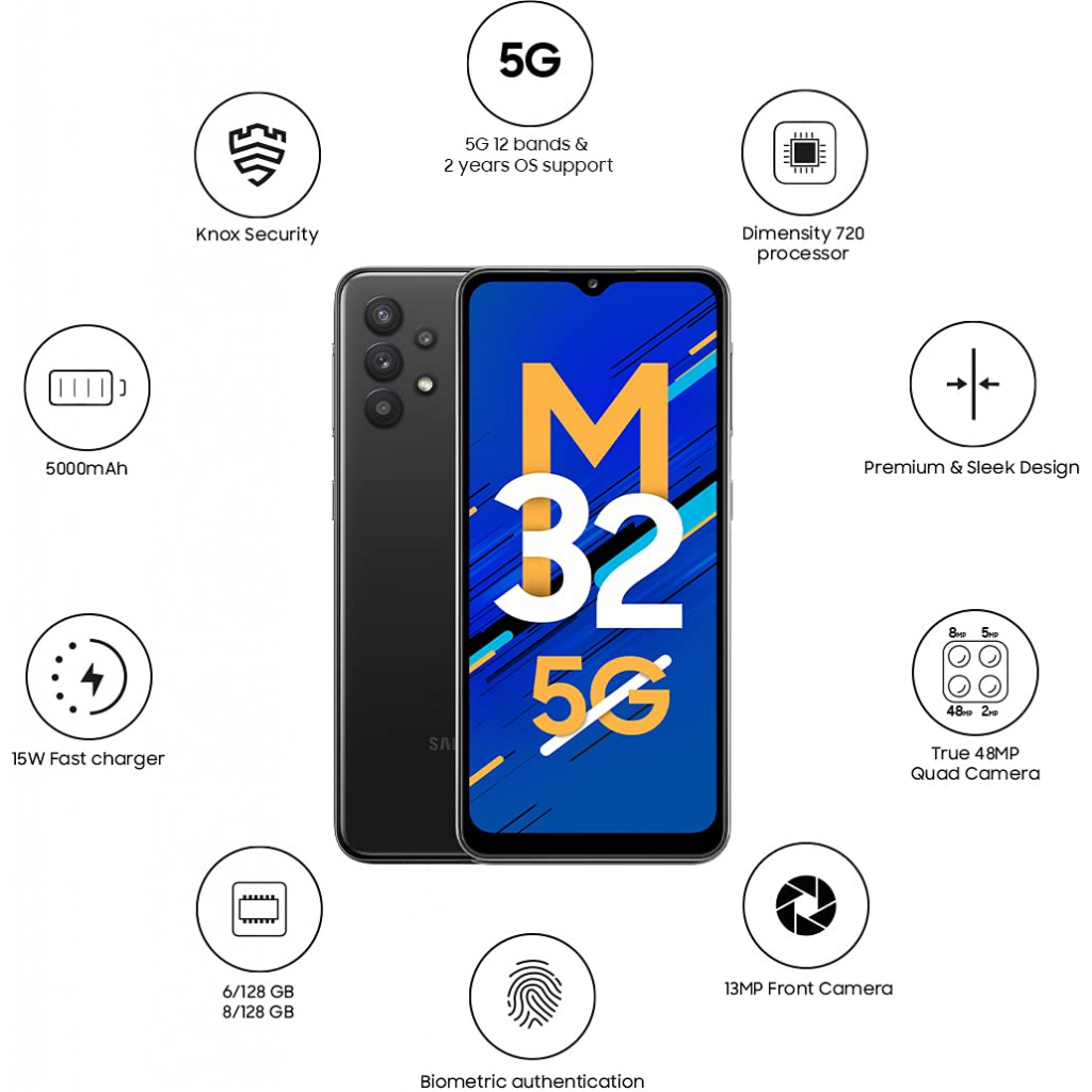 A richer viewing experience through spectacularly vivid colourExpand your view to the 6.4-inch Infinity-U Display of Galaxy M32 and see what you’ve been missing. Thanks to FHD+ Super AMOLED technology, your everyday content looks its best—sharp, crisp and clear. Plus, Real Smooth keeps the view smooth, whether you’re gaming or scrolling. Stylish prism pattern that shinesThe Galaxy M32 has a smooth, yet patterned surface with slight lines that catch the prism light beautifully at various angles. With a choice of black, white or blue, the design is balanced and sturdy. A quad camera for better image quality and fewer missed momentsGo ultra high-res with a 64MP Main Camera for crisp, clear photos throughout the day. Expand the viewing angle with Ultra Wide Camera. Customise focus with Depth Camera or get closer to the details with Macro Camera. Ultra Wide Camera, ultra wide momentsSimilar to human eyesight, the 8MP Ultra Wide Camera sees the world with a 123-degree viewing angle, adding more perspective to everything you shoot. Macro Camera pays attention to the tiny detailsGet in close with the 2MP Macro Camera and discover details you may have missed otherwise. It applies natural bokeh effect to your pictures, allowing your subject to stand out from the background. Bring the focus to the front with Depth CameraThe 2MP Depth Camera lets you adjust the depth of field in your photos. With a simple touch, you can easily fine-tune the background blur behind your subject for high-quality portrait shots that truly stand out. Front Camera, attention-grabbing selfiesWith the Galaxy M32 20MP Front Camera and bokeh effect, it’s easy to snap stunning selfies that feature more you and less background. Power that keeps you goingStay ahead of the day with a battery that won’t slow you down. The 5,000mAh (typical)¹ battery lets you keep doing what you do, for hours on end. And with up to 25W of Super Fast Charging, Galaxy M32 gets back to full power. Storage and speed you can count onThe Galaxy M32 combines Octa-core processing power with up to 8GB/8GB of RAM for fast and efficient performance of the task at hand. Enjoy 128GB of internal storage or add even more space with up to 1TB microSD card. Don’t settle for less when it comes to security Built into the phone’s hardware and software from the start, Samsung Knox protects your phone from the minute it’s turned on. Offering multi-layered security, it defends your most sensitive information from malware and malicious threats.