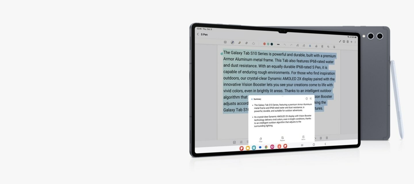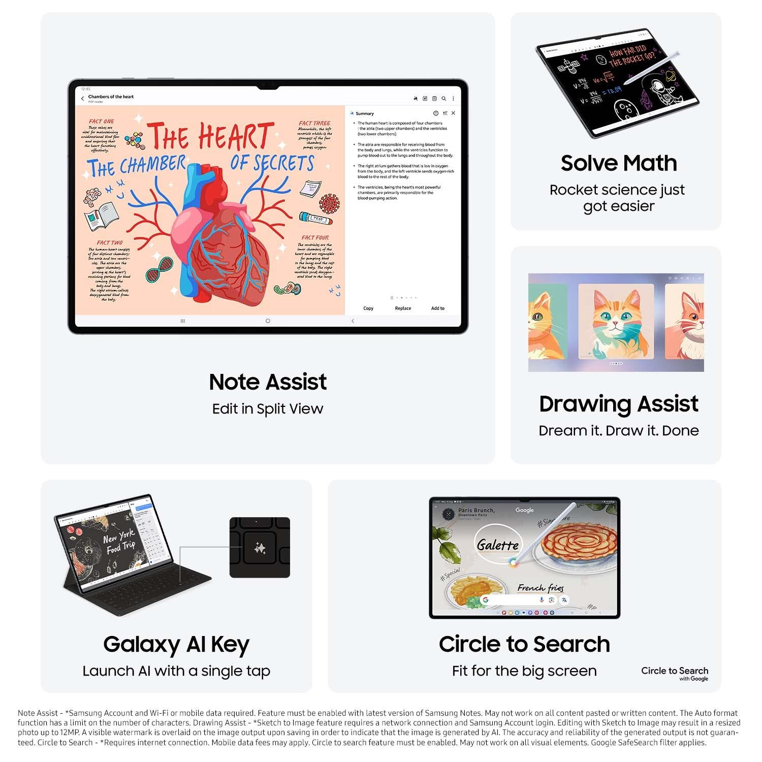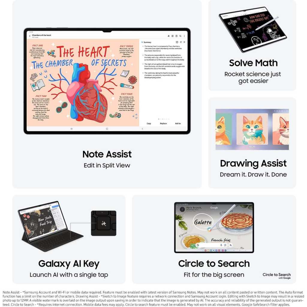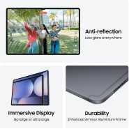 Samsung Galaxy Tab S10 Ultra-Silver 14.6″ 256GB, 12GB RAM, AI-Powered Productivity, Dynamic Display, Peak Performance, Peak Performance, 14.6″ (2960 x 1848) display, MediaTek MT6989 Quad core processor (3.3GHz), 12GB RAM, 256GB storage, Wi-Fi 7 (802.11 be), 1 x USB-C 3.0 port, Up to 16 hours battery life, Android OS With so many awesome AI abilities, you’ll want to take Galaxy Tab S10 Ultra and Tab S10+ everywhere — and you can with a slim design Make your mark with new S Pen designs in Light Blue to accent the Moonstone Gray finish, or Beige to complement the all-new Platinum Silver . As one of the only IP68 water-and dust-resistant tablets on the market, Galaxy Tab S10 Series confidently goes where others can’t.⁴ For bumps along the way, enhanced Armor Aluminum frames have things covered. You’ve seen Galaxy AI, but not like this. Simplify your life with groundbreaking AI features for notetaking and image generation on the big screens of Tab S10 Series. Quickly search for just about anything — all without switching apps — using Circle to Search with Google. Simply circle, highlight or tap an image or text and get results on the spot. Record lecture or meeting audio and let Note Assist with Galaxy AI do the hard work of transcribing, organizing and even summarizing notes for you. It’s like having your very own AI assistant. Turn your sketches into instant works of art using Sketch to Image with Galaxy AI. Select from art styles to create fully realized images, or add an extra touch to your favorite photos Dive into the intense colors, deep blacks and unbelievable brilliance of Dynamic AMOLED 2X displays . Galaxy Tab S10 Series makes experiences feel larger than life