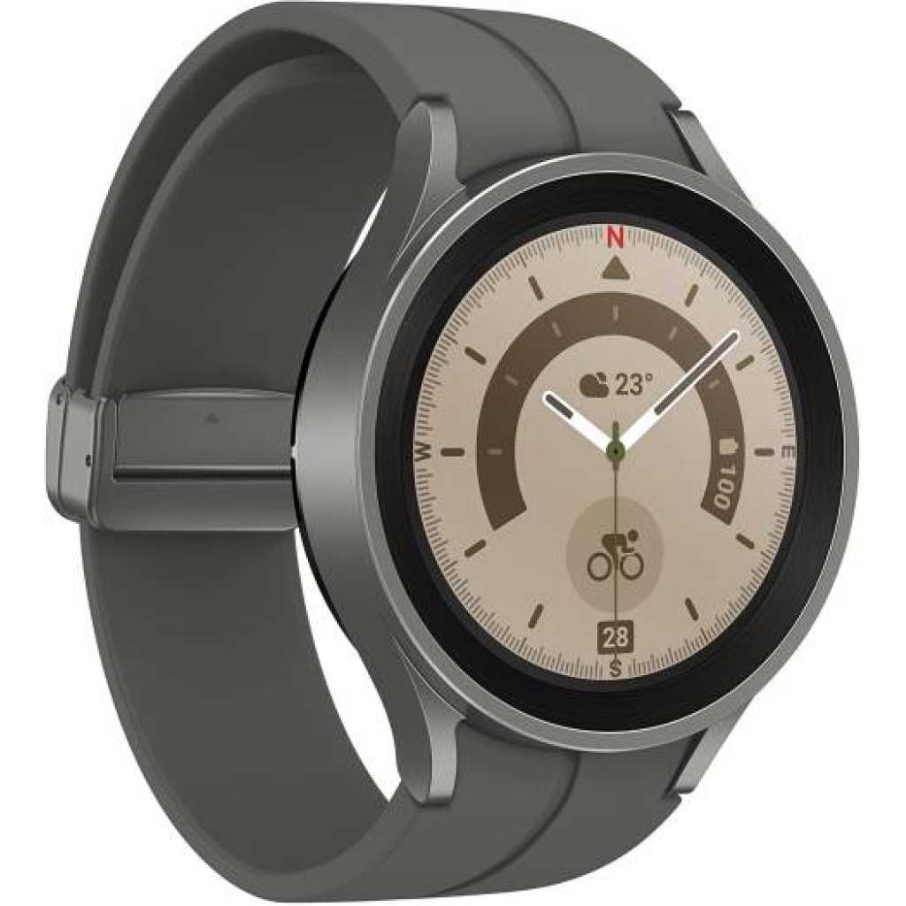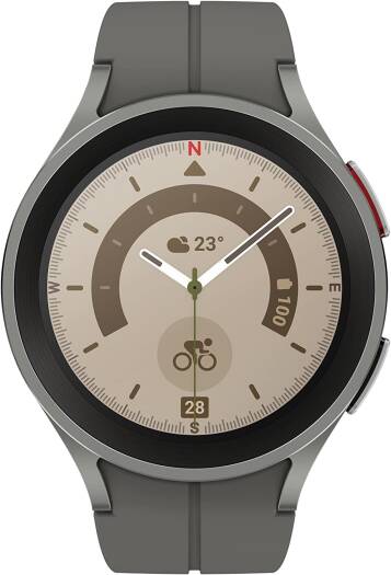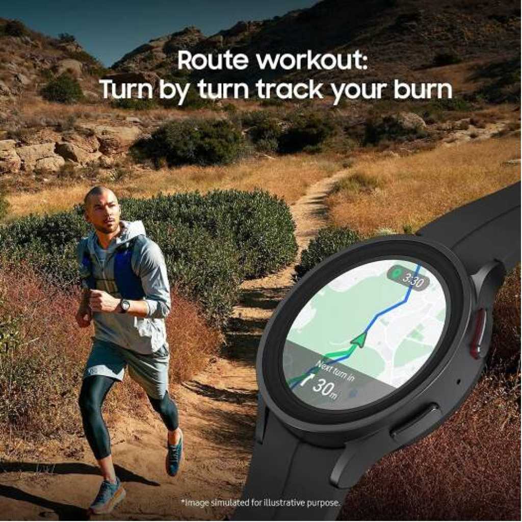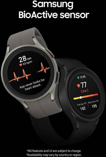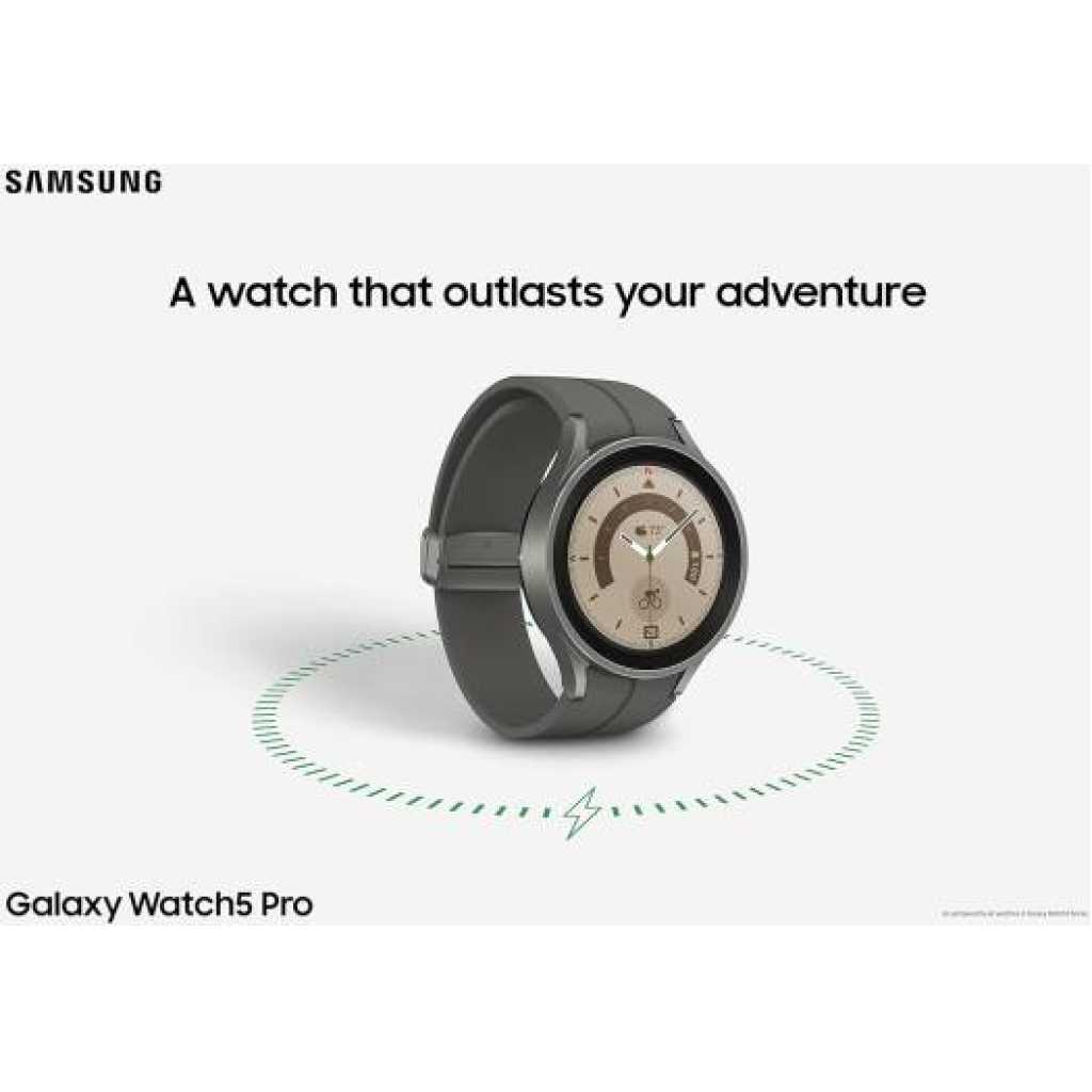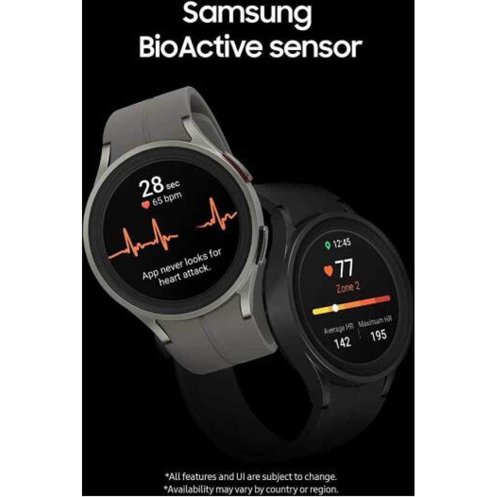 Key Features: ADVANCED SLEEP COACHING: Manage your overall sleep quality with an advanced sleep tracker that detects and analyzes sleep stages while you rest; Plus, Advanced Sleep Coaching helps you develop better sleep habits by analyzing your sleep patterns* BODY COMPOSITION ANALYSIS (BIA)**: Galaxy Watch5 Pro provides body composition data right on your wrist; On your own schedule, you can now get readings on body fat, skeletal muscle, body water, basal metabolic rate and Body Mass Index (BMI) IMPROVED SENSOR ACCURACY: Stay up to date on your wellness; Get an accurate heart rate thanks to an improved, curved Samsung BioActive Sensor that gets closer to your skin*** AUTO WORKOUT TRACKING: Make the most of every adventure with Auto Workout Tracking — from running to rowing to swimming — automatically in just minutes, and manually tracking more than 90 exercises, including complex activities like HIIT**** IMPROVED BATTERY & GALAXY CONNECTED EXPERIENCE: With its improved battery life, it’s built to keep going on lengthy adventures in the great outdoors;***** Do more on your adventures with synced Galaxy devices that work in perfect harmony****** SAPPHIRE CRYSTAL GLASS & TITANIUM CASE: From hiking to rock climbing, its 2x stronger,***** sapphire crystal glass display is ready for intense activities in rough outdoor environments; And with its super-tough titanium case, you can train worry-free GPS ROUTE TRACKING & TRACK BACK: All-new Route Tracking lets you follow GPX-format routes on your Watch; Use Track Back to help you back to the place you started from; Stay on track thanks to voice- or vibration-guided turn-by- turn navigation*******