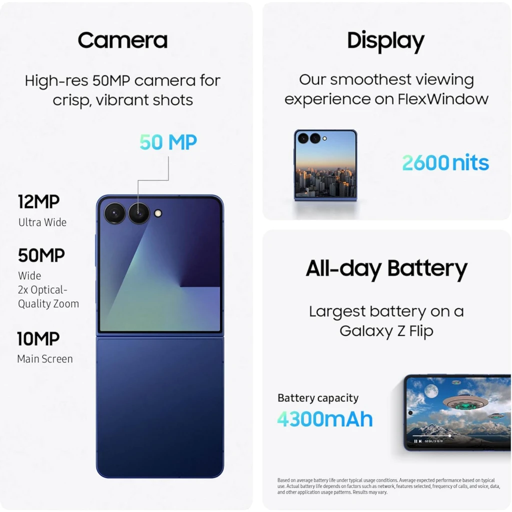 Introducing our thinnest, toughest, and most advanced Galaxy Z Flip ever—unparalleled beauty and performance that perfectly fits your lifestyle and your budget. The stunning edge-to-edge exterior display is housed in a durable body that’s slimmer whether closed or open. Enjoy richer, more detailed selfies that you can preview on the larger Cover Display. Capture the details of every moment with the high-resolution 50MP camera and let the next-generation ProVisual Engine do the rest. It enhances color and detail for greater clarity, highlighting skin tones and textures. You can also use custom filters based on AI learning to add finishing touches and make your photos unique. The Flip’s advanced processor powers everything from the battery to the display, ensuring it runs as fast as you need, for as long as you need it. Whether you’re streaming, gaming, or editing your latest video. The 4300mAh battery and mDNIe technology are optimized by the powerful processor, so this Flip is ready for hours of uninterrupted entertainment.