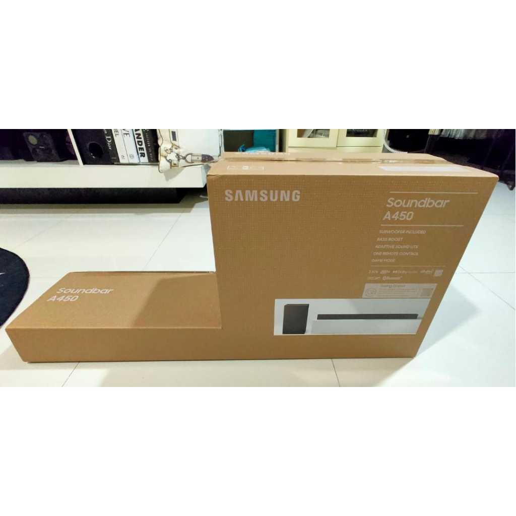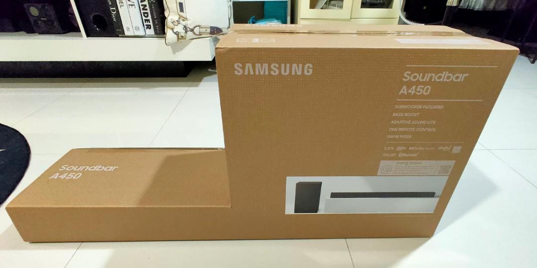 Key Features: Samsung HW-A450 2.1ch Soundbar with Dolby Audio – Black. SUBWOOFER INCLUDED – Wireless subwoofer is included so you can enjoy deep bass right out of the box All-in-one. Mounting Type: Freestanding, Wall Mount.Speaker maximum output power:300 watts.Total USB ports:1 BASS BOOST – Give your bass an instant boost with the push of a button on the soundbar ADAPTIVE SOUND LITE – Enhanced audio tracking for your content in real-time, with technology that equalizes background music and consistent volume control BLUETOOTH TV CONNECTION – Set up is a breeze. Easily connect your soundbar to your TV by connecting wirelessly GAME MODE – Boost your gaming experience with perfectly synced directional audio that moves with the action on-screen and crosstalk cancellation that minimizes distractions ONE REMOTE – Streamline control of both your Samsung TV and soundbar with just the Samsung TV remote WIRELESS SURROUND SOUND COMPATIBLE – Turn your soundbar into a complete surround sound system with optional rear Samsung speakers in a few simple steps without the mess of wires