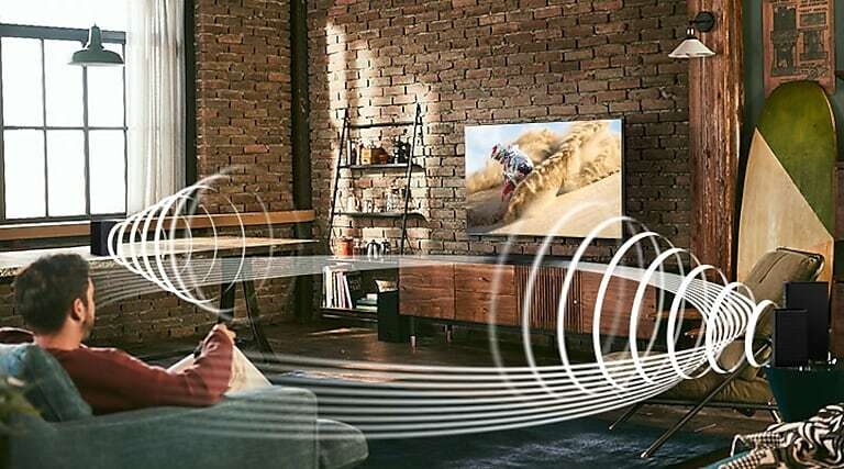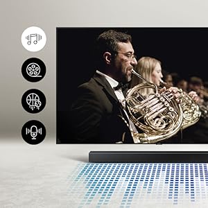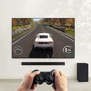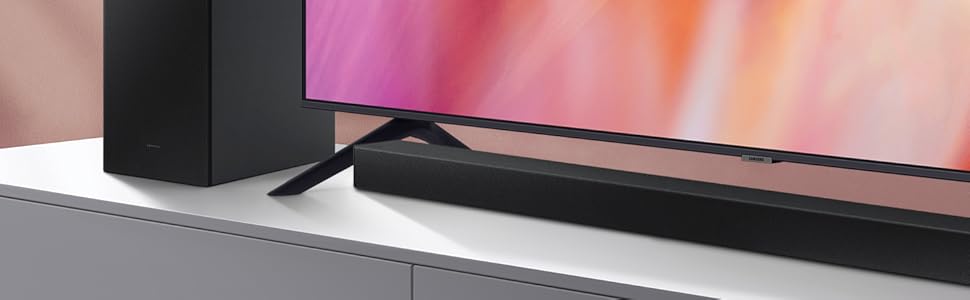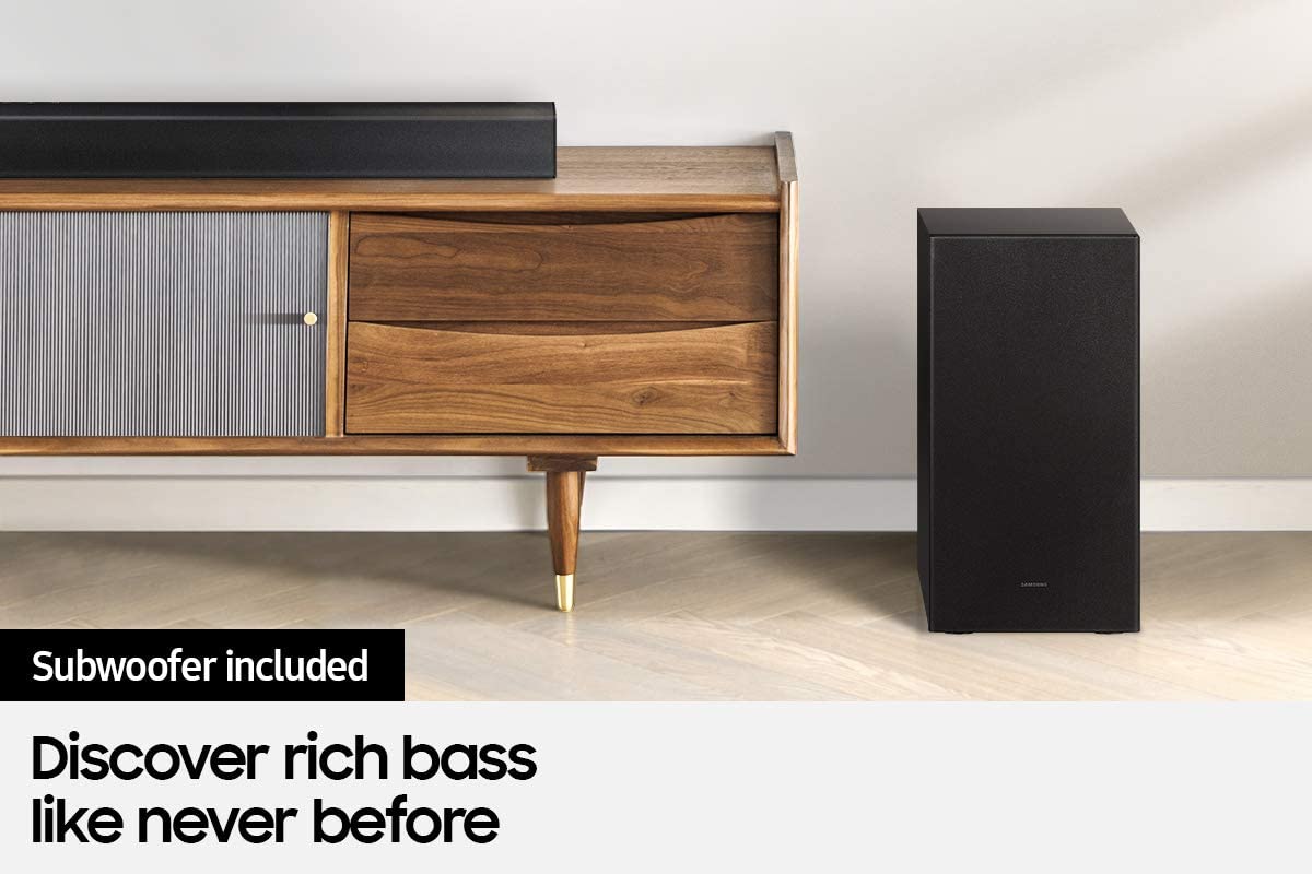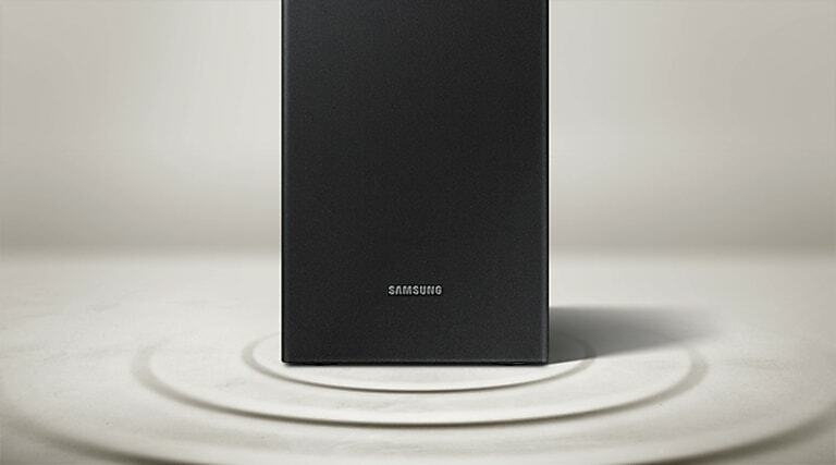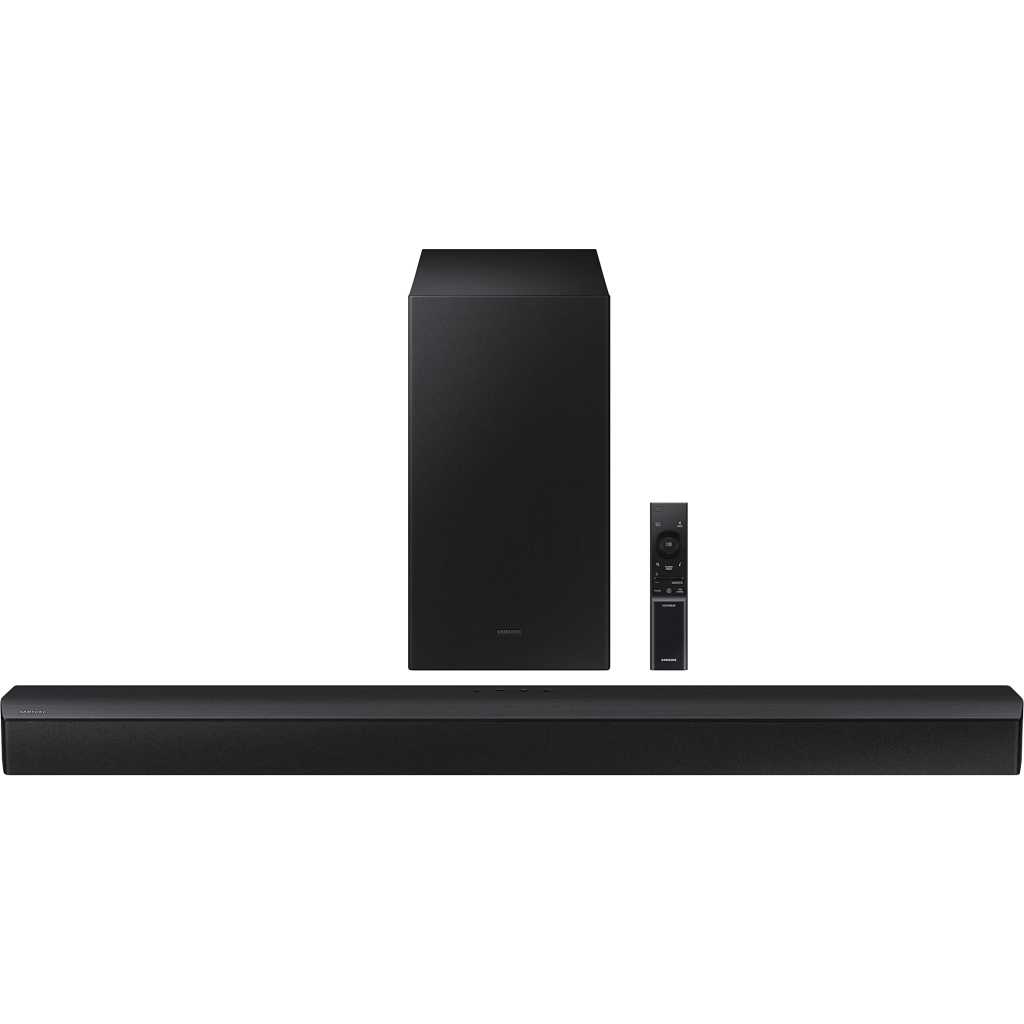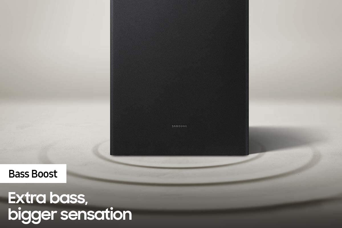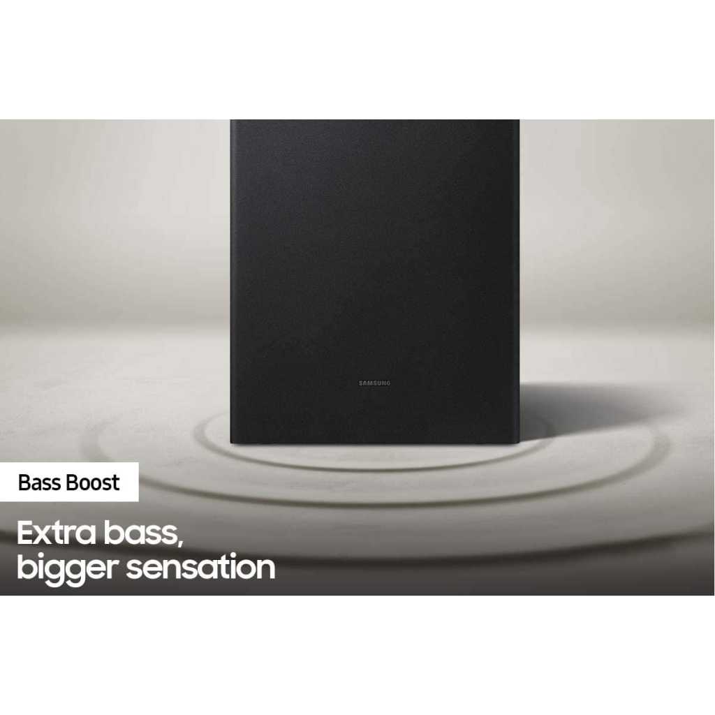 Samsung HW-A450 2.1ch Soundbar with Dolby Audio – Black. Bluetooth® TV connection connect via Bluetooth and enjoy your favorite content without unsightly cables. Deep, rich bass Wireless SubwooferFeel the action and the beat of the music with the rich bass from the wireless subwoofer. The soundbar detects what you’re watching and automatically optimizes the sound setting for the best entertainment experience. Whether it’s a loud sporting event or a drama with quiet dialogue, you can count on Soundbar T450 to provide clear sound for enhanced TV viewing. One remote is all you need. Control key soundbar functions like power, volume, and even sound effects with the Samsung TV remote — right from your TV. Connect your console to the soundbar to boost your gaming experience. Optimize sound, while offering clear directional sound to gain the advantage. The Wireless Surround Kit* lets you expand your soundbar to a complete surround sound system easily and without the mess of wires.